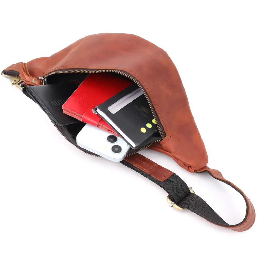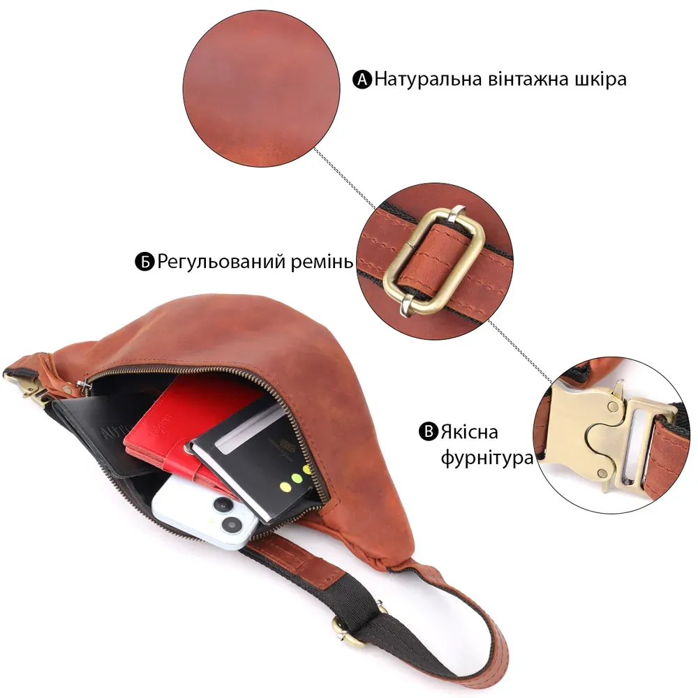 Ця сумка зручна у повсякденному використанні: основне відділення на блискавці, та додаткова кишеня для дрібниць, регульований ремінь зі шкіри та текстилю. Ви можете носити її як на грудях, так і на поясі, що особливо зручно у міському ритмі чи подорожах.