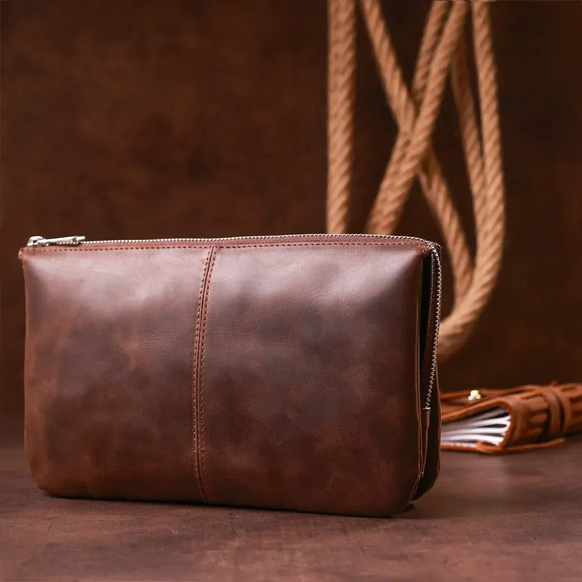 Розкішна вінтажна барсетка для чоловіків виконана з італійської натуральної шкіри. Модель ідеально лежить у руці. Аксесуар має велику кількість різноманітних кишень та відділень. У барсетці ви зможете носити все необхідне на кожен день. Відмінною особливістю є те, що барсетка досить довго гасає і залишається в ідеальному стані. Згодом на такій шкірі залишаються потертості, що надає аксесуару ще більшого шарму. Якщо ви виберете таку барсетку в подарунок для чоловіка однозначно не помилитеся. Модель упакована у фірмовий повстяний мішок.