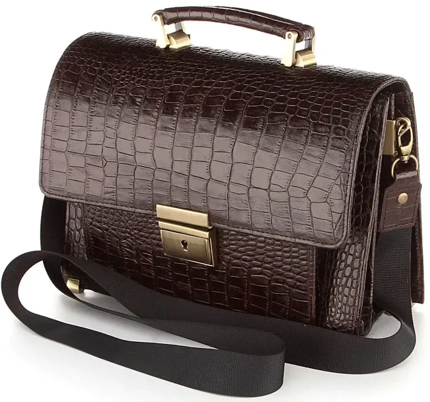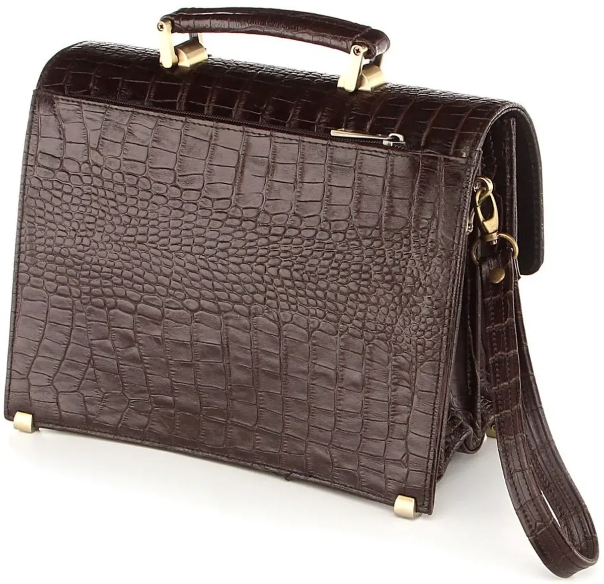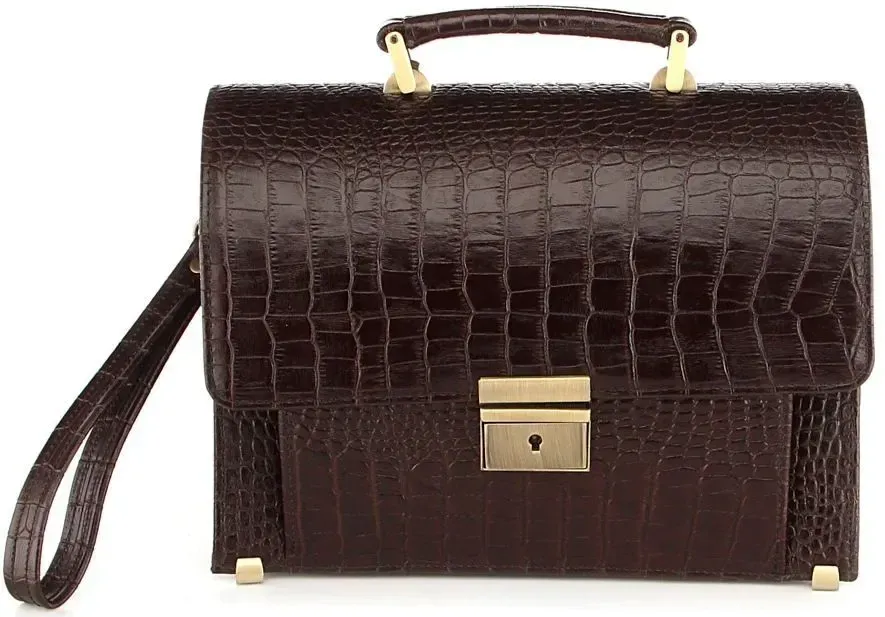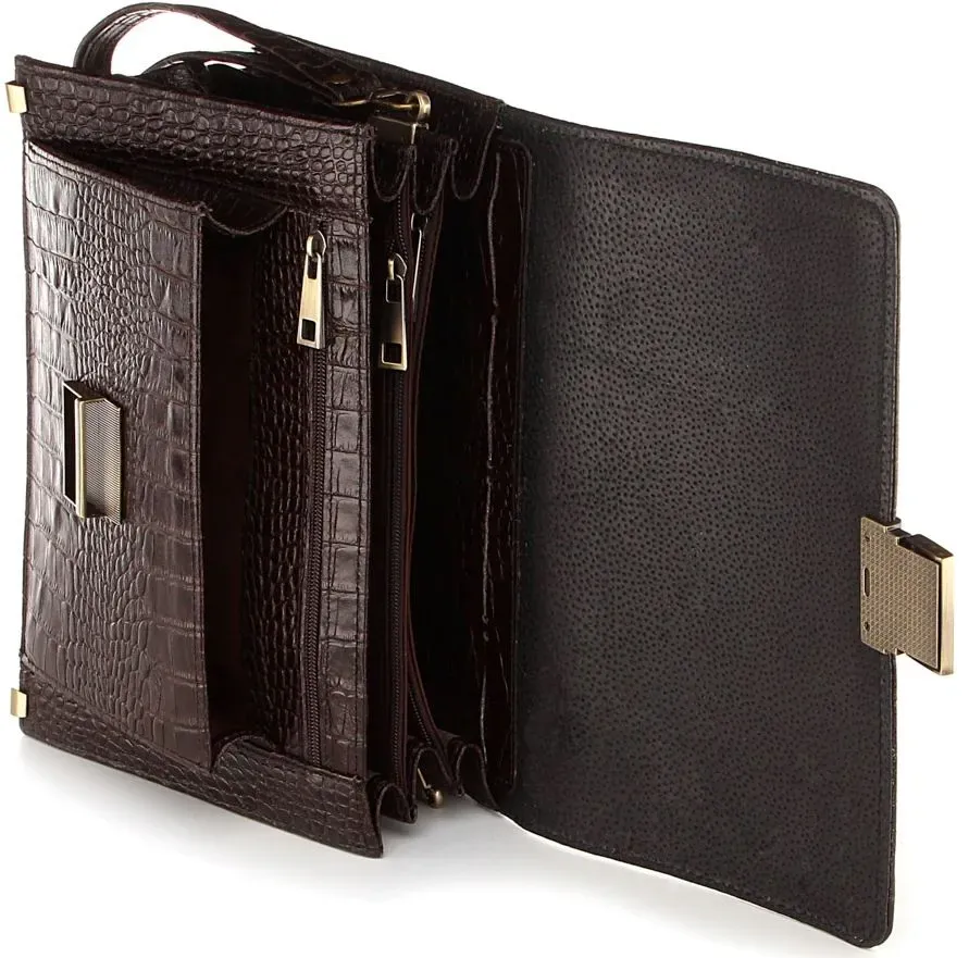 Большая мужская барсетка с плечевым ремнем. Аксессуар выполнен из натуральной кожи с фактурой под крокодила коричневого цвета. Кроме как через плечо барсетку можно носить на запястье при помощи кожаного ремня-петли. Цвет фурнитуры желтый. На задней внешней стороне расположено отделение на молнии.