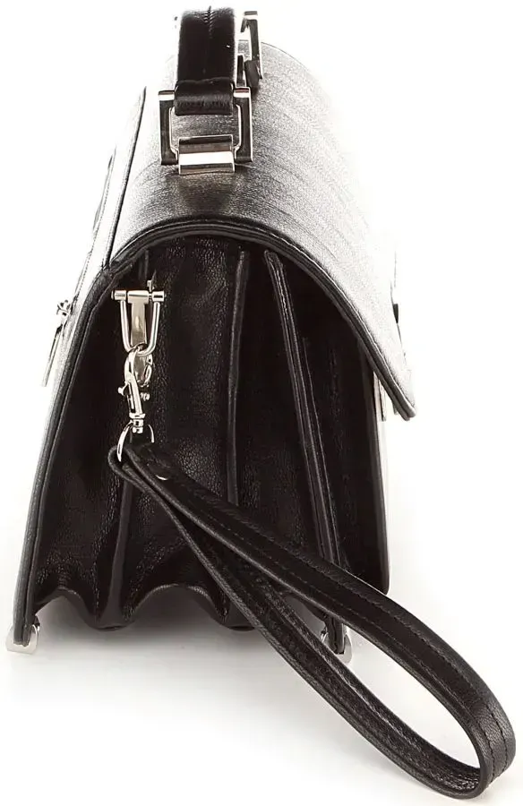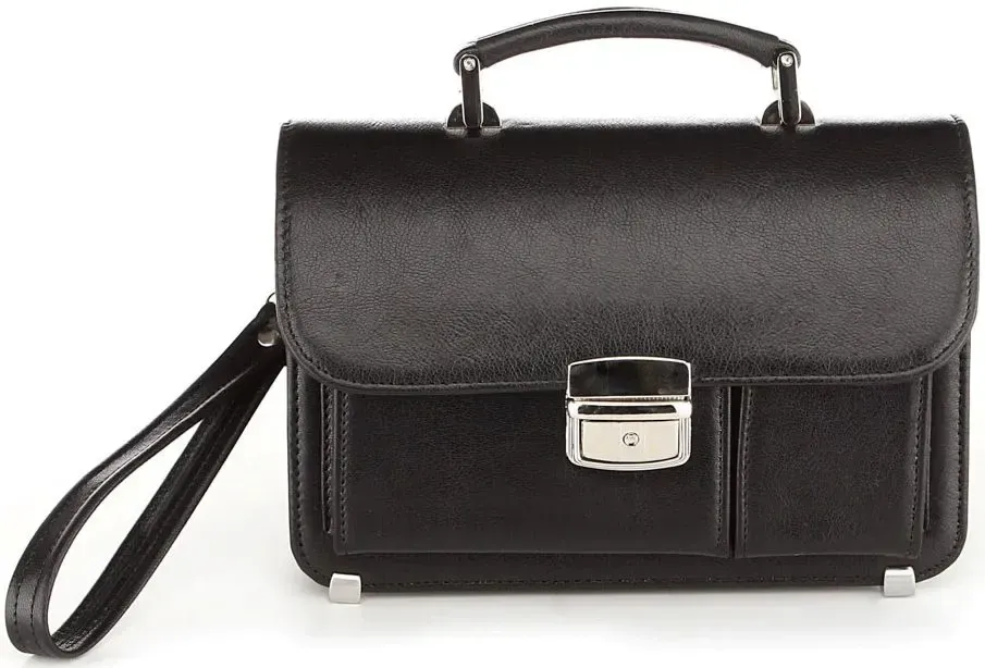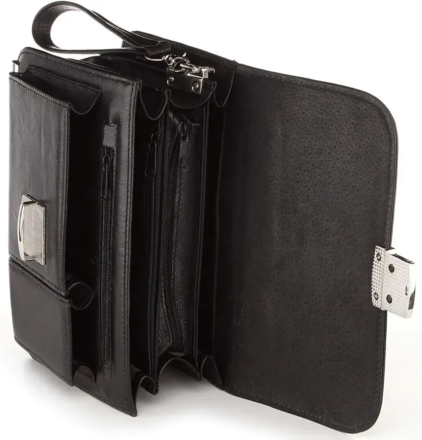Многофункциональная мужская кожаная барсетка черного цвета. Цвет фурнитуры: серебро. Благодаря кожаной ручке аксессуар удобно носить в руке. Кроме этого барсетку можно носить на запястье при помощи кожаного ремня-петли. На задней внешней стороне изделия расположен карман на молнии.