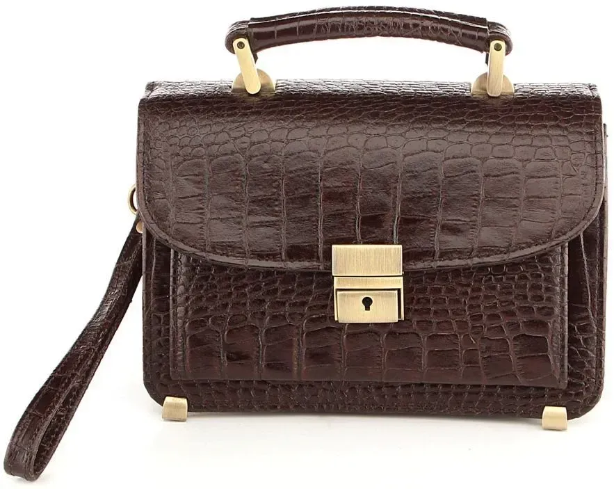 Стильная, компактная барсетка из натуральной кожи с фактурой под крокодила. Несмотря на свои весьма небольшие размеры аксессуар достаточно функционален и вместителен. Цвет фурнитуры: желтый. Такая порсетка обязательно понравится мужчине, которые придерживается делового стиля одежды.