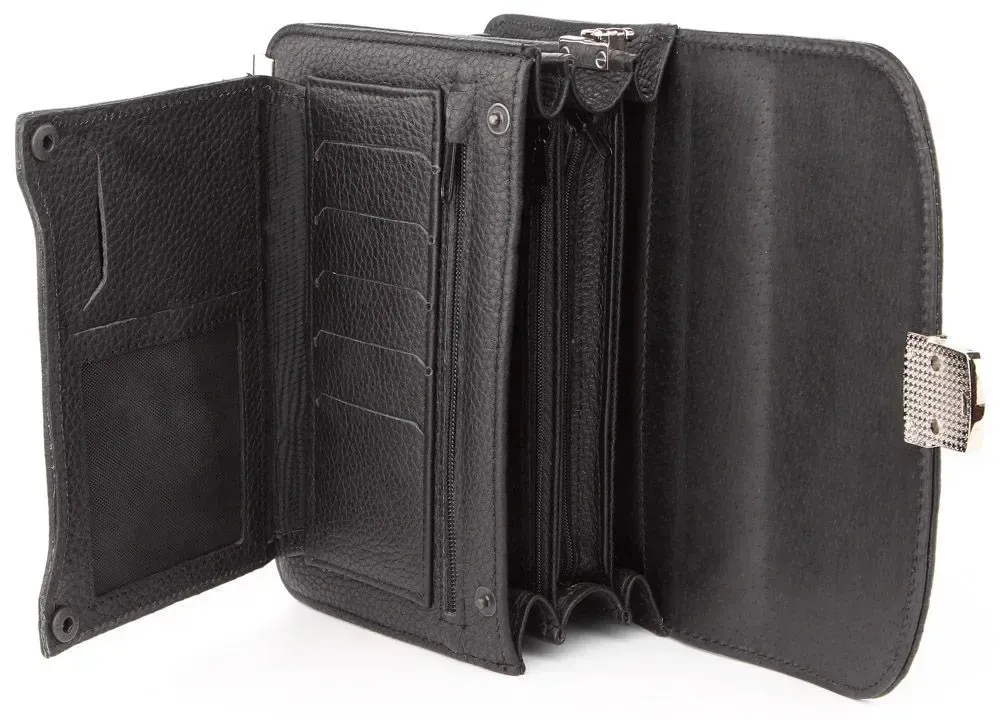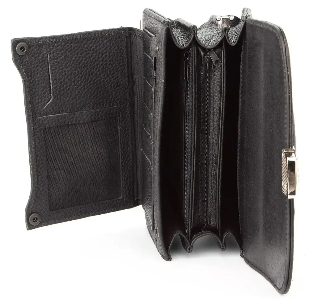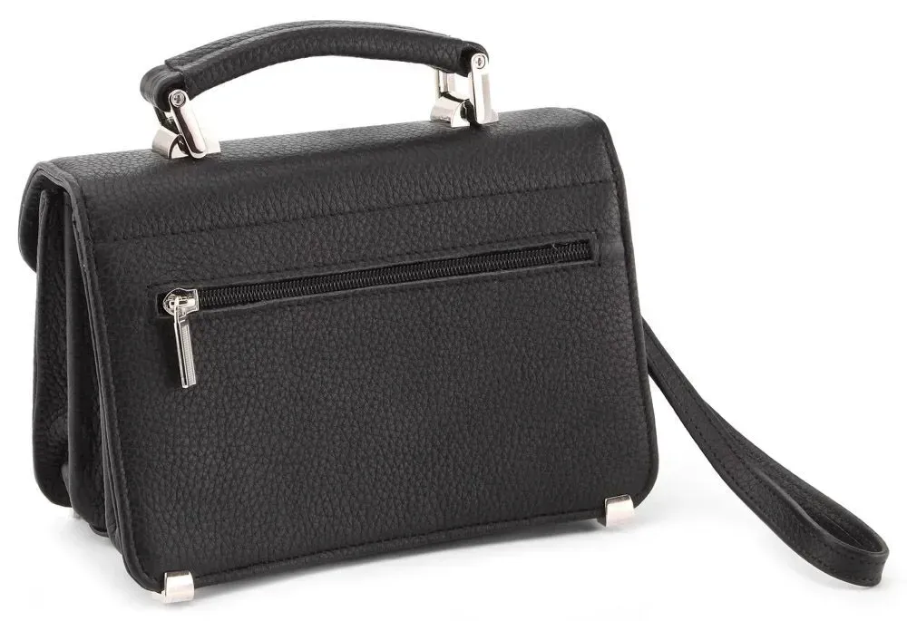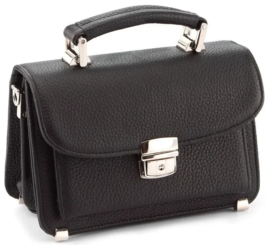 Небольшая кожаная мужская барсетка черного цвета. Несмотря на свои весьма компактные размеры барсетка очень вместительная и функциональная. Цвет фурнитуры: серебро. На задней внешней стороне аксессуара находится отделение на молнии. Барсетка носится в руке или на запястье (в комплекте удобный кожаный ремень-петля). На дне аксессуара расположены металлические ножки, которые защищают изделие от механического повреждения.