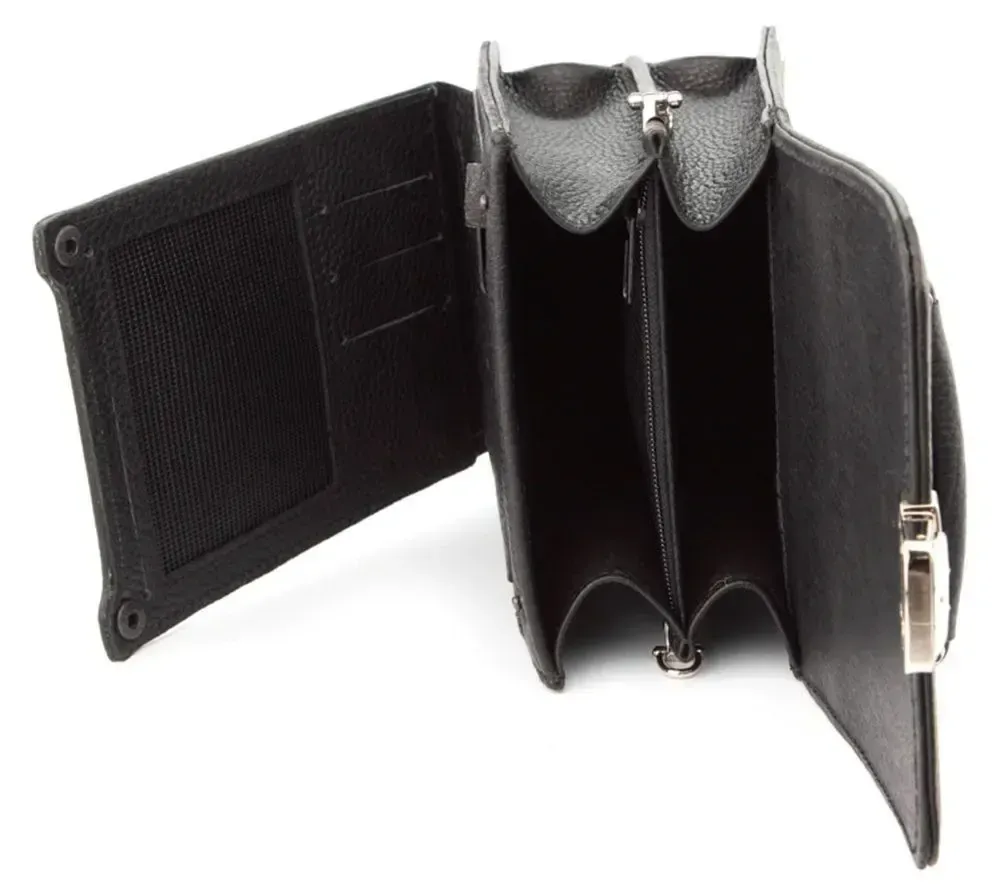 - под клапаном: 11 отделений для пластиковых карточек или визиток, отделение под сеточкой и карман на молнии.