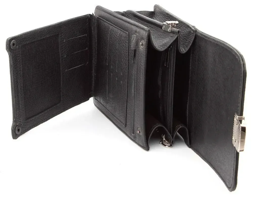 Высококачественная мужская барсетка вертикального формата. Аксессуар выполнен из фактурной (зернистой) натуральной кожи черного цвета. Цвет фурнитуры: серебро. Барсетку можно носить: в руке, на запястье и через плечо. На задней внешней стороне находится отделение на молнии. Дно изделия надежно защищено от повреждений металлическими ножками. При необходимости барсетку можно закрыть на ключ, который имеется в комплекте поставки.