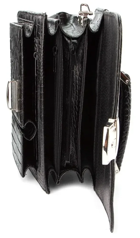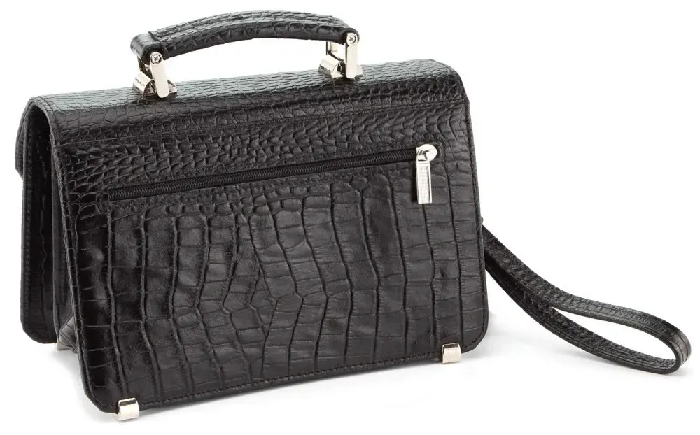 Добротная, современная мужская барсетка. Аксессуар выполнен из натуральной кожи с фактурой под крокодила. Изделия из такой кожи чрезвычайно популярны в этом году. Цвет фурнитуры: серебро. На задней внешней стороне аксессуара расположено отделение на молнии.