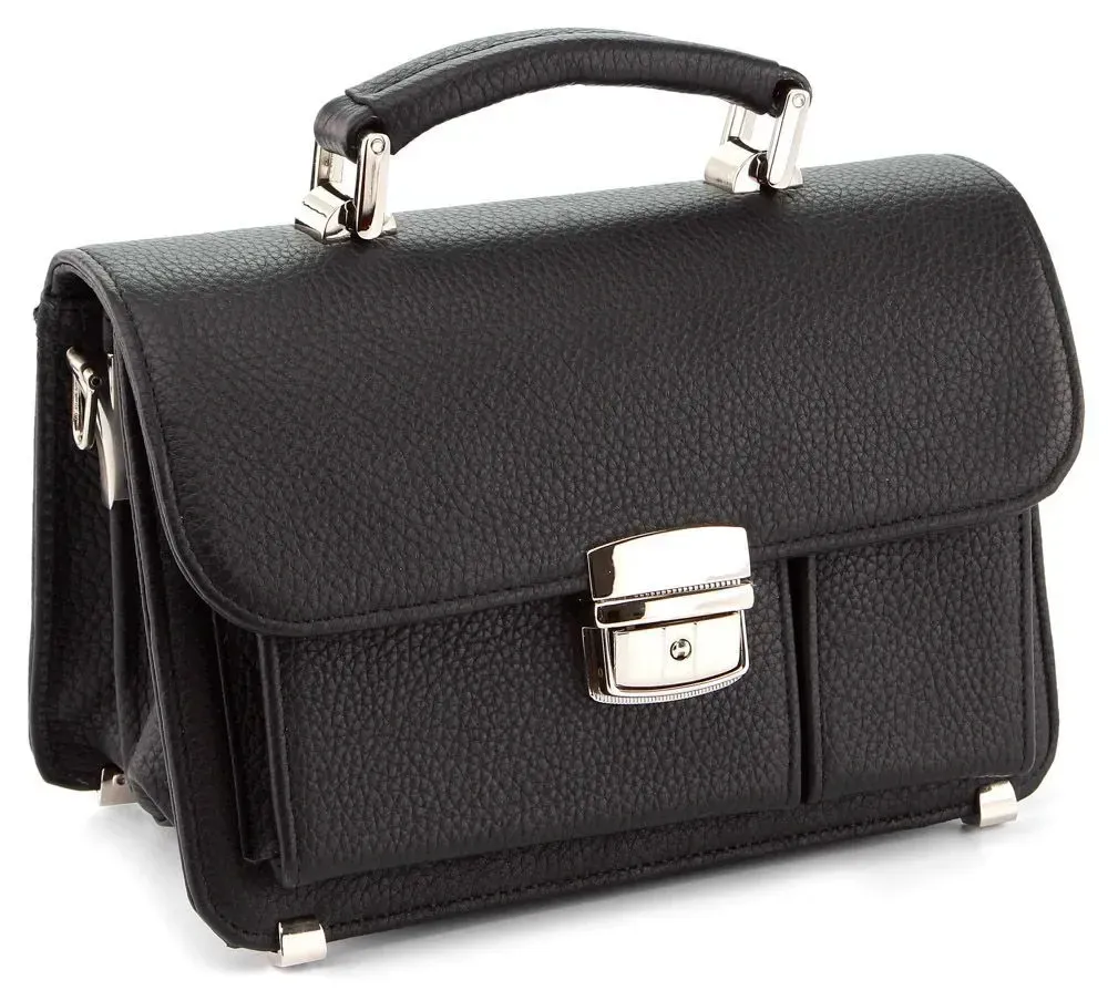 Удобная кожаная мужская барсетка средних размеров. Аксессуар выполнен в черном цветовом решении из кожи флотар. Барсетка закрывается при помощи защелки, которая в свою очередь закрывается на ключ. Носить аксессуар можно в руке, а также на запястье. Цвет фурнитуры: серебро. Дно изделия защищают металлические ножки. Мужская барсетка из натуральной кожи – это отличное решение для подарка мужчине, предпочитающему деловой стиль одежды.