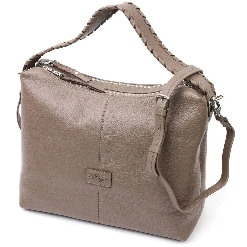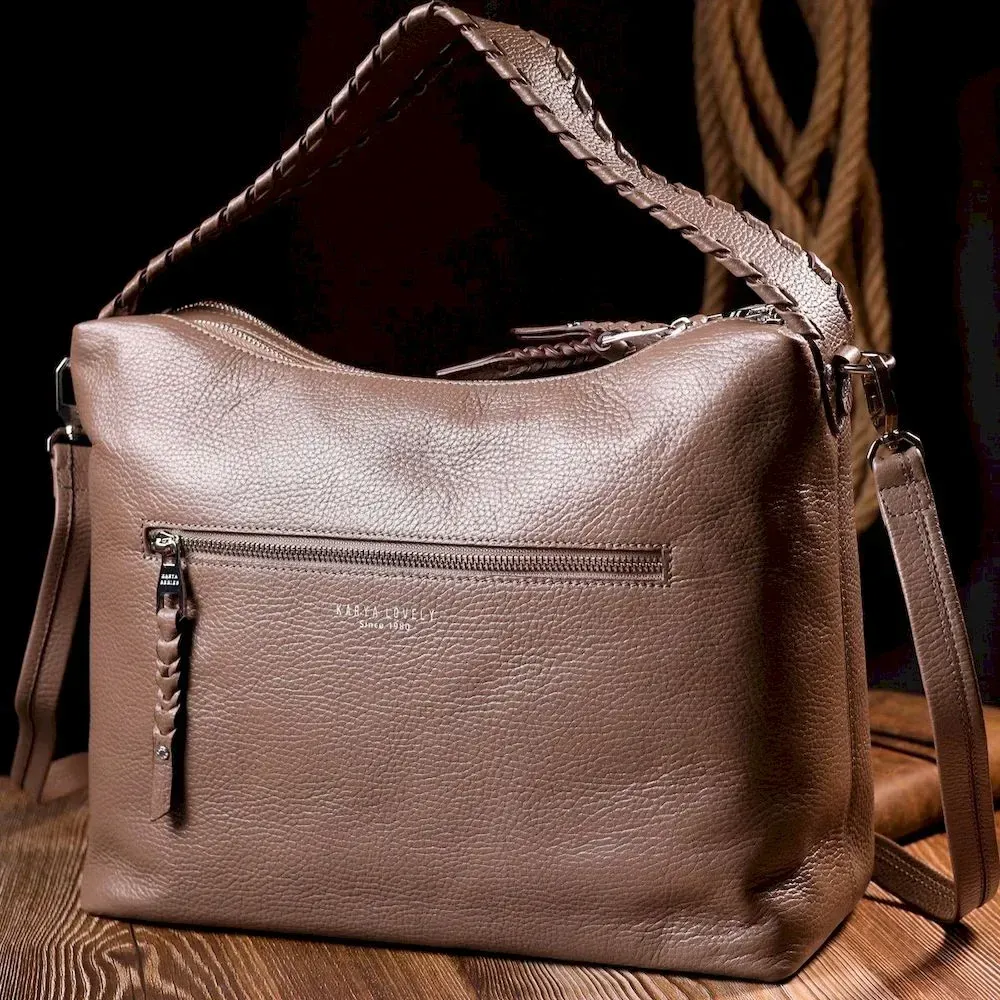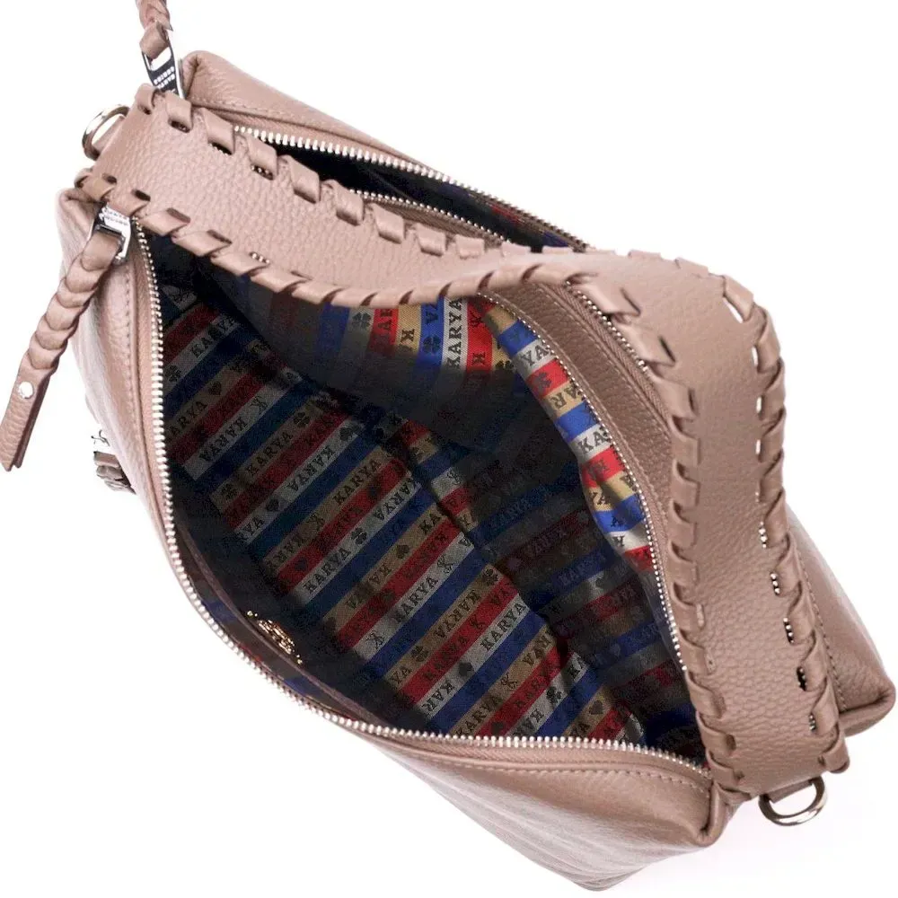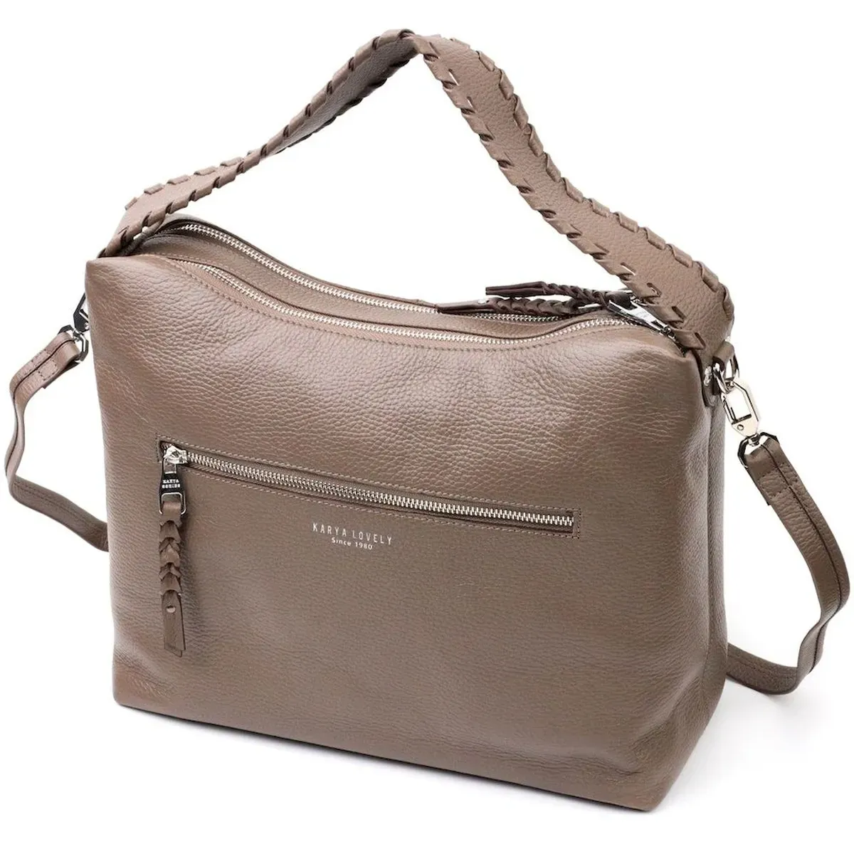 Містка та зручна жіноча сумка з натуральної зернистої шкіри, красивого коричневого кольору. Сумка практична та функціональна в експлуатації, якісна фурнітура сріблястого кольору не тільки доповнює стильний дизайн сумки, але й захищає виріб. Аксесуар упакований у фірмовий текстильний мішок Karya. Сумка з натуральної шкіри завжди буде чудовим подарунком будь-якій жінці