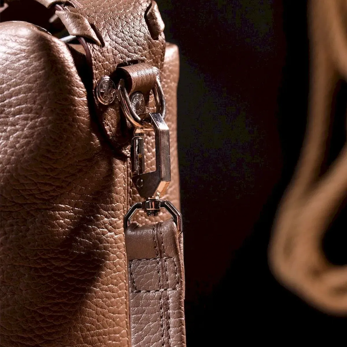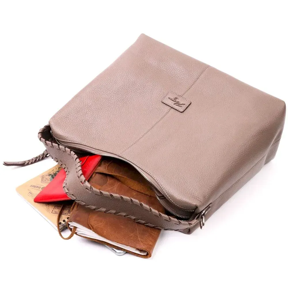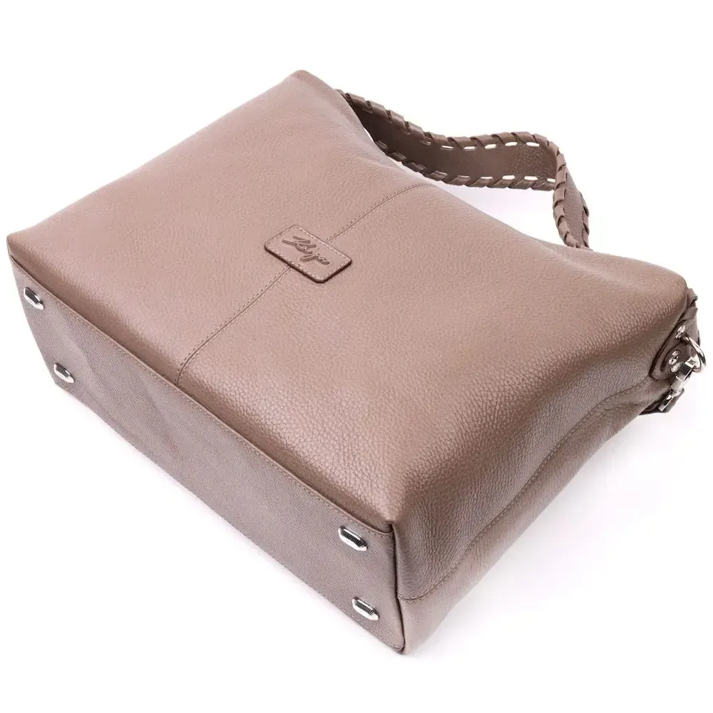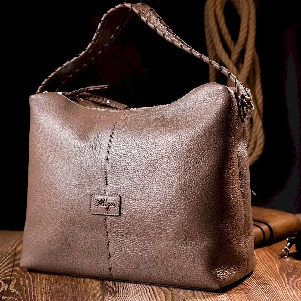 Містка та зручна жіноча сумка з натуральної зернистої шкіри, красивого коричневого кольору. Сумка практична та функціональна в експлуатації, якісна фурнітура сріблястого кольору не тільки доповнює стильний дизайн сумки, але й захищає виріб. Аксесуар упакований у фірмовий текстильний мішок Karya. Сумка з натуральної шкіри завжди буде чудовим подарунком будь-якій жінці
