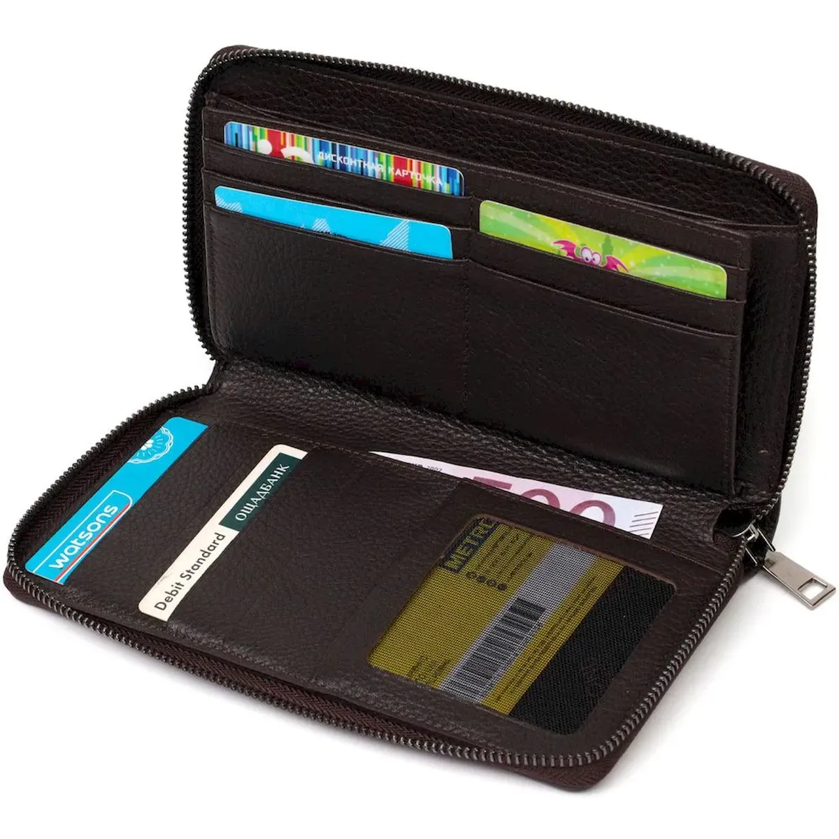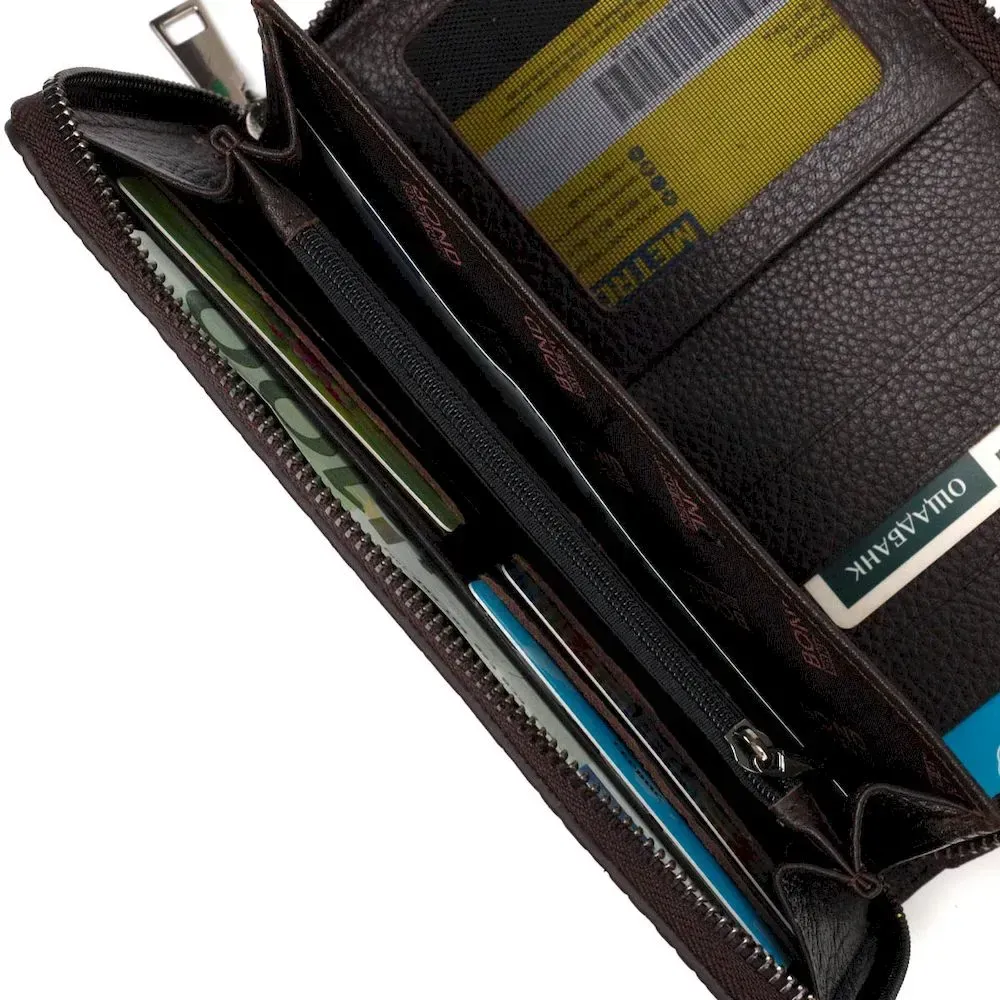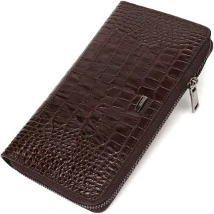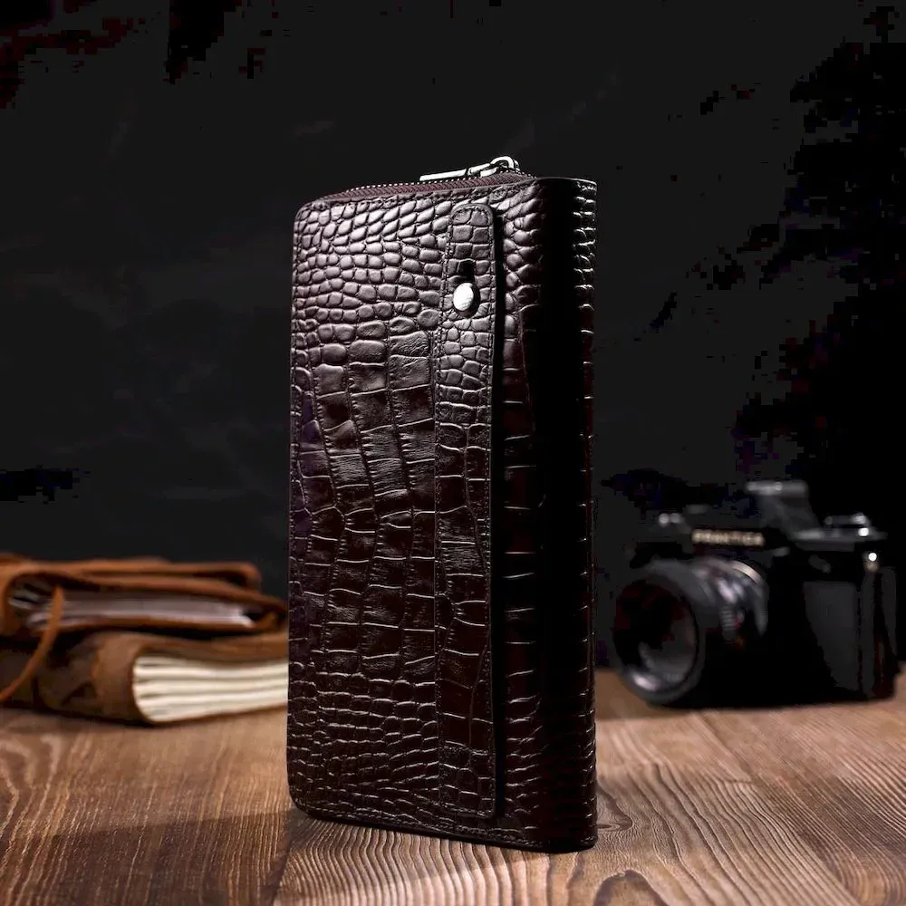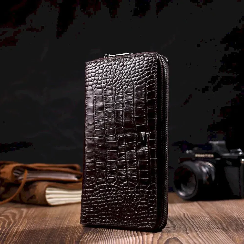 Широкий чоловічий клатч з натуральної шкіри з тисненням під крокодила, гаманець закривається на блискавку, всередині можна без проблем розміщувати паперові банкноти, банківські картки та навіть смартфон. Аксесуар складається з двох відділень для купюр, двох прилеглих кишень, сімнадцяти слотів для кредиток та монетниці на блискавці. Є також ручка долоні на тильній стороні клатчу. Продається гаманець у гарній коробці від виробника. Якісний і надійний клатч - саме такий аксесуар повинен бути у кожної людини, що поважає себе.