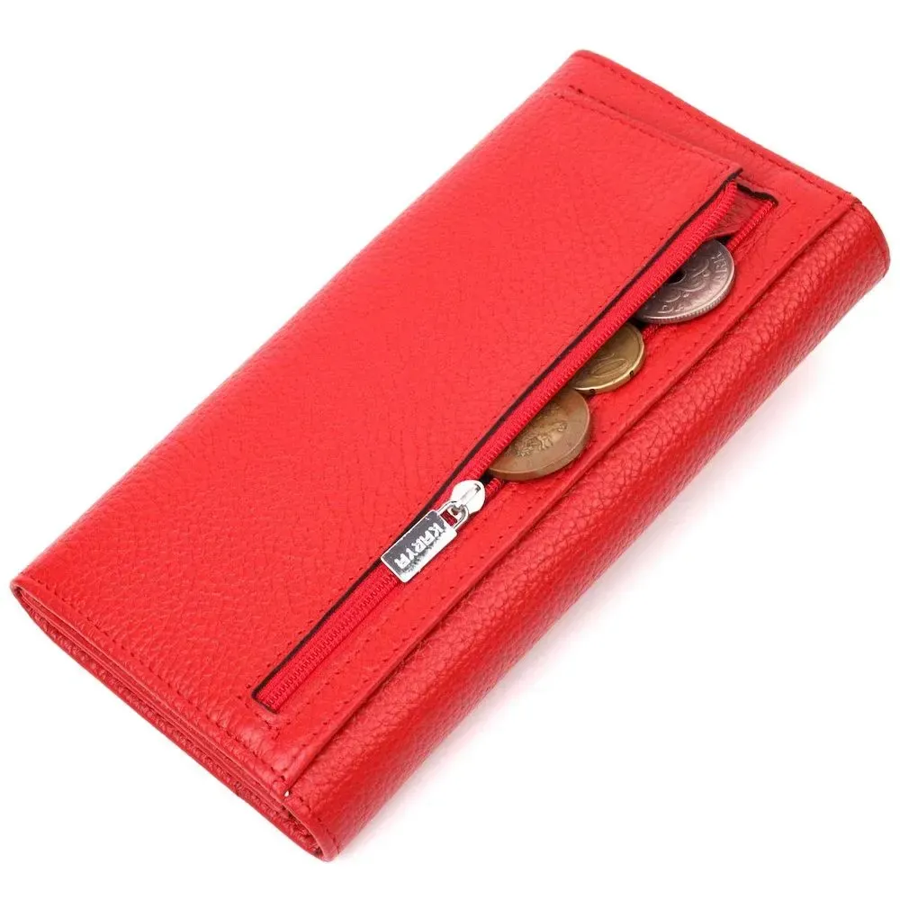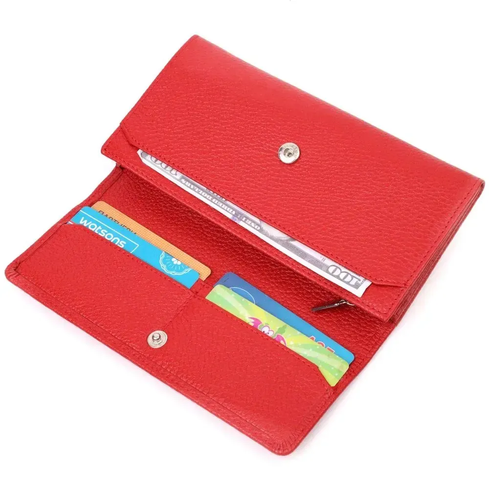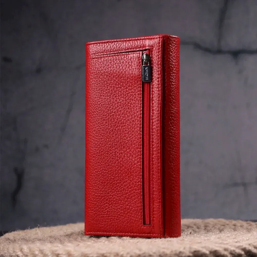 Яскравий гаманець з натуральної зернистої шкіри в красивому червоному кольорі. Внутрішній розворот складається з трьох відкритих відділень для купюр, двох прилеглих кишень, монетниці з розширювачем на застібці зовні, однієї кишені-перегородки на блискавці, дванадцяти секцій для пластикових карток. Складається аксесуар навпіл, з фіксацією на клапан та кнопку. Такий гаманець із натуральної шкіри - це ідеальний варіант на кожен день для тих, хто цінує якість, зручність та комфорт.