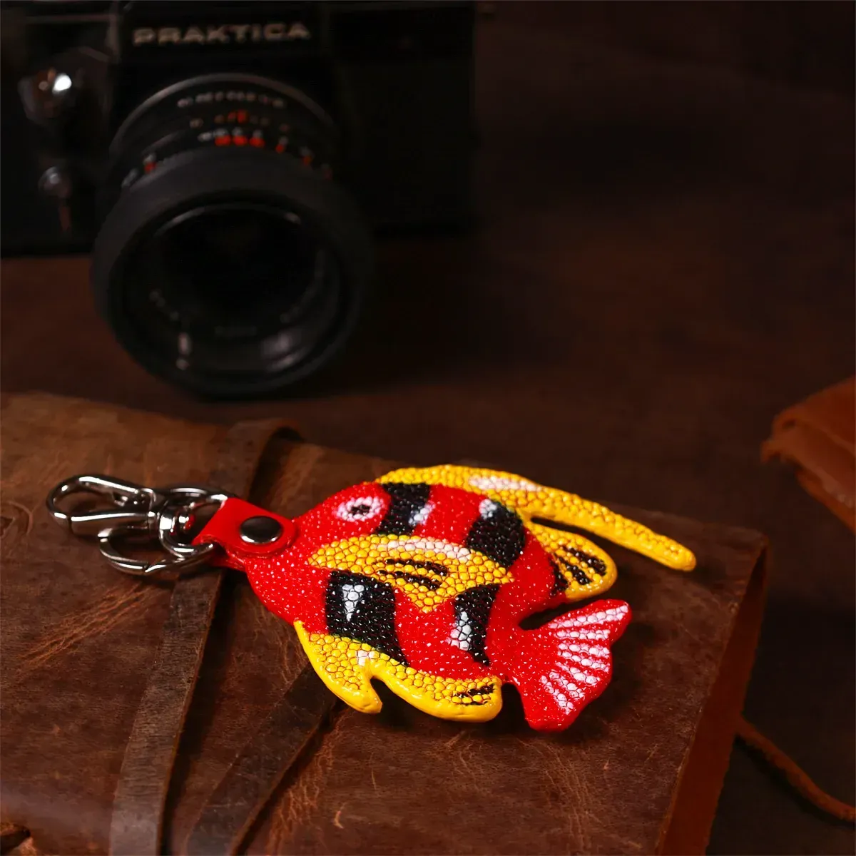 Яскравий брелок з натуральної шкіри морського схилу, дуже стійкий до зносу, проколів, порізів, до розривів і навіть до вогню. Виріб підходить як для ключів, так і як аксесуар для сумочки або рюкзака.
