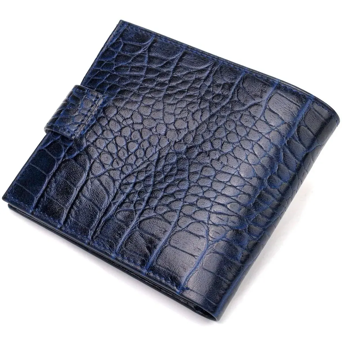 Стильний чоловічий портмоне з натуральної фактурної шкіри з тисненням під крокодила. Аксесуар має одне основне відділення з кишенею-перегородкою, в яке розміщуються купюри всіх номіналів, шість кишень для карток, кишеня під сіточкою для документів та монетницю. Закривається аксесуар навпіл шкіряним хлястиком на кнопку. Запакований гаманець картонну коробку.