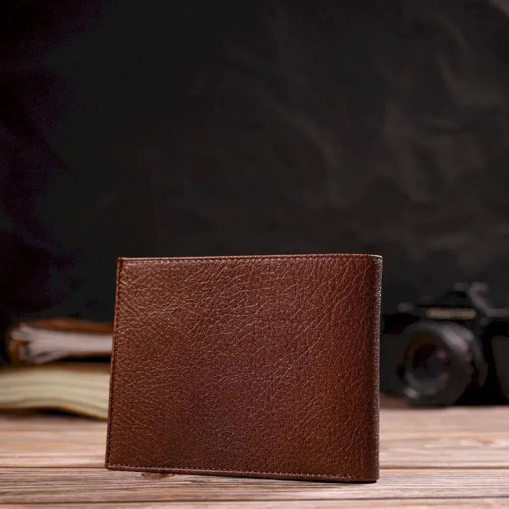 Зручний чоловічий гаманець у незвичайному світло-коричневому кольорі, з натуральної шкіри . Аксесуар має одне основне відділення з перегородкою, в яке поміщаються купюри всіх номіналів, чотири кишені для карток, дві кишені під сіточкою для документів, монетницю та три прилеглі кишені. Закривається аксесуар навпіл без застібки. Запакований гаманець картонну коробку. Шкіряний гаманець є чудовим подарунком для рідних та близьких людей.