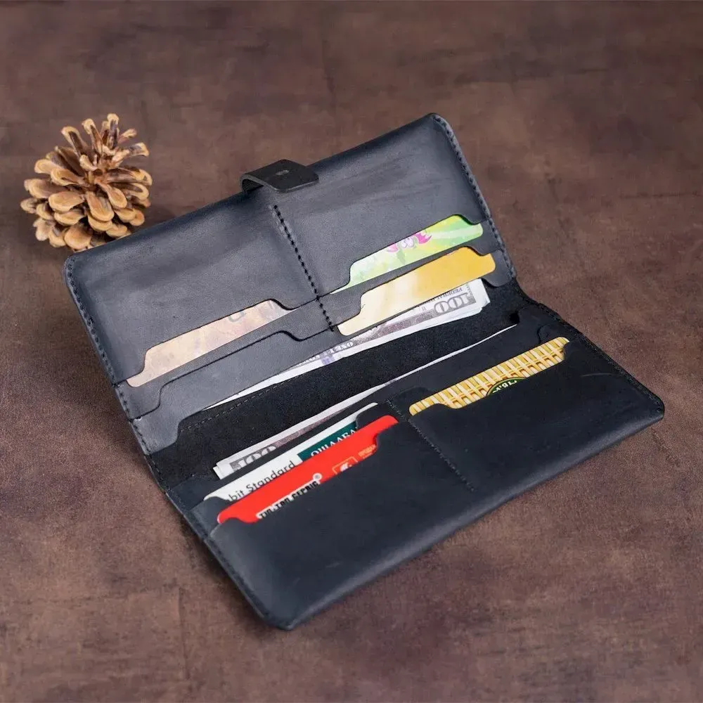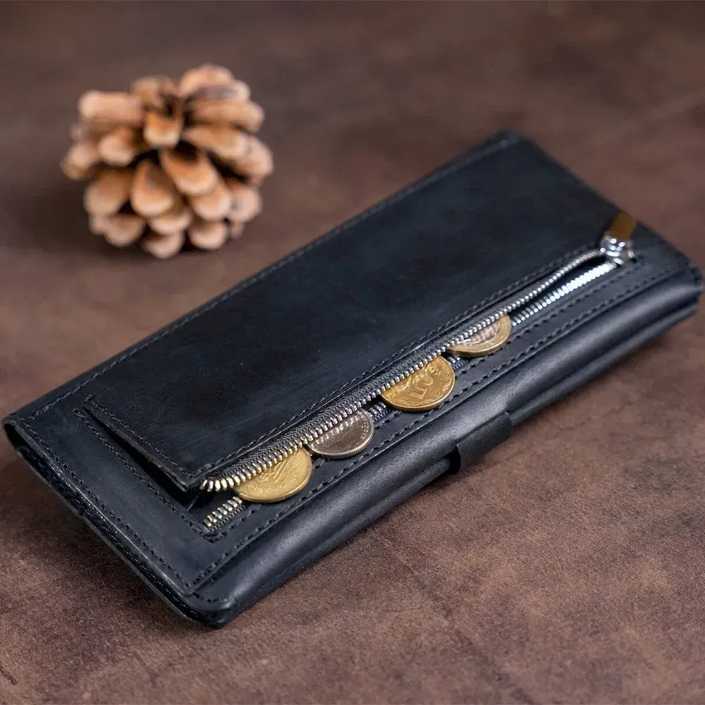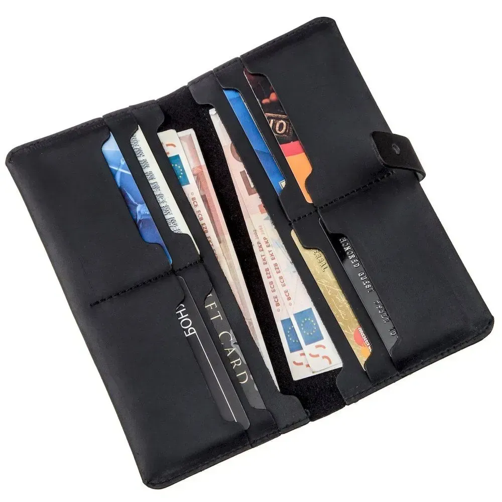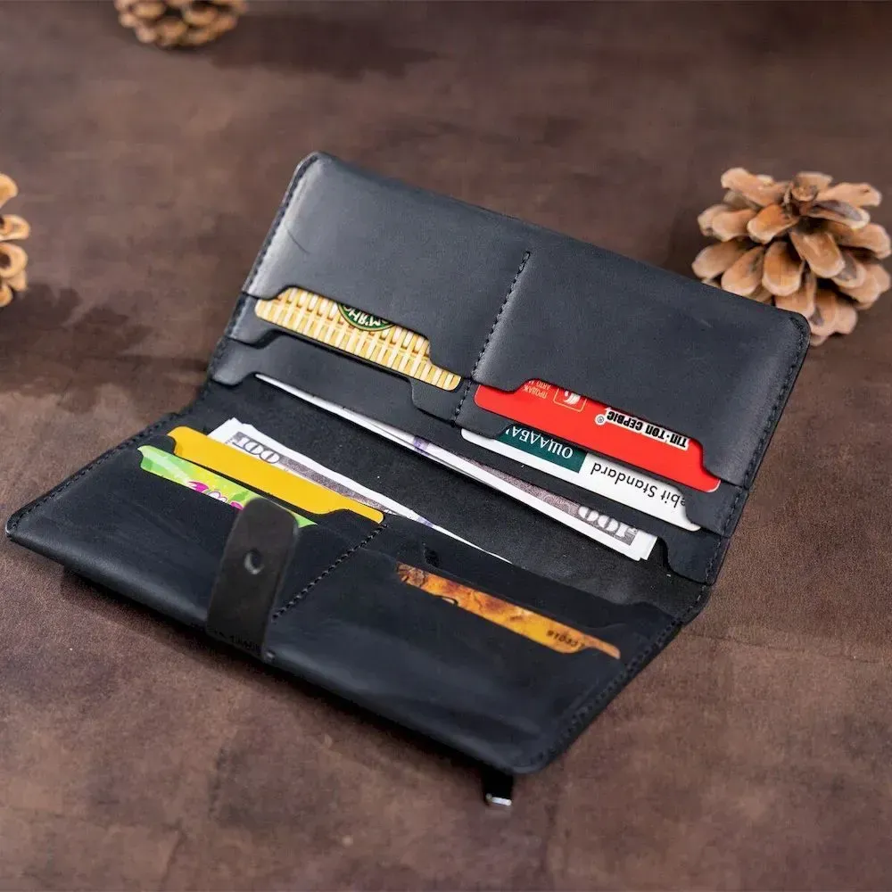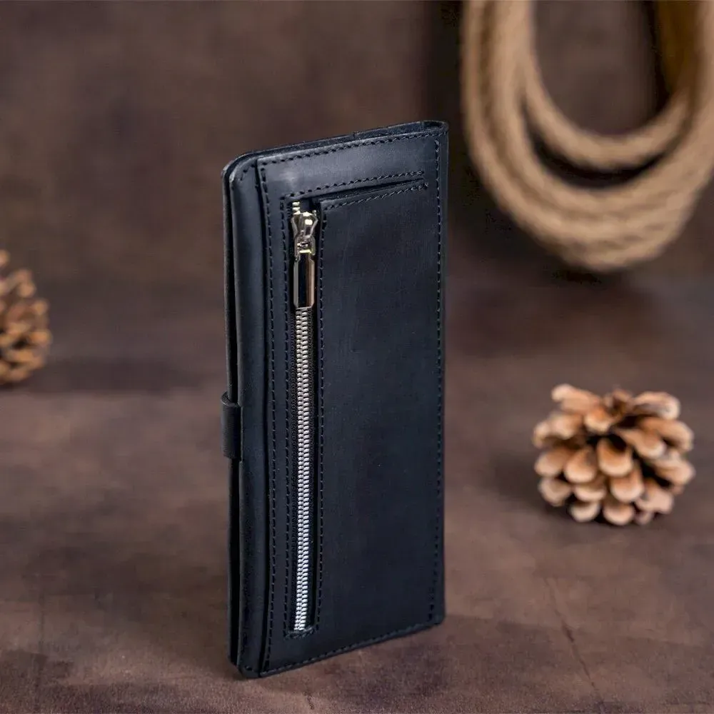 Шикарний чоловічий гаманець із натуральної шкіри Crazy horse. Особливістю такої шкіри є характерні потертості та подряпини, які й надають їй незвичайного ефекту старовини. Усередині гаманця два основних відділення для паперових купюр та вісім слотів для кредиток. Гаманець має природний запах натуральної шкіри та м'який, приємний на дотик. Модель застібається на петельку із натуральної шкіри. По краях виріб прошито синьою ниткою. На лицьовому боці гаманця є тиснений логотип бренду. Гаманець підійде як для чоловіка, так і для жінки. Аксесуар буде чудовим подарунком з будь-якого приводу або без.