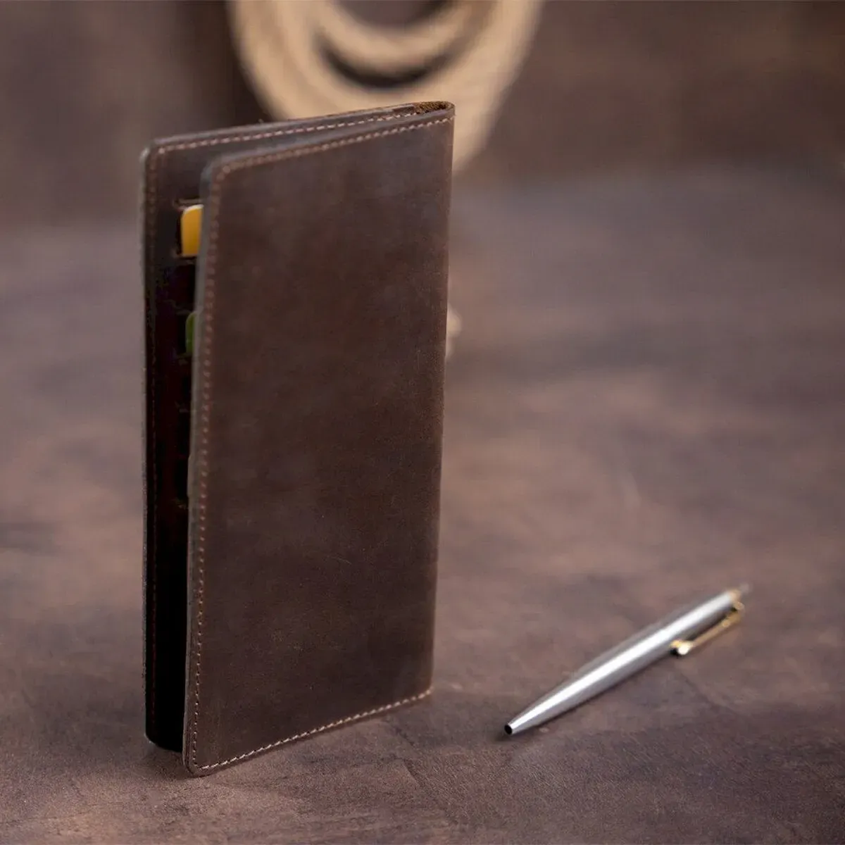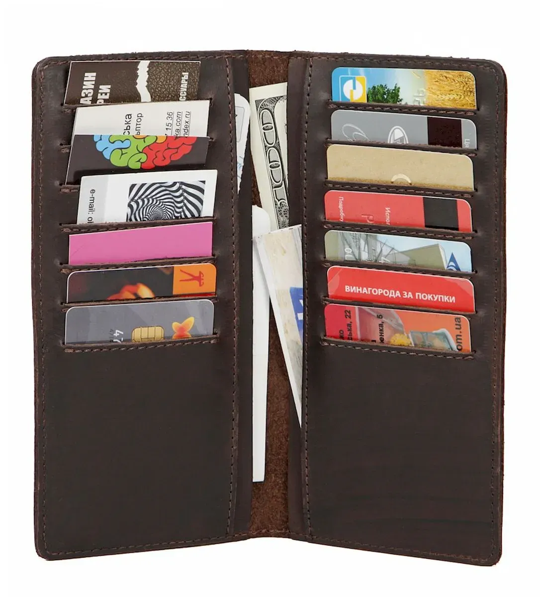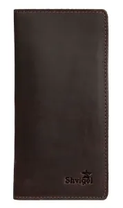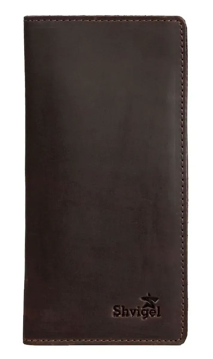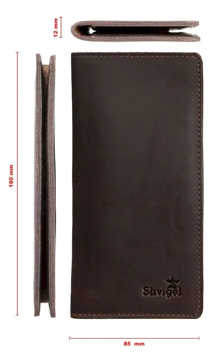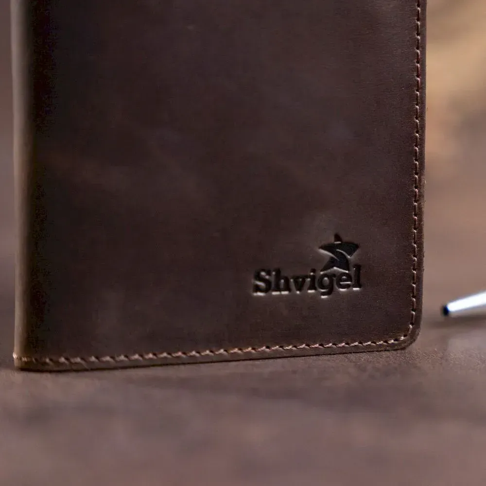 Країна виробництва: Україна. Шикарний чоловічий гаманець коричневого кольору. Аксесуар виконаний із товстої, високоякісної вінтажної шкіри. На лицьовій стороні виробу (в її правому нижньому кутку) розташований тісний логотип компанії виробник «SHVIGEL». Гаманець акуратно прошитий надміцною ниткою. Аксесуар упакований у фірмовий, текстильний пилозахисний чохол. >Всередині: