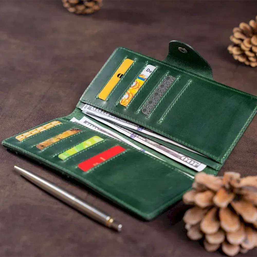 Зелений колір гаманця є особливо пріоритетним, оскільки є кольором грошей. Виріб відрізняється своєю міцністю та шикарним зовнішнім виглядом. Доповнено гаманець сріблястою фурнітурою. Закривається модель на дві кнопки – Ви можете самостійно регулювати наповненість виробу, закривши його на ближню чи далеку кнопку. Виріб поміститься у ваш портфель або сумку, не має важкої ваги. Чудово лежить у руці. На лицьовій стороні тиснений логотип бренду. Якщо ви шукаєте подарунок – радимо вам цю модель – вона доступна в різних кольорах і є дуже виграшним рішенням для подарунка близькій людині.