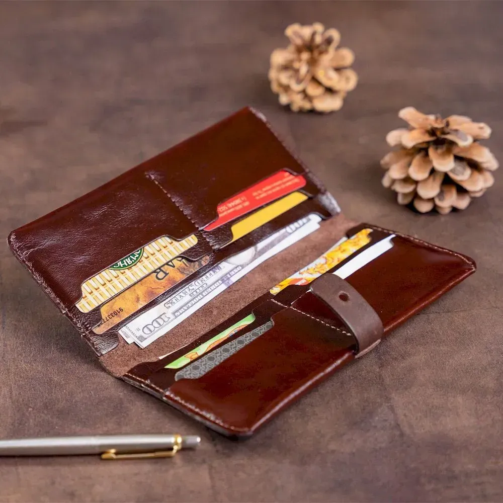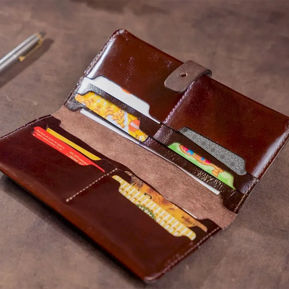 Стильна та оригінальна чоловічий гаманець від українського виробника. Виріб має ідеально підібраний класичний та функціональний дизайн з просторими відділеннями та осередками. З таким аксесуаром ваші гроші та картки будуть у цілісності та в порядку. Модель закривається шкіряним хлястиком петелькою. По краях гаманець прошитий рівним рядком у дизайн виробу. На лицьовій стороні виріб прикрашений тисненим логотипом бренду. Модель доступна в різних кольорах та шкірах.