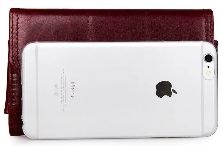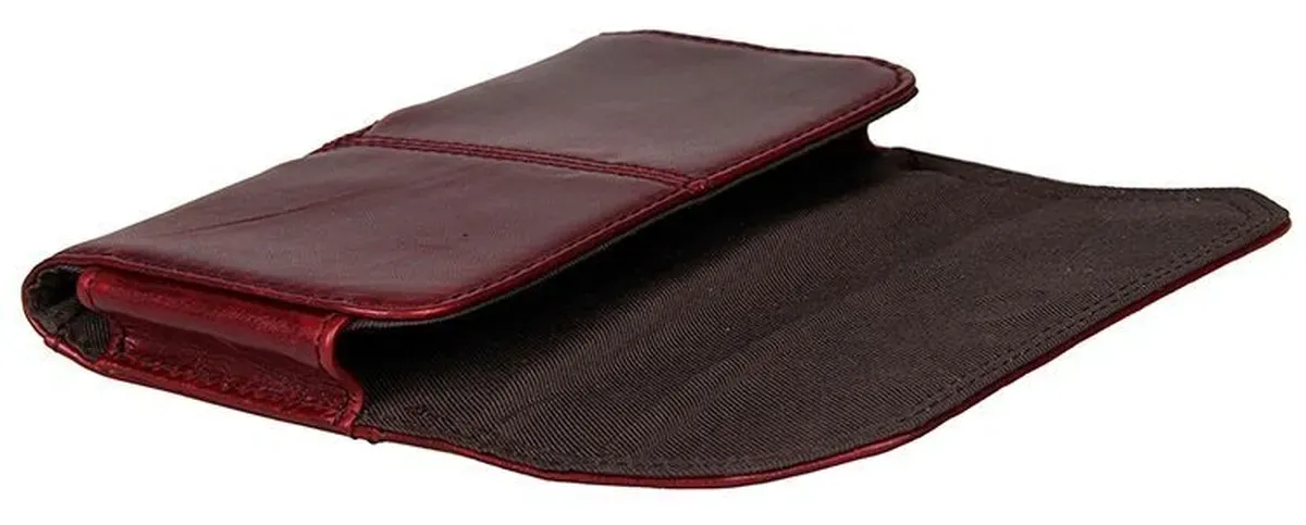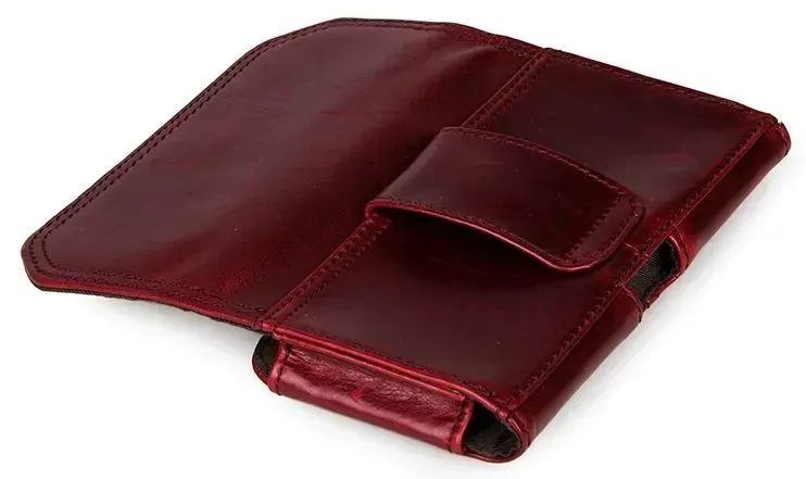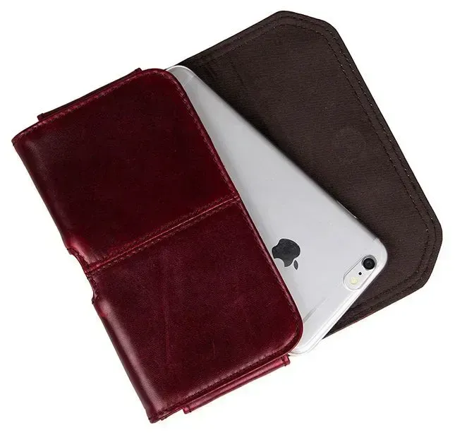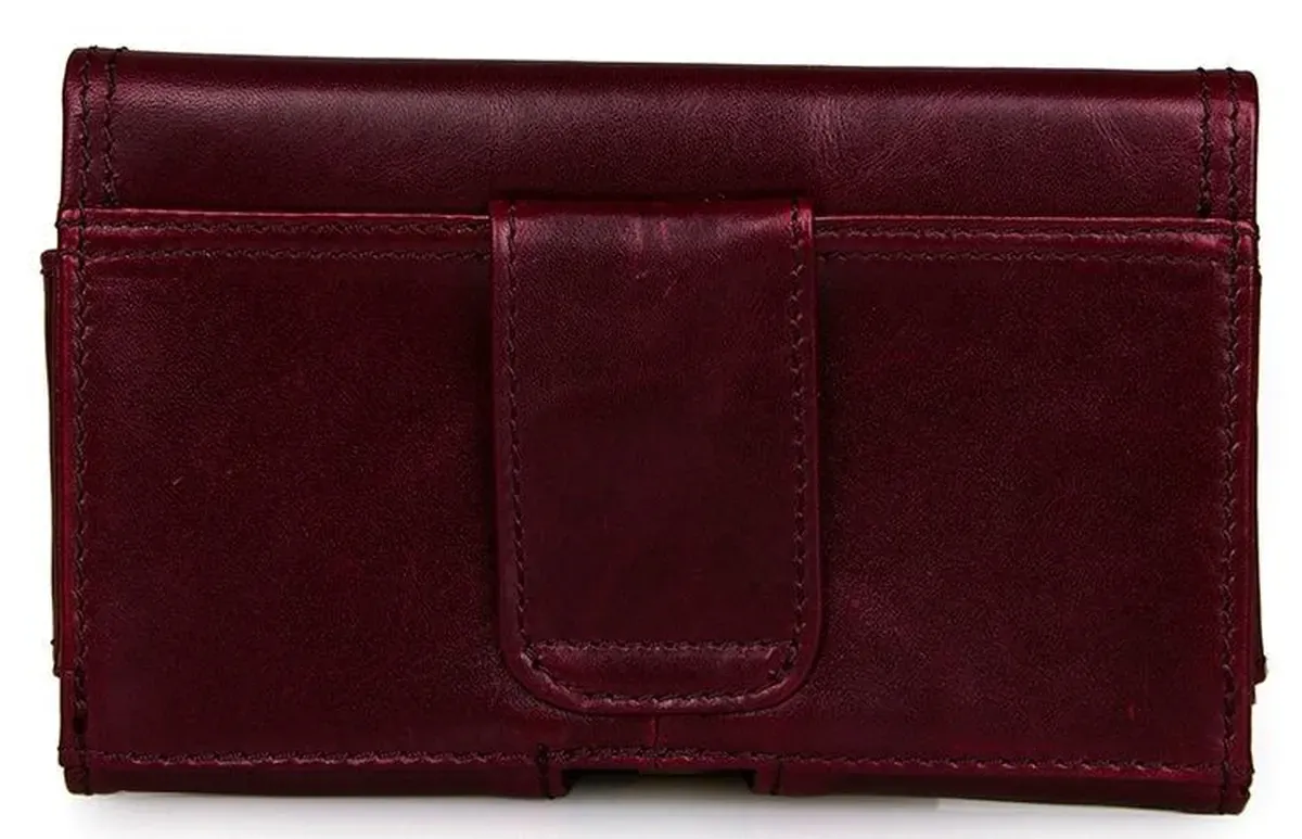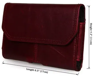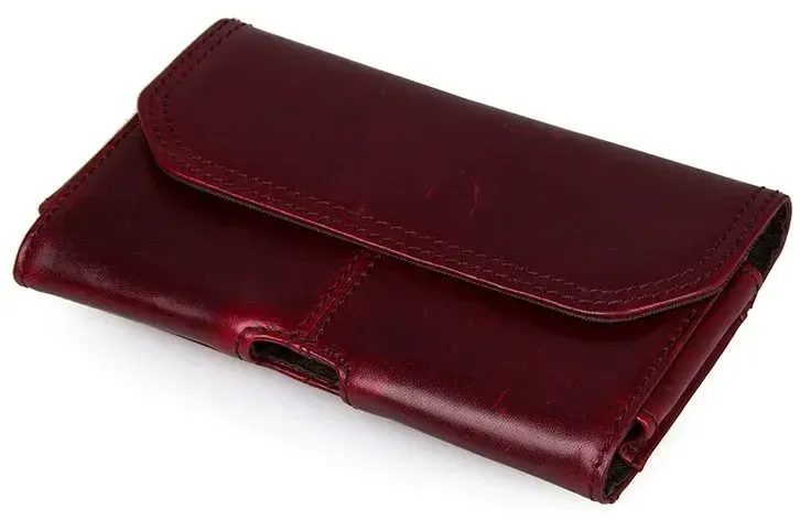 Зручний шкіряний чохол для смартфона бордового кольору. Аксесуар акуратно прошитий надміцною ниткою. Виріб носиться на пояс. Закривається чохол за допомогою прихованої магнітної кнопки. Усередині одне відділення. Аксесуар упакований у текстильний пилозахисний мішечок.