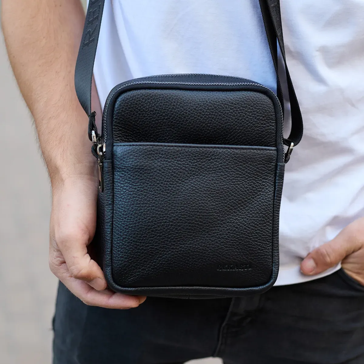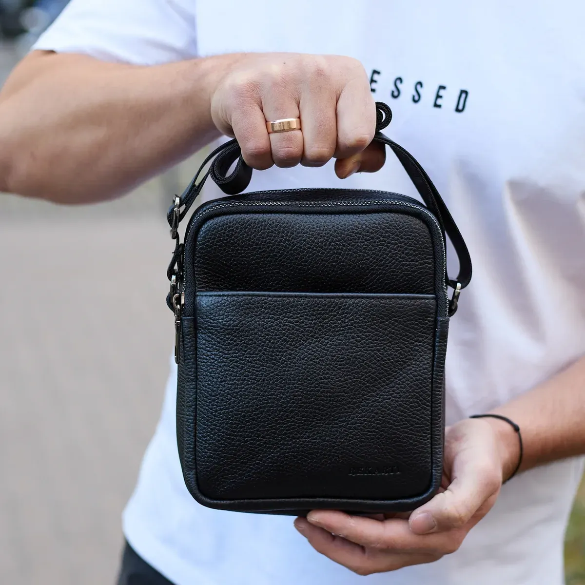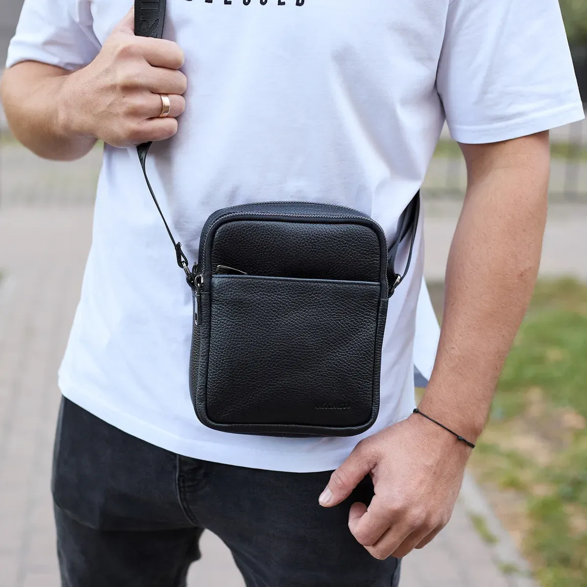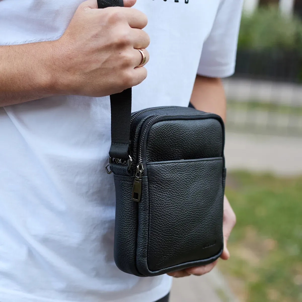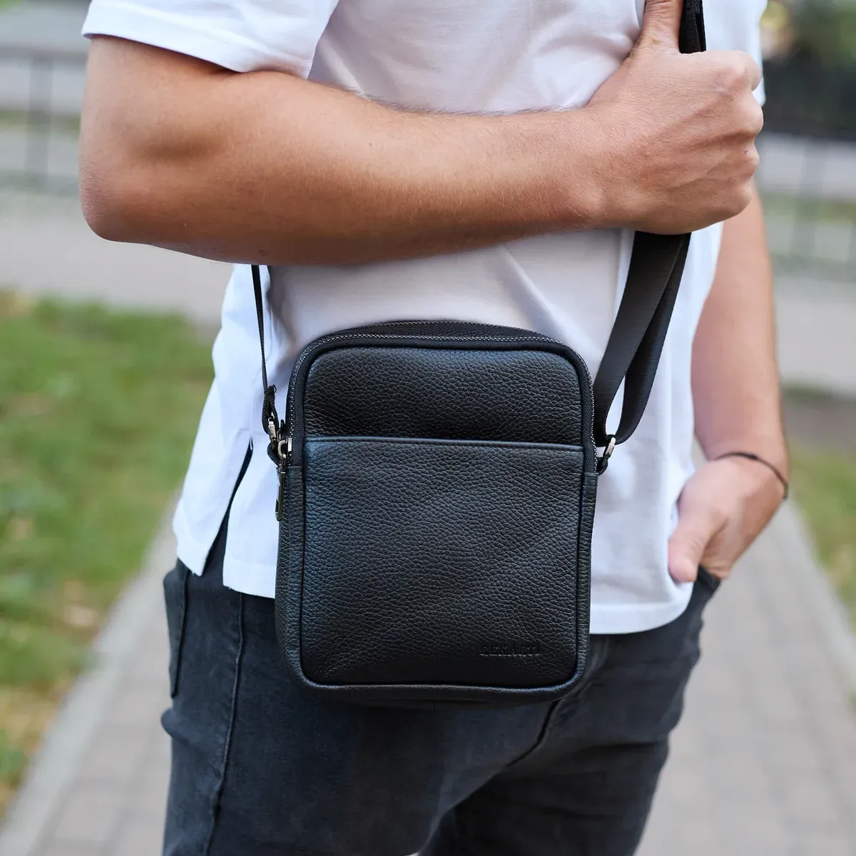 Чоловіча барсетка через плече, зернистая кожа 20х16х6, месенджер для міста, сумка для телефону та документів, чорна