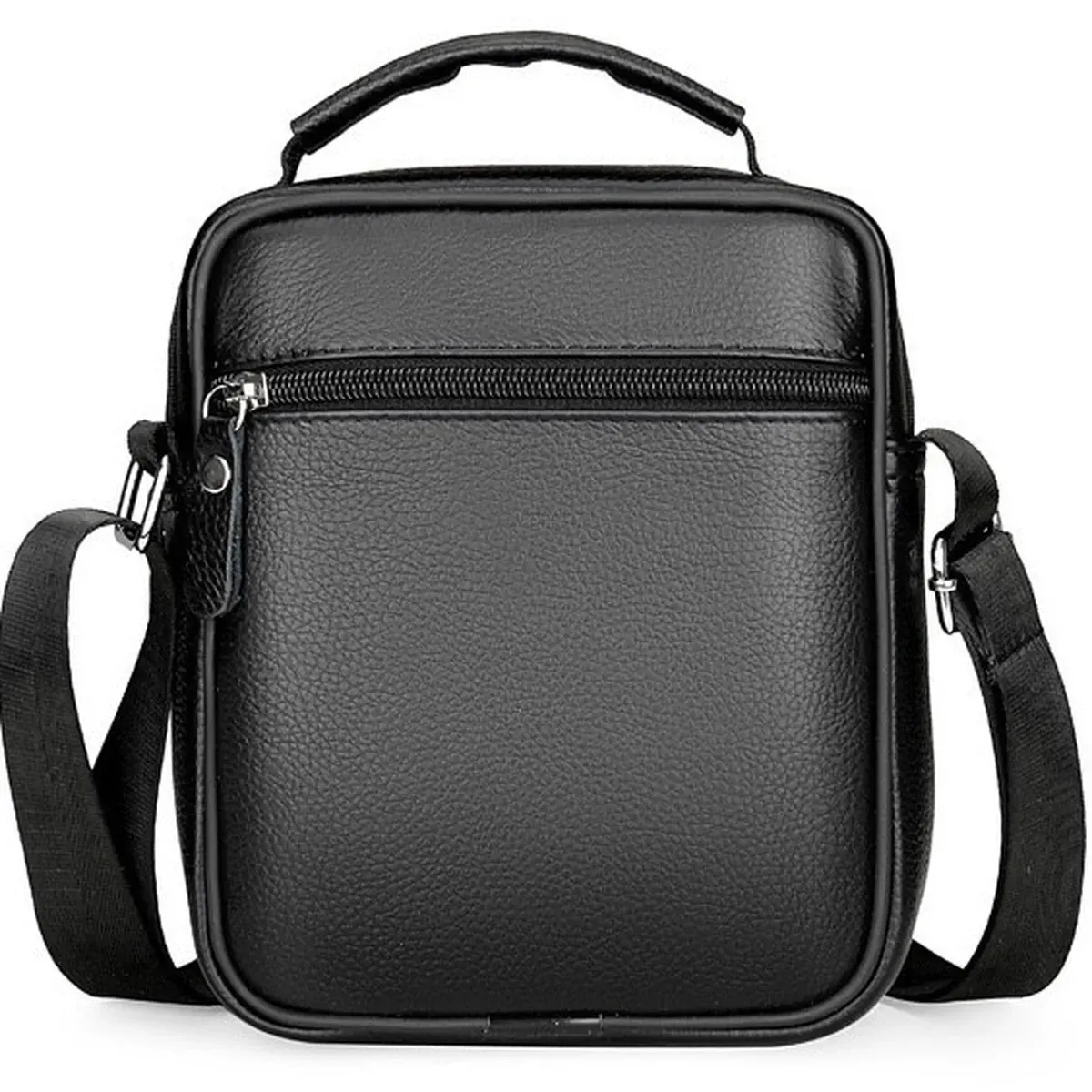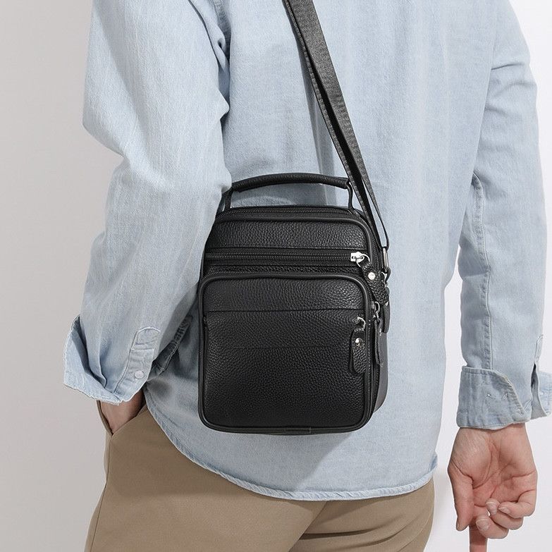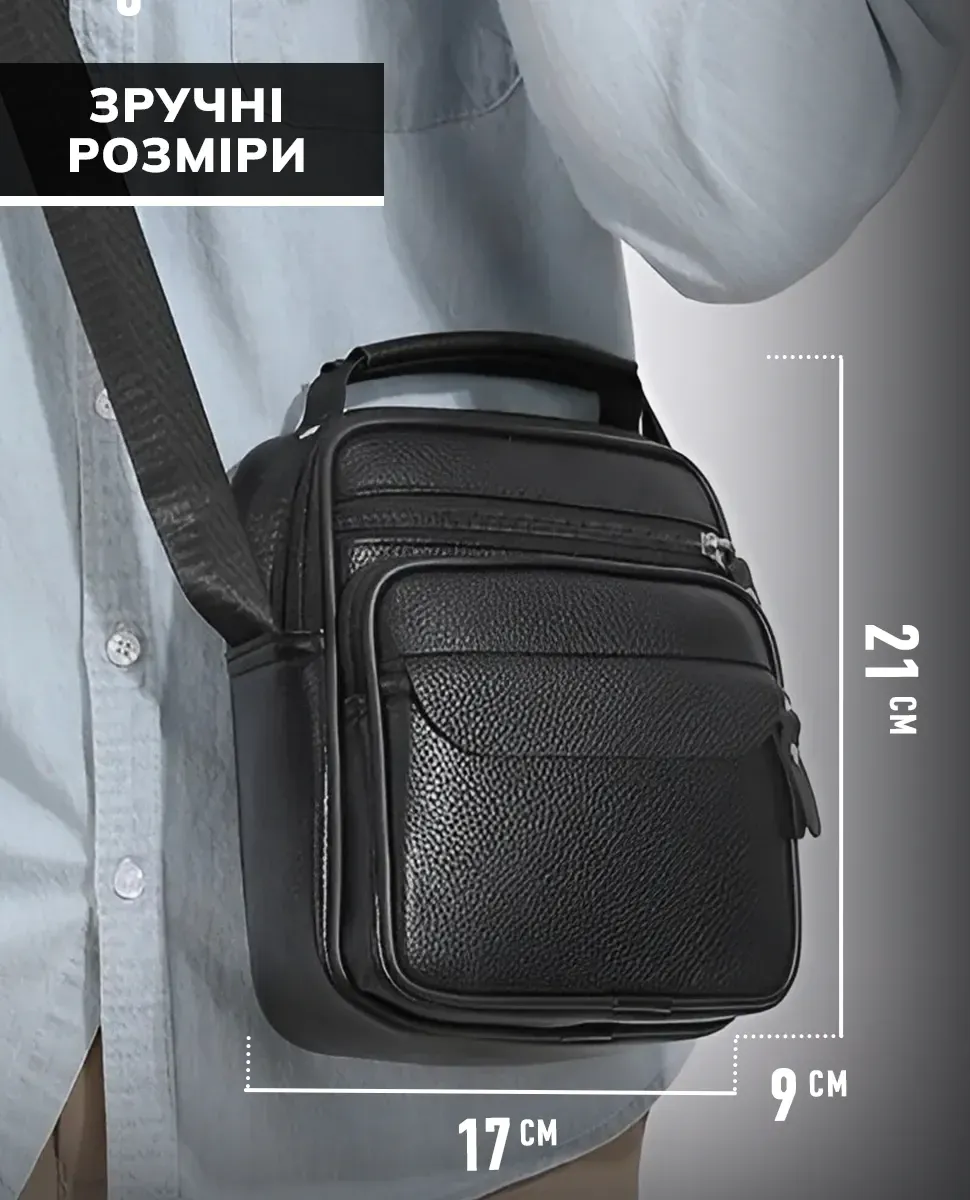 Чоловічий месенджер із натуральної шкіри, має насичений чорний колір і чудову металеву фурнітуру. Також модель обладнана довгим текстильним ременем, який регулюється за довжиною та м'якою шкіряною ручкою. Шкіряна чоловіча сумка з ручкою має два автономні відділення, які застібаються за допомогою блискавок. На тильній стороні сумки розташована одна кишеня на блискавці. На своїй лицьовій частині сумки розміщені: одна досить містка кишеня і дві додаткові допоміжні, які так само закриваються за допомогою блискавок.