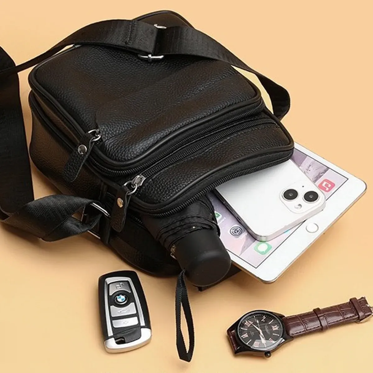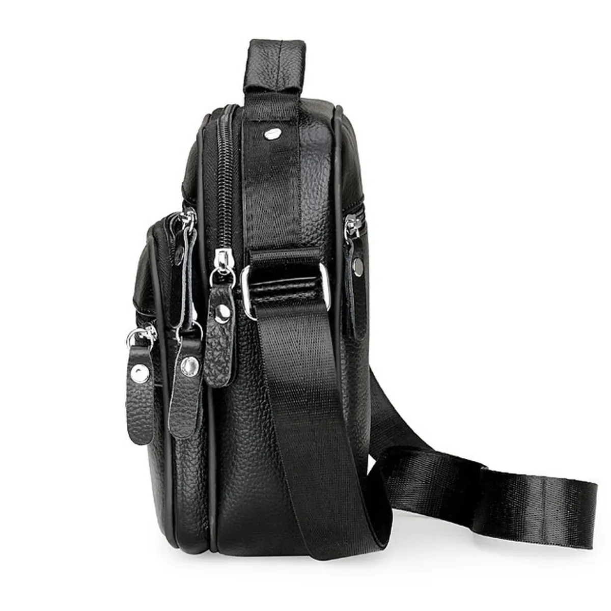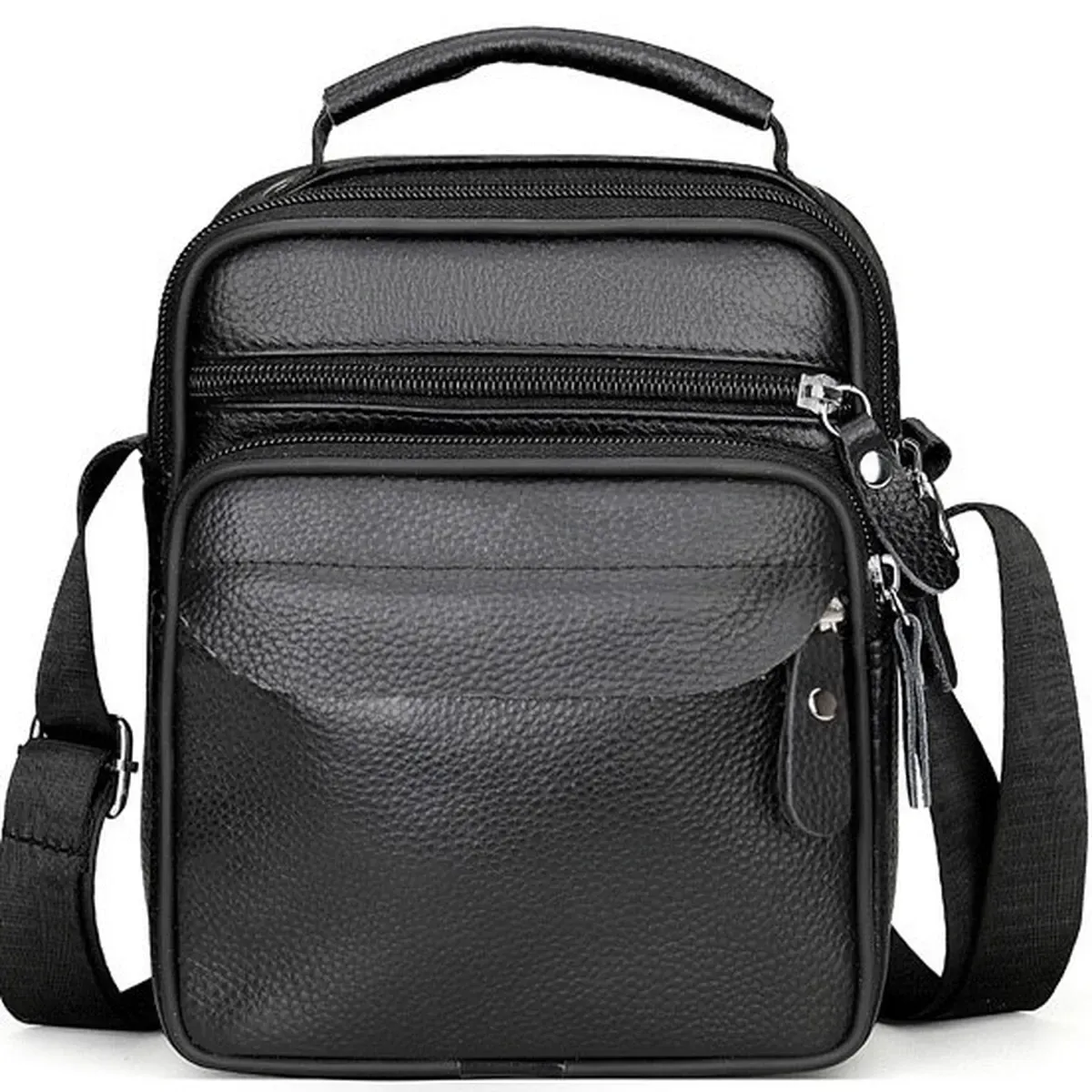 Чоловічий месенджер із натуральної шкіри, має насичений чорний колір і чудову металеву фурнітуру. Також модель обладнана довгим текстильним ременем, який регулюється за довжиною та м'якою шкіряною ручкою. Шкіряна чоловіча сумка з ручкою має два автономні відділення, які застібаються за допомогою блискавок. На тильній стороні сумки розташована одна кишеня на блискавці. На своїй лицьовій частині сумки розміщені: одна досить містка кишеня і дві додаткові допоміжні, які так само закриваються за допомогою блискавок.