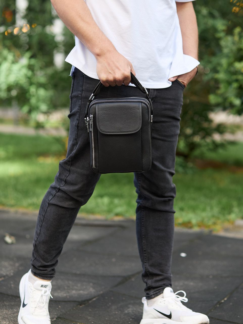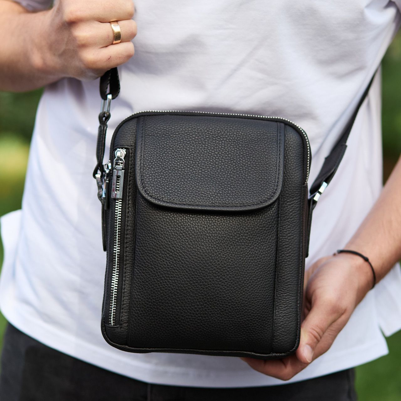 Лаконічна чоловіча сумка на плече виконана з високоякісної натуральної шкіри, м'якої на дотик. Виріб має два рівномірні основні відділення, всередині яких знаходяться бічна кишеня на блискавці, а також кишеня відкритого типу. Крім основних відділень, сумка має зовні також три додаткові відділення-кишені (з лицьової та тильної частини). Кожне відділення застібається за допомогою якісної фурнітури. Усередині сумка оброблена щільною підкладкою. Ремінець сумки щільний, регульований, знімний, а коротка зручна ручка в руці.