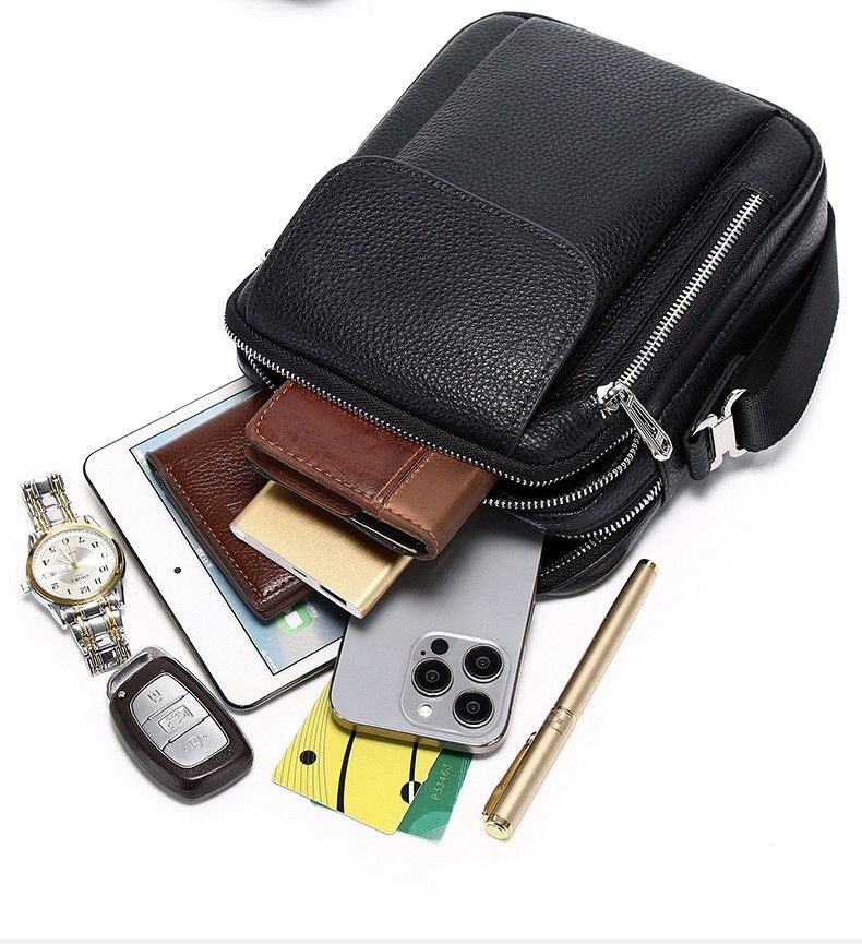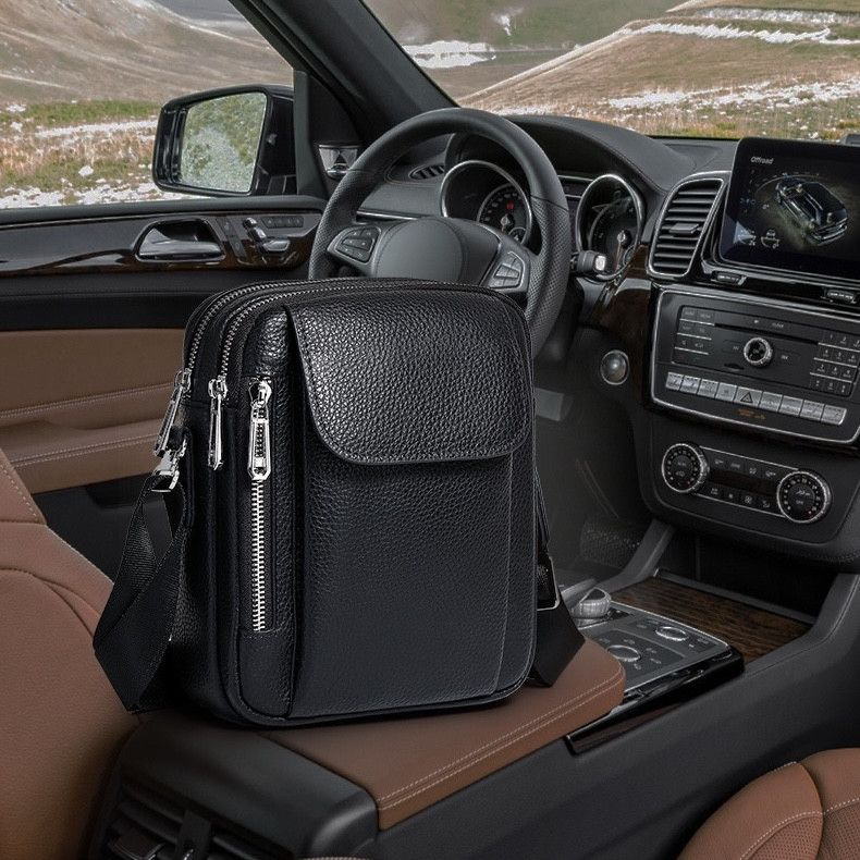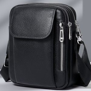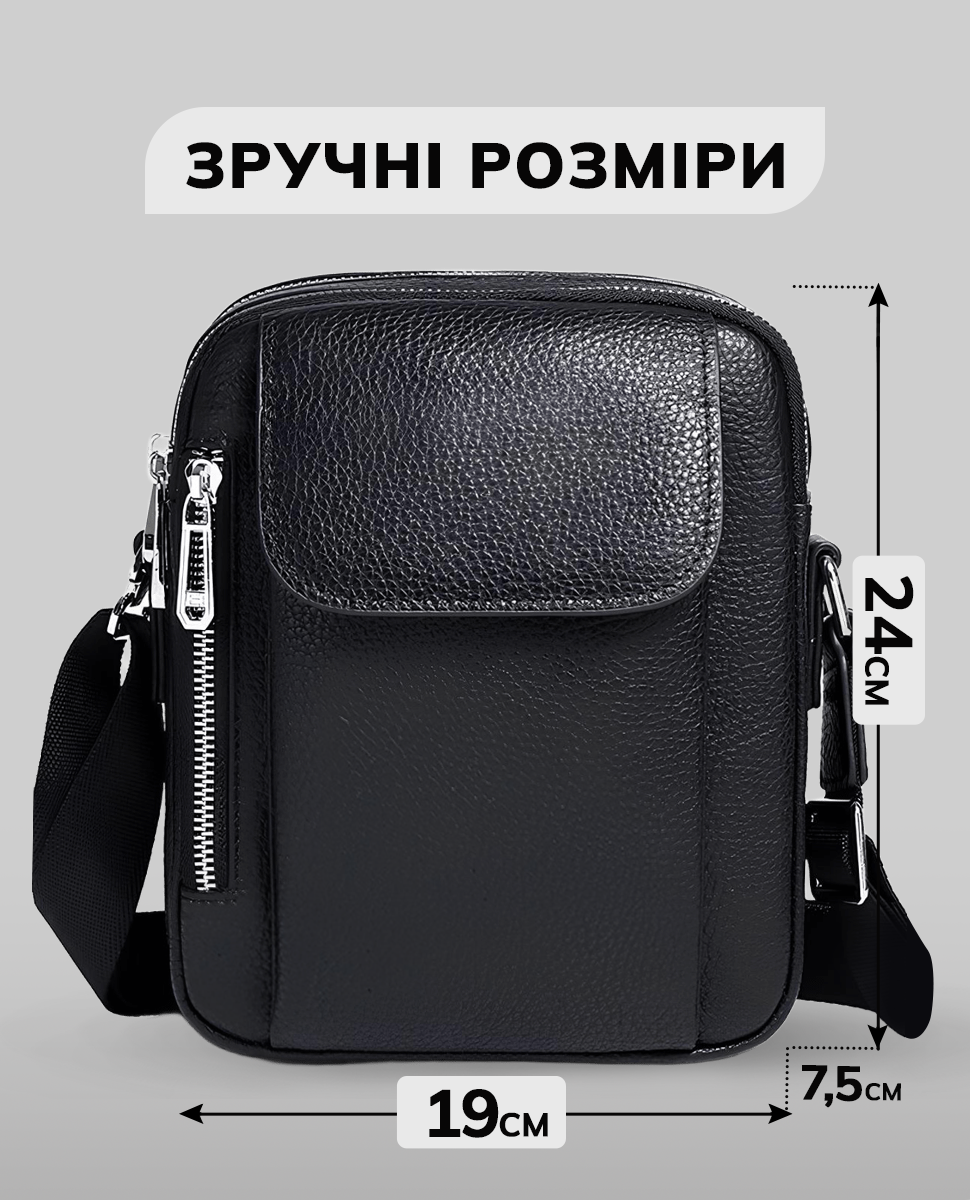 Лаконічна чоловіча сумка на плече виконана з високоякісної натуральної шкіри, м'якої на дотик. Виріб має два рівномірні основні відділення, всередині яких знаходяться бічна кишеня на блискавці, а також кишеня відкритого типу. Крім основних відділень, сумка має зовні також три додаткові відділення-кишені (з лицьової та тильної частини). Кожне відділення застібається за допомогою якісної фурнітури. Усередині сумка оброблена щільною підкладкою. Ремінець сумки щільний, регульований, знімний, а коротка зручна ручка в руці.