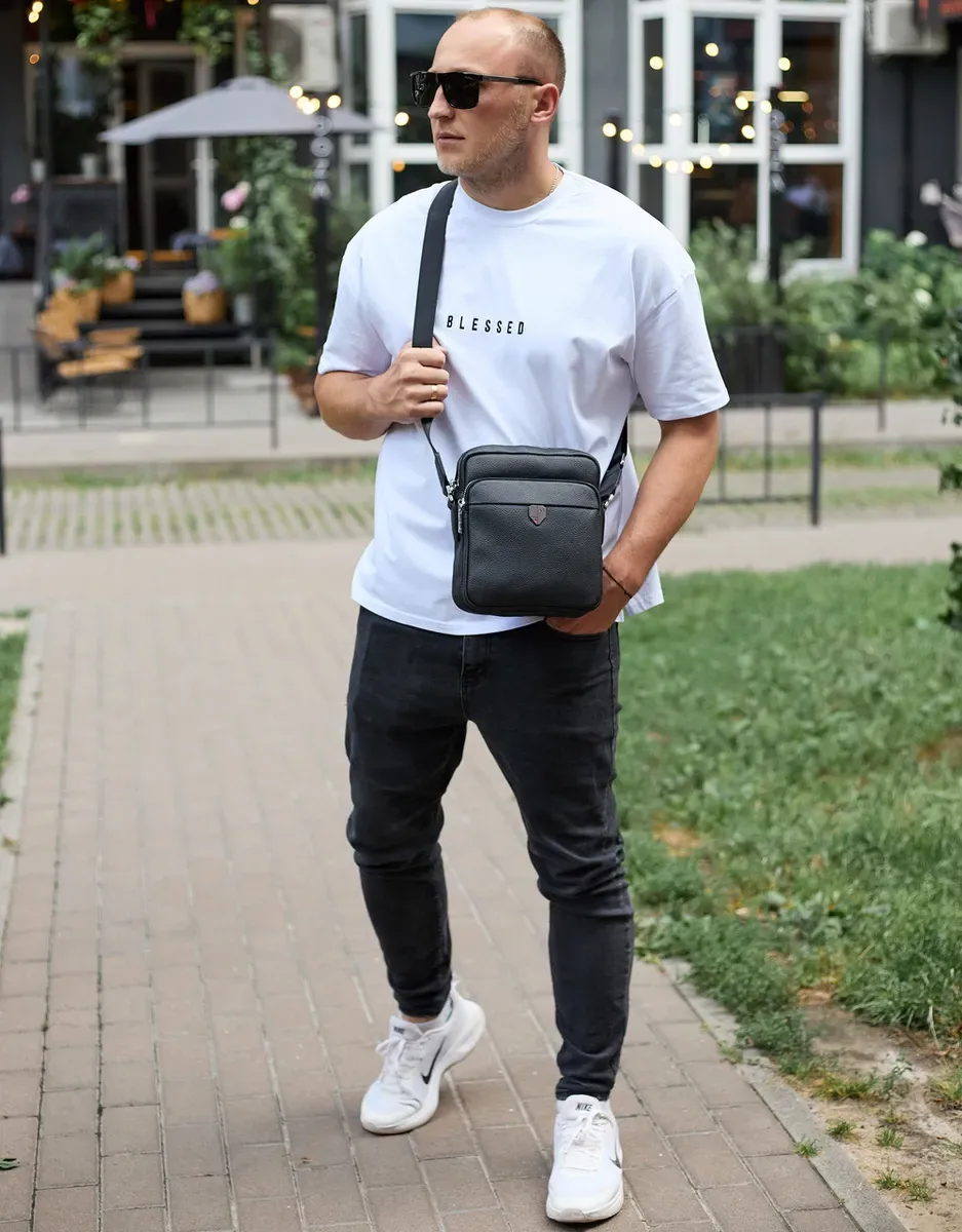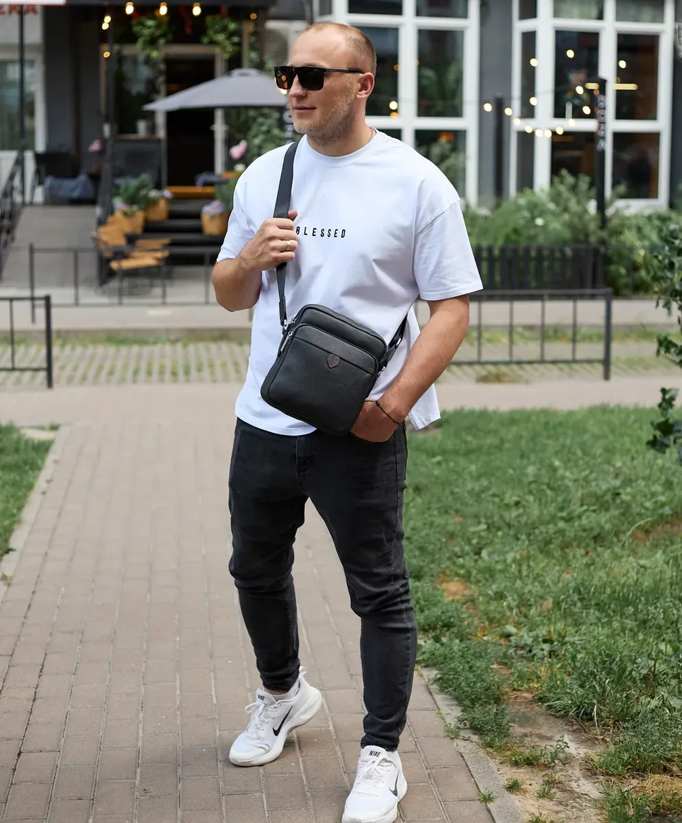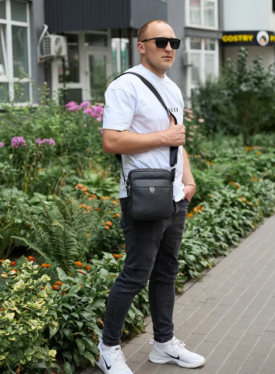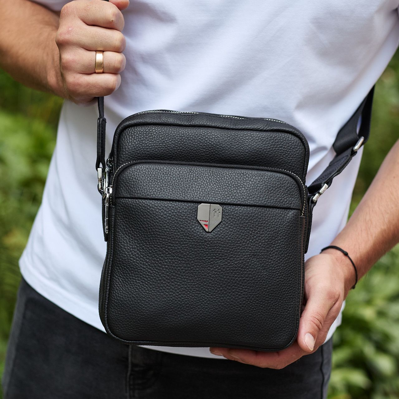 Чоловіча шкіряна сумка-барсетка 24х20х8, компактна сумочка на плече для чоловіка, наплічний месенджер, чорна