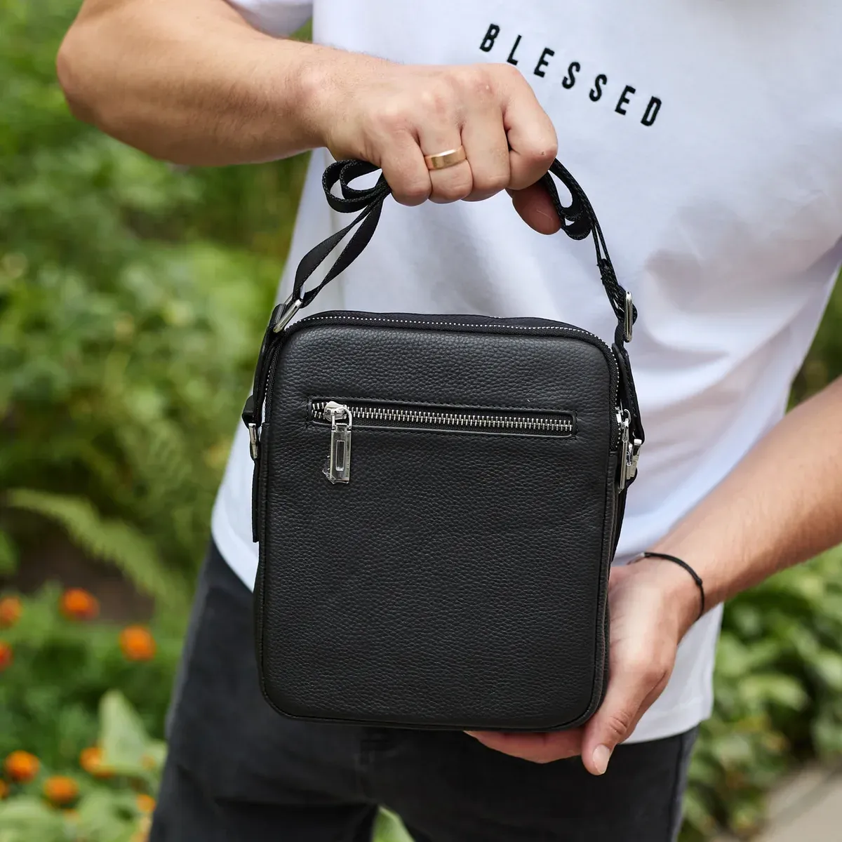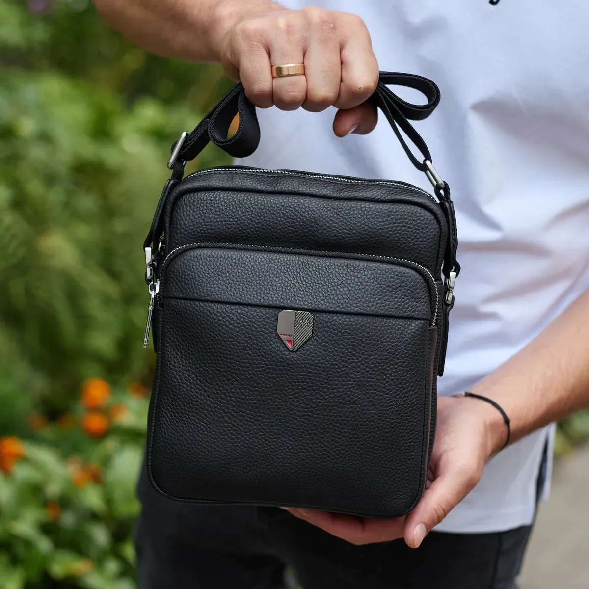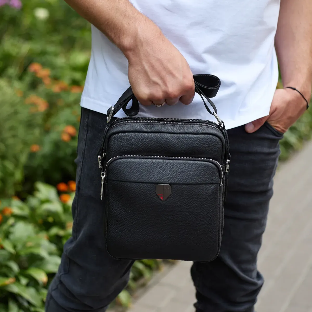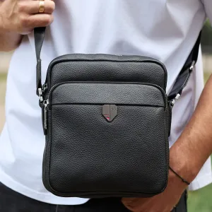 Чоловіча шкіряна сумка-барсетка 24х20х8, компактна сумочка на плече для чоловіка, наплічний месенджер, чорна