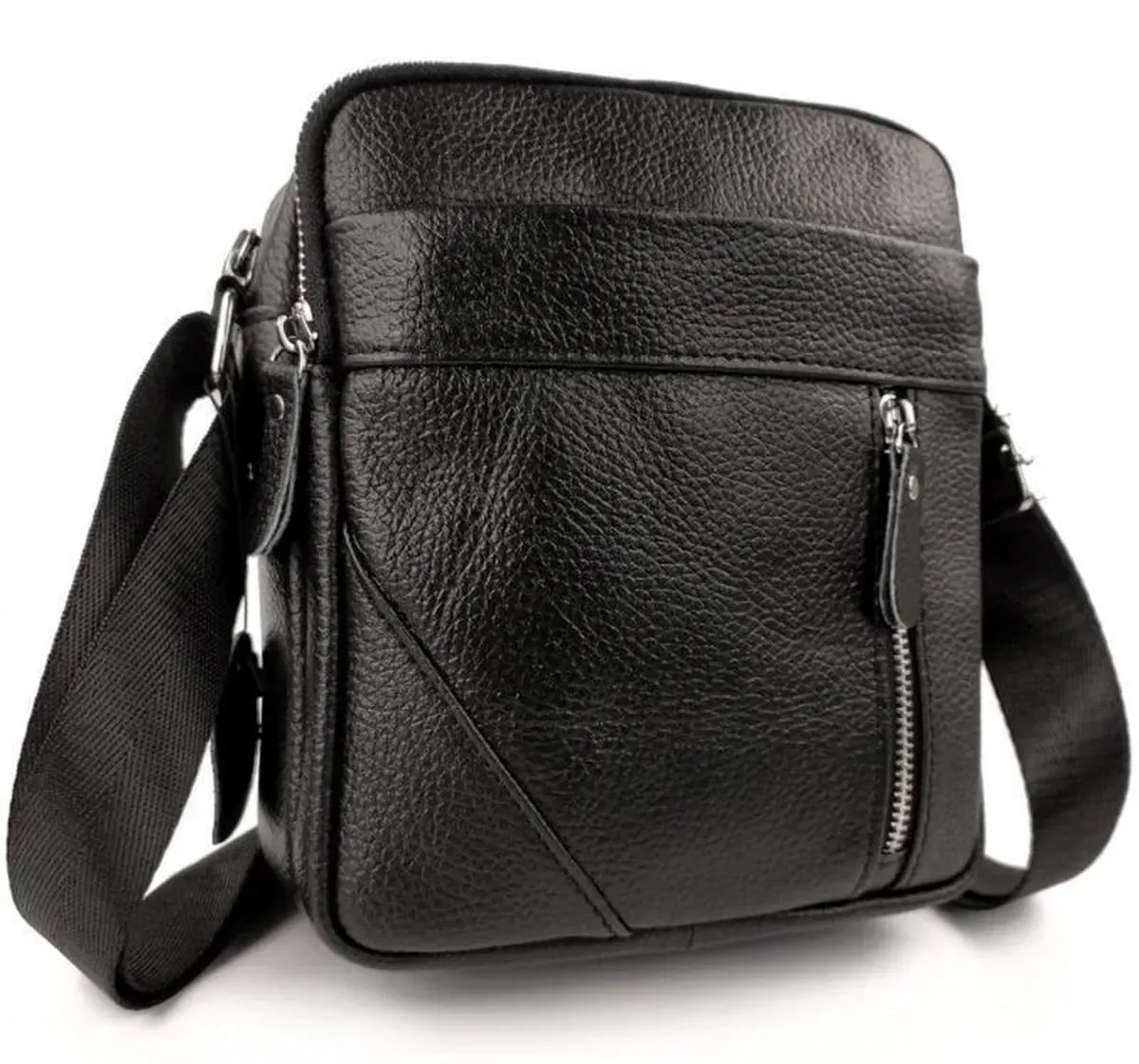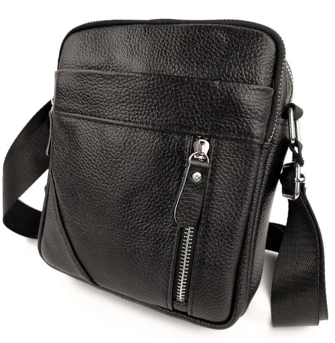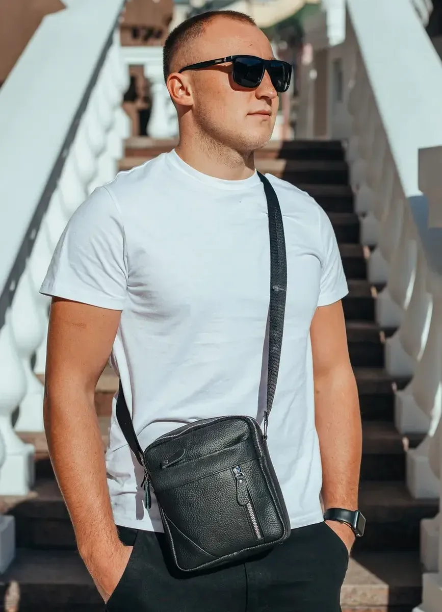 Чоловічий месенджер у чорному кольорі. Сумка чоловіча має ремінь через плече, який регулюється за довжиною, надійну фурнітуру та шкіряні пулери. Одне основне відділення містить маленьку кишеню на блискавці для дрібниць. Поруч з основним відділенням розташоване ще одне таке ж, меншого розміру. З лицьового боку є кишеня на блискавці, на якій розташована маленька кишеня на блискавці вертикального типу, з тильного боку є кишеня на блискавці горизонтального типу.