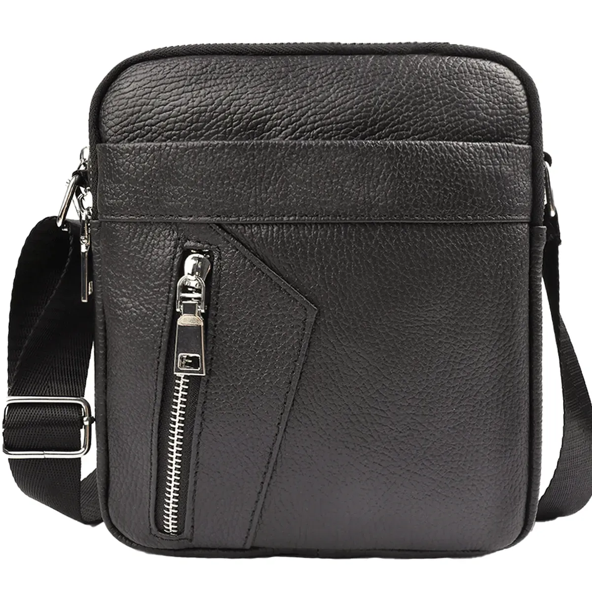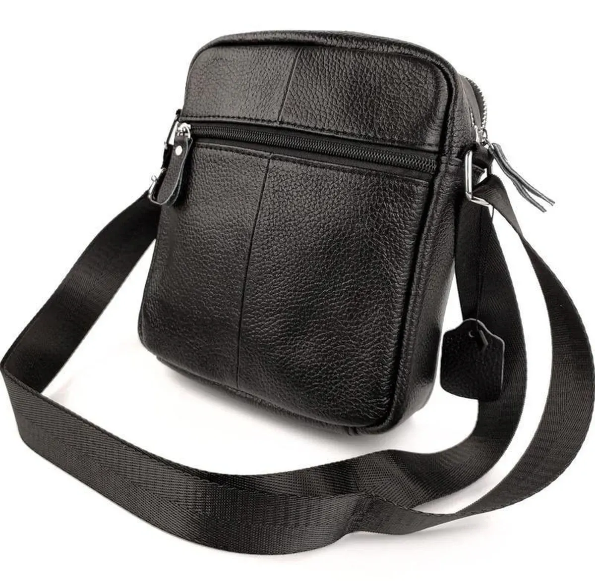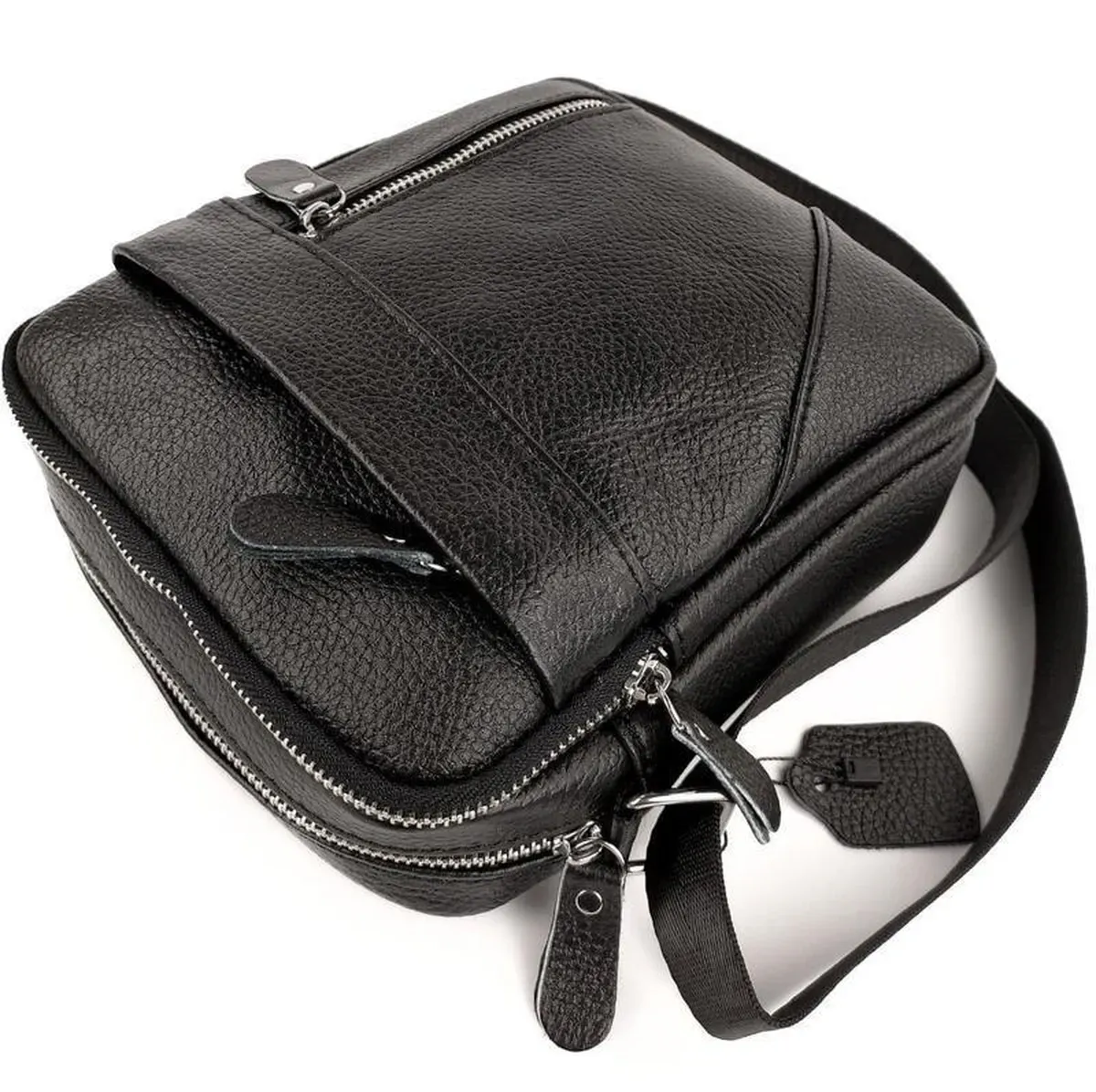 Чоловічий месенджер у чорному кольорі. Сумка чоловіча має ремінь через плече, який регулюється за довжиною, надійну фурнітуру та шкіряні пулери. Одне основне відділення містить маленьку кишеню на блискавці для дрібниць. Поруч з основним відділенням розташоване ще одне таке ж, меншого розміру. З лицьового боку є кишеня на блискавці, на якій розташована маленька кишеня на блискавці вертикального типу, з тильного боку є кишеня на блискавці горизонтального типу.