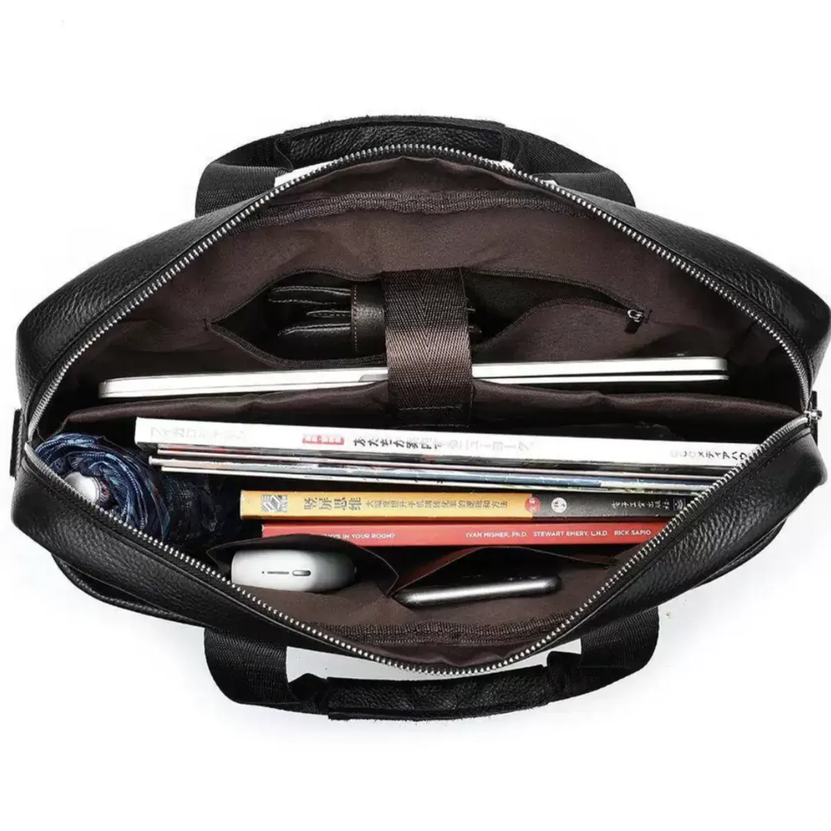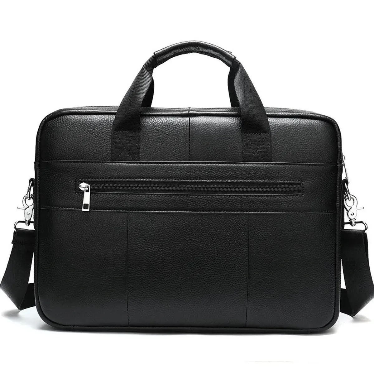 Стильна шкіряна сумка для справжніх чоловіків: багатофункціональна з натуральної шкіри. Сумка має два основні відділення на блискавці. В одному відділенні додатково розміщено 1 відділення на липучці для ноутбука до 15,6 дюймів. У другому – бічна кишеня на блискавці. Передня лицьова панель має 2 просторі кишені (на блискавці та накладній на магнітах), з тильного боку - велика кишеня на спіральній блискавці. Фурнітура металева під срібло; підкладка – міцний текстиль. Ручки зі шкіряними вставками та плечовий регульований текстильний ремінь дозволяють зручно й комфортно носити сумку.