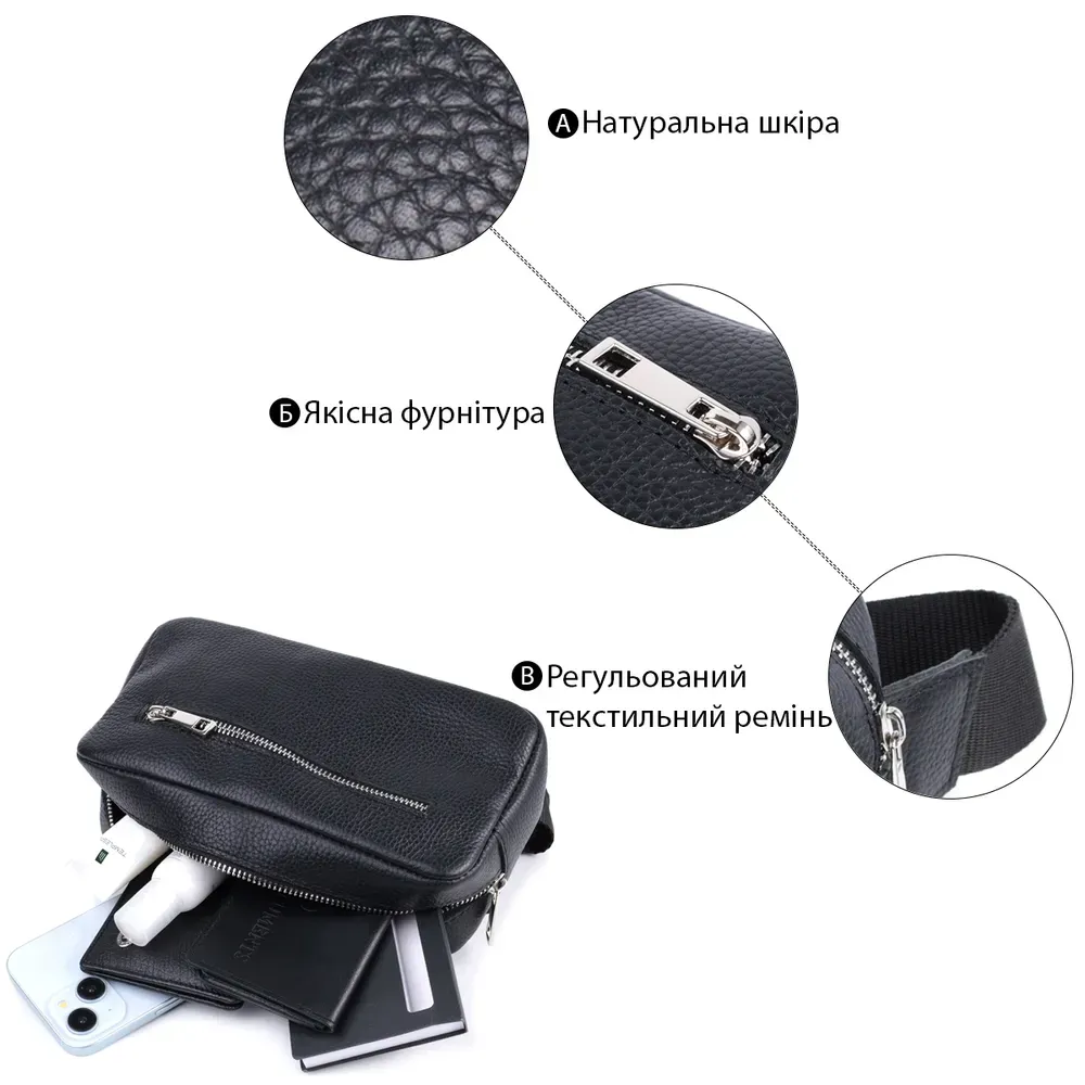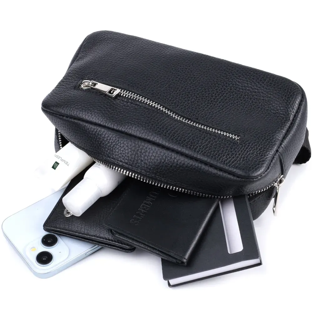Стильна чоловіча сумка з натуральної зернистої шкіри високої якості. Бананка – одна із найпопулярніших моделей серед наших клієнтів. Внутрішні відділення дозволяють зберігати невеликі предмети повсякденного використання в межах досяжності руки, такі як ключі, окуляри, мобільний телефон, візитниця, картхолдер та особисті речі. Тримайте свої цінні речі під рукою, зберігаючи модний вигляд. У сумці використана якісна фурнітура, ремінець закривається на фастекс. Такий аксесуар стане чудовим подарунком для близької людини.