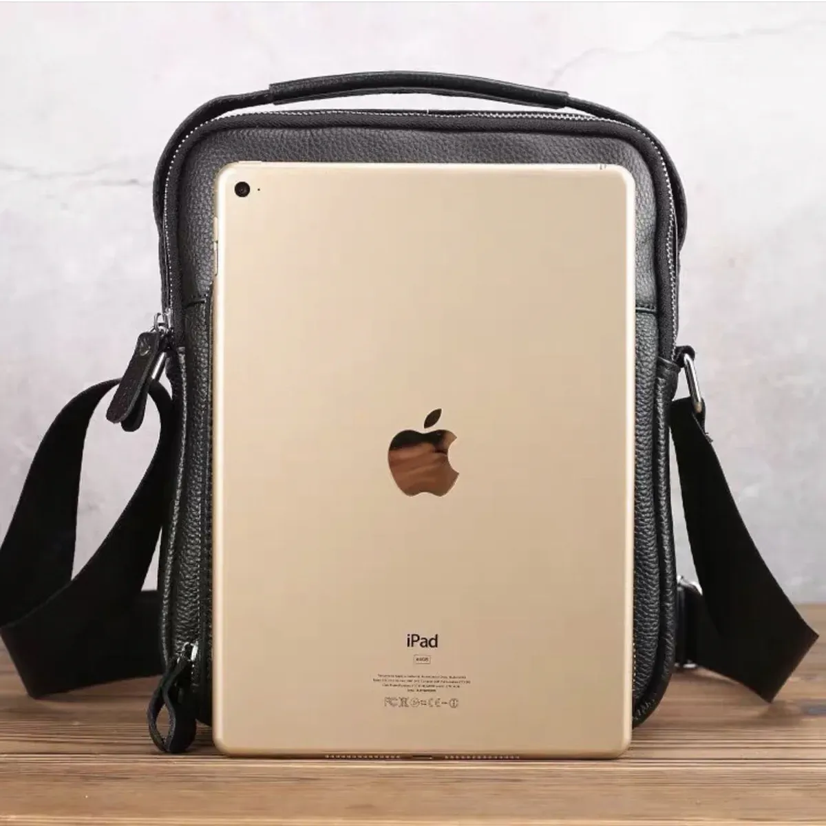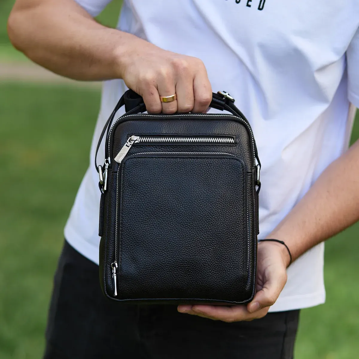 Чоловічий месенджер Tiding Bag виготовлений з натуральної телячої шкіри. Аристократичний чорний колір підкреслює статусність власника. Лаконічний дизайн дозволяє використовувати аксесуар із повсякденним та діловим одягом. Для носіння можна використовувати коротку ручку або плечовий ремінь, регульований по довжині. На сумку встановлено надійну металеву фурнітуру.