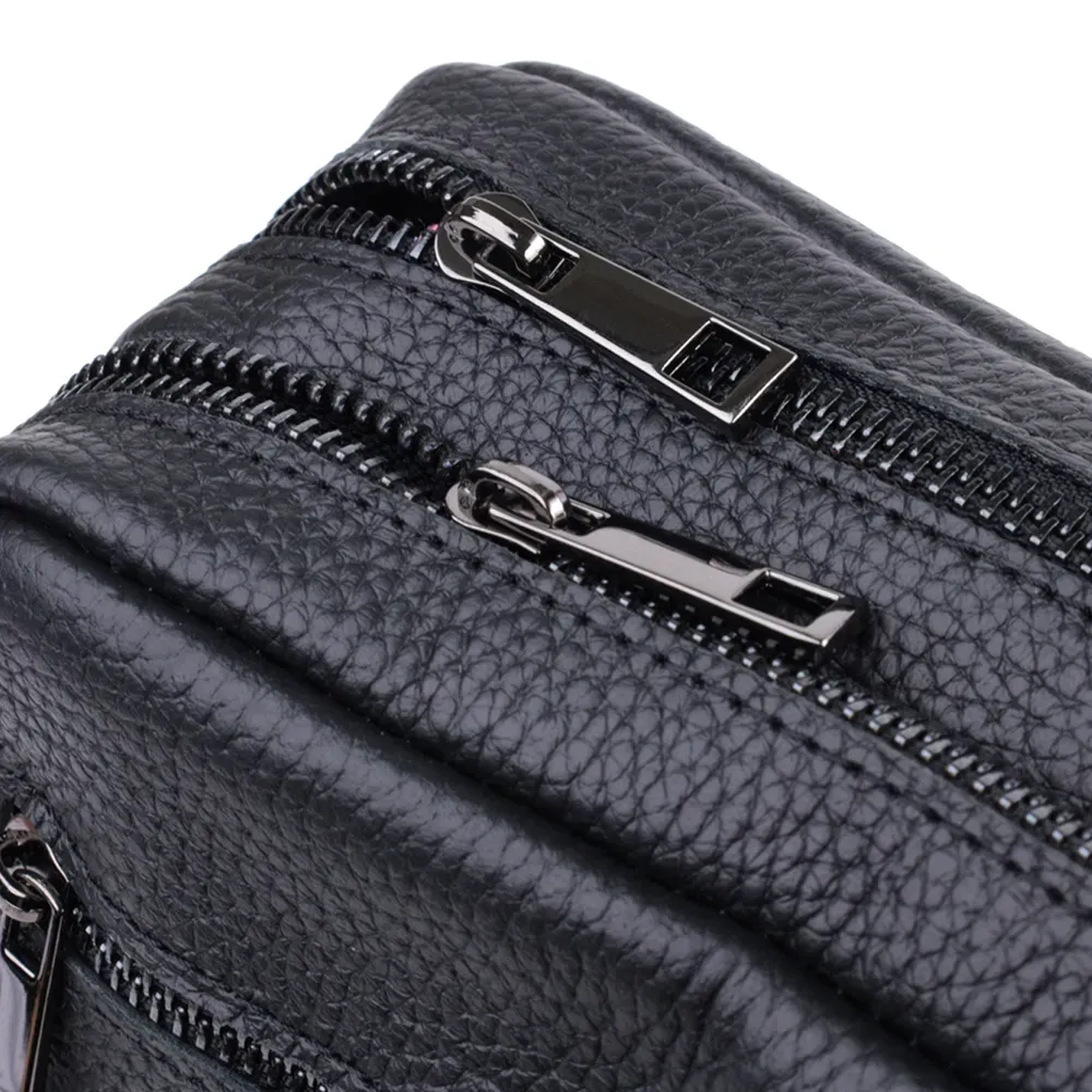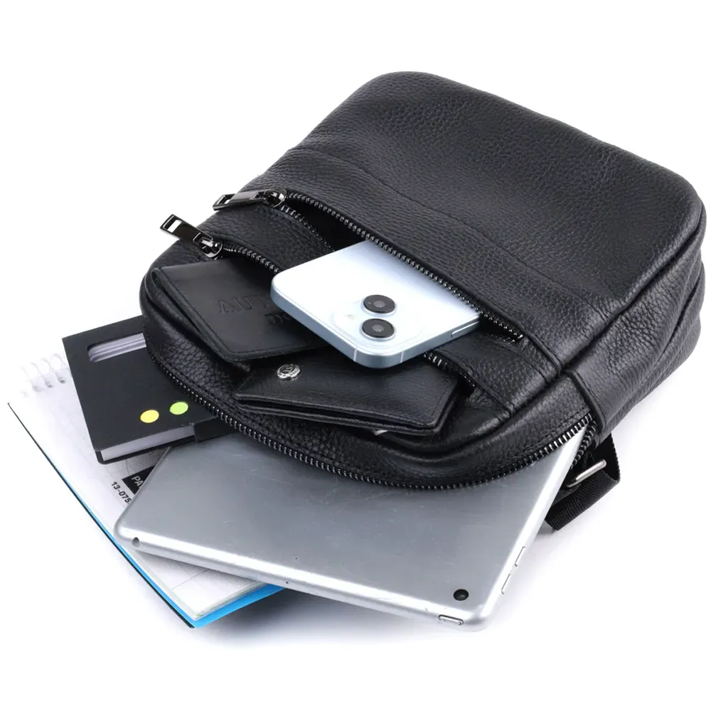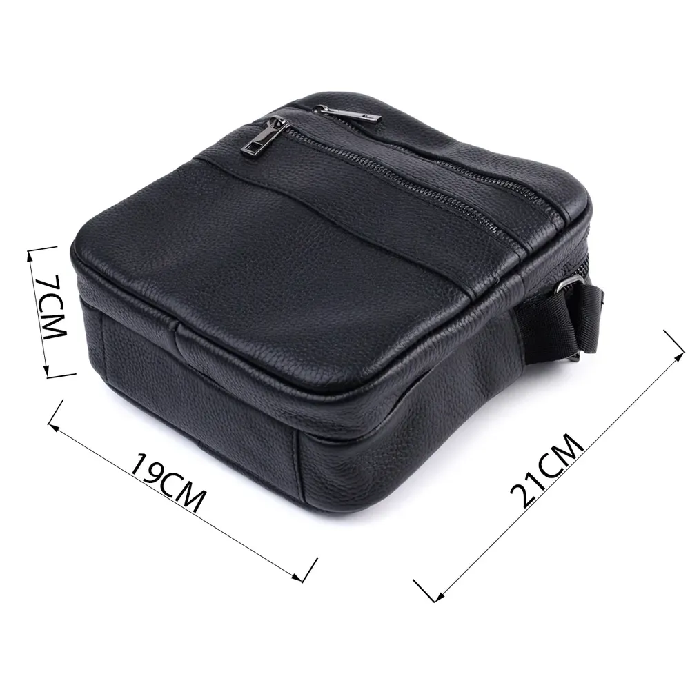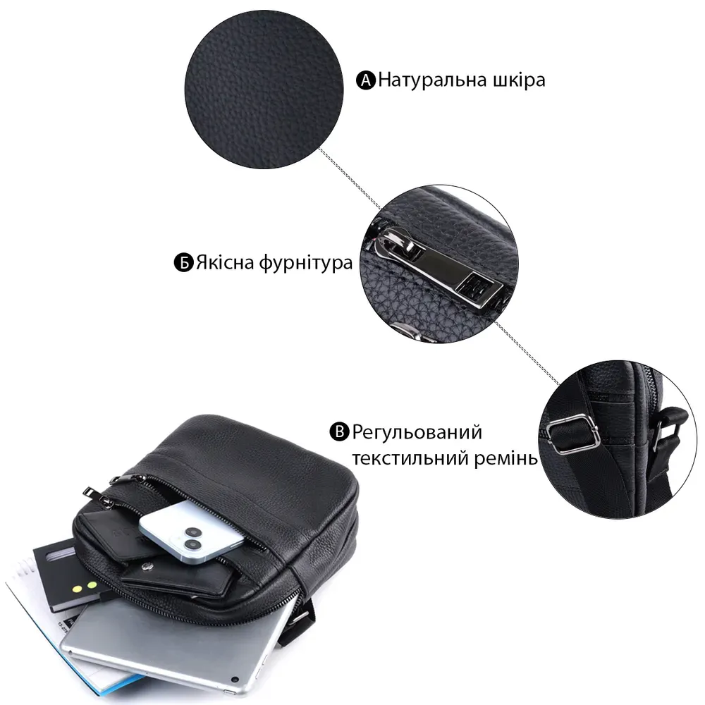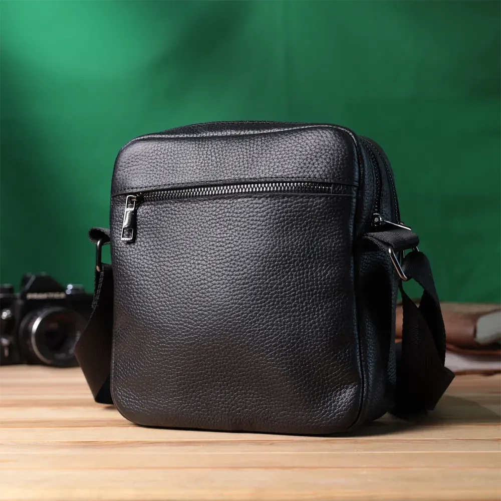 Зручна чоловіча сумка месенджер, з великою кількістю кишень, в яку помістяться всі необхідні речі і навіть міні айпад. Фурнітура металевого кольору - стійка не змінює свій колір у процесі носіння. Чудова чоловіча сумка вертикального формату виготовлена з натуральної зернистої шкіри чорного кольору. Аксесуар чудово поєднується з усіма стилями в одязі та може стати чудовим подарунком на будь-яке свято.