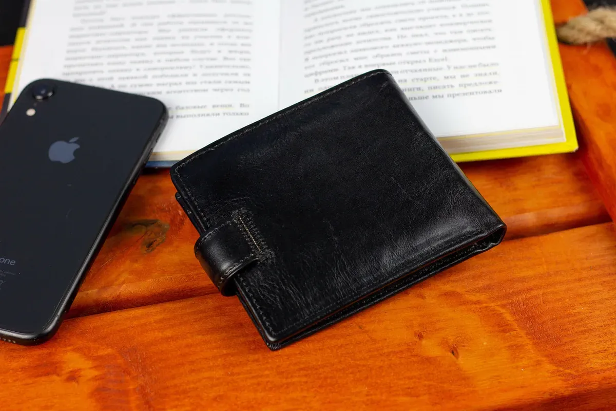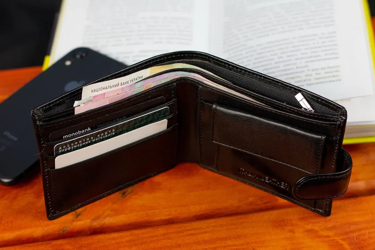 Безпрограшним варіантом для зберігання особистих коштів є шкіряний гаманець із безліччю відсіків та секцій. Для банкнот відведено 3 відділення, одне з них на блискавці - саме так зручно тримати запас грошей. Документи можна покласти у 2 приховані кармани, подалі від цікавих очей. У чоловічому гаманці також знайдеться місце для монет - компактна кишеня з кнопкою всередині аксесуара.