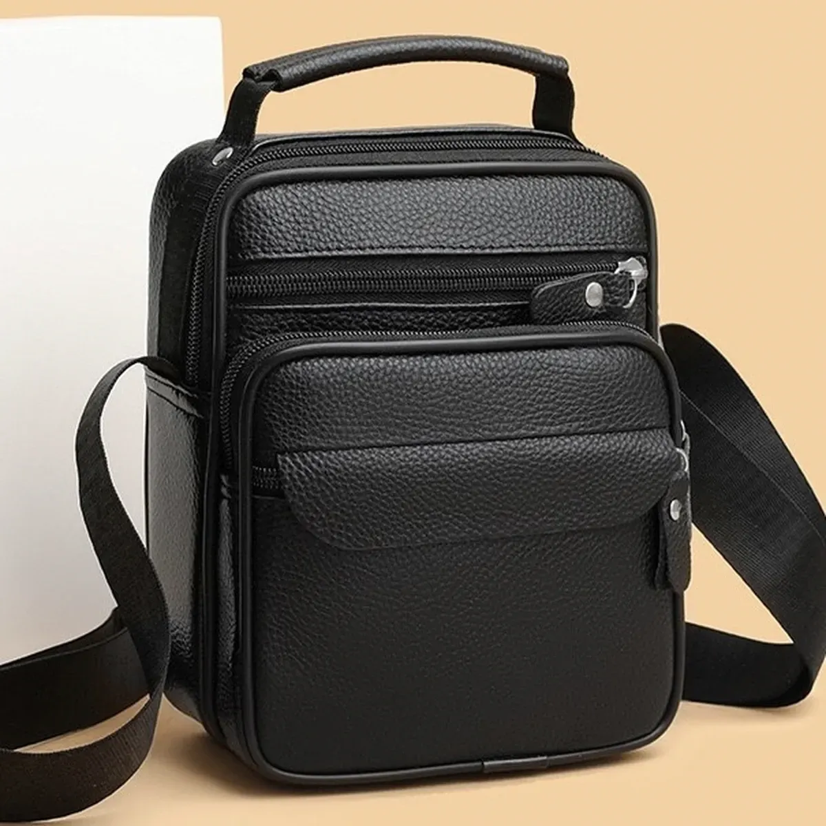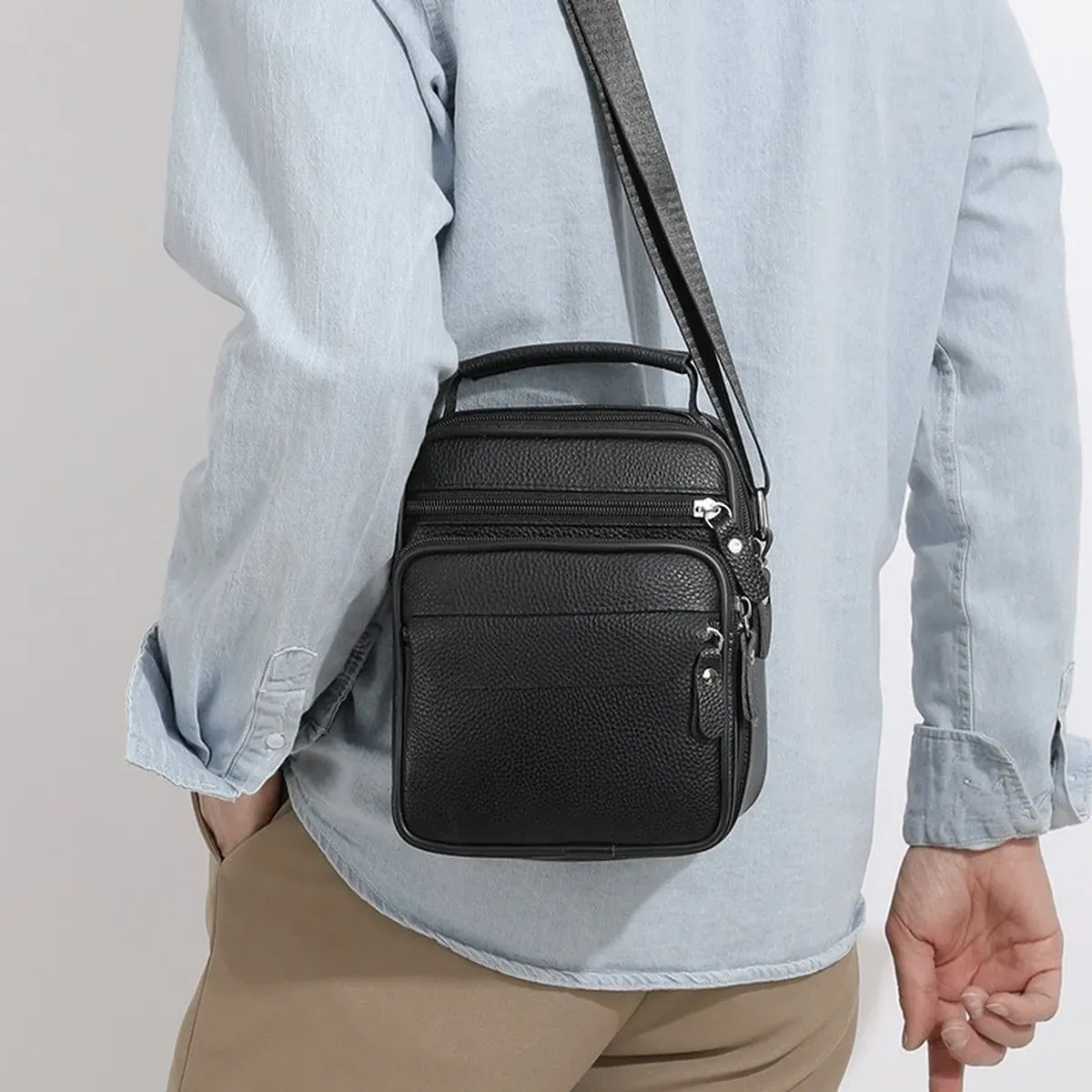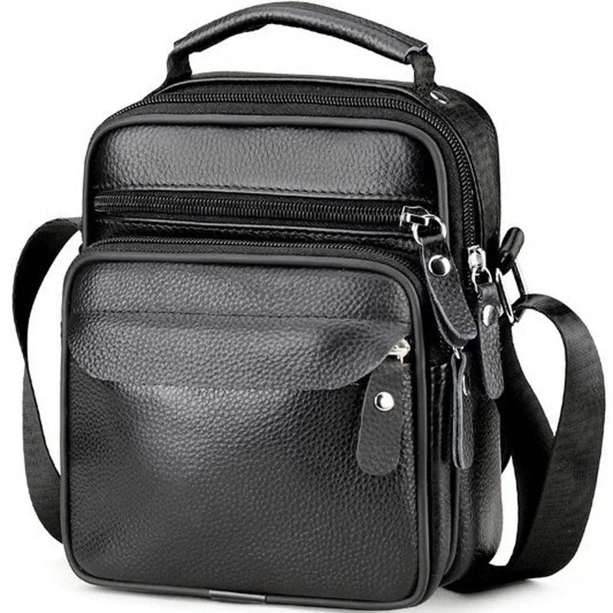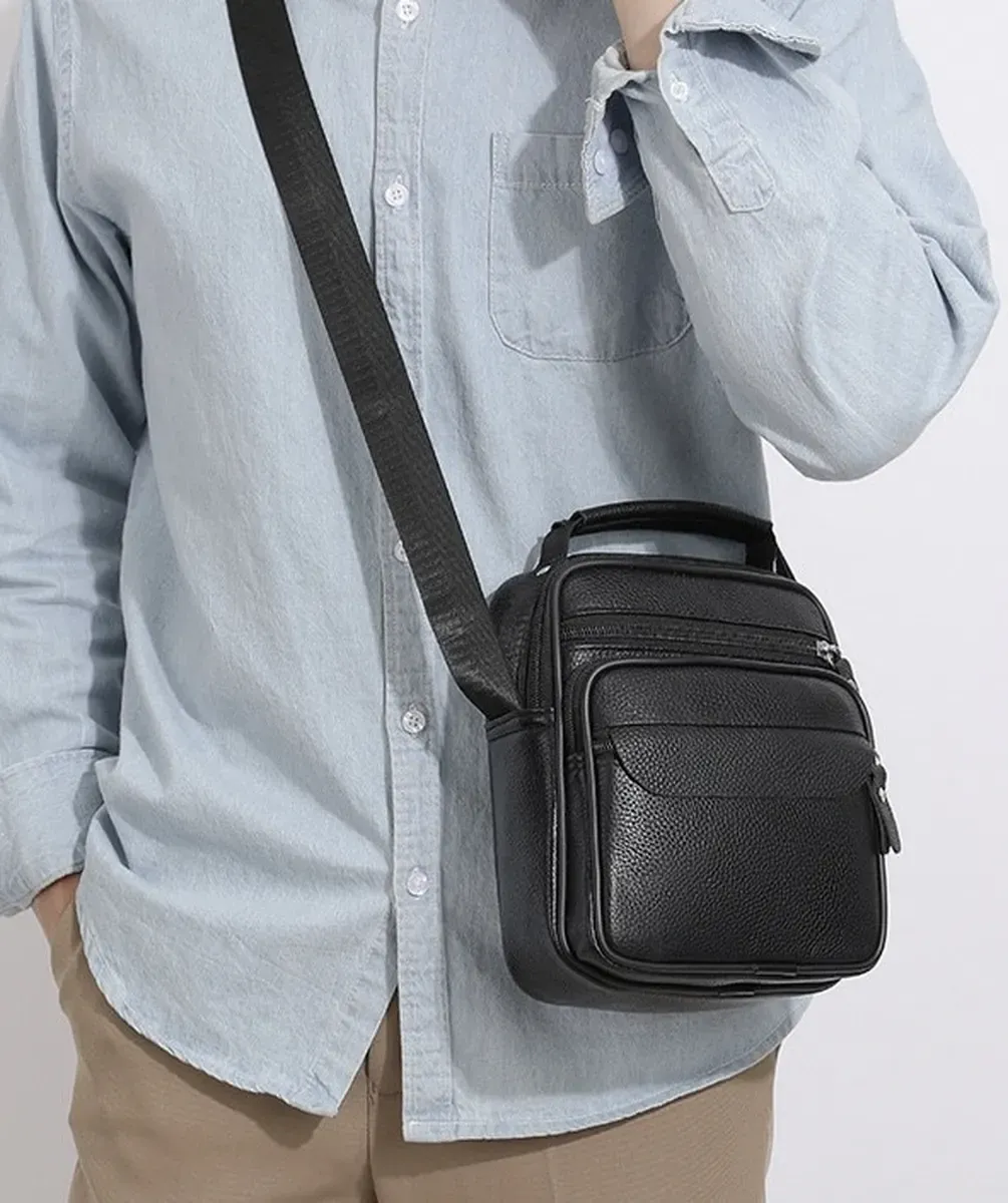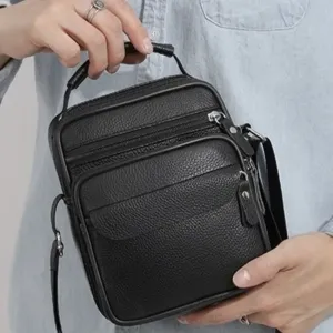 Чоловічий месенджер із натуральної шкіри, має насичений чорний колір і чудову металеву фурнітуру. Також модель обладнана довгим текстильним ременем, який регулюється за довжиною та м'якою шкіряною ручкою. Шкіряна чоловіча сумка з ручкою має два автономні відділення, які застібаються за допомогою блискавок. На тильній стороні сумки розташована одна кишеня на блискавці. На своїй лицьовій частині сумки розміщені: одна досить містка кишеня і дві додаткові допоміжні, які так само закриваються за допомогою блискавок.