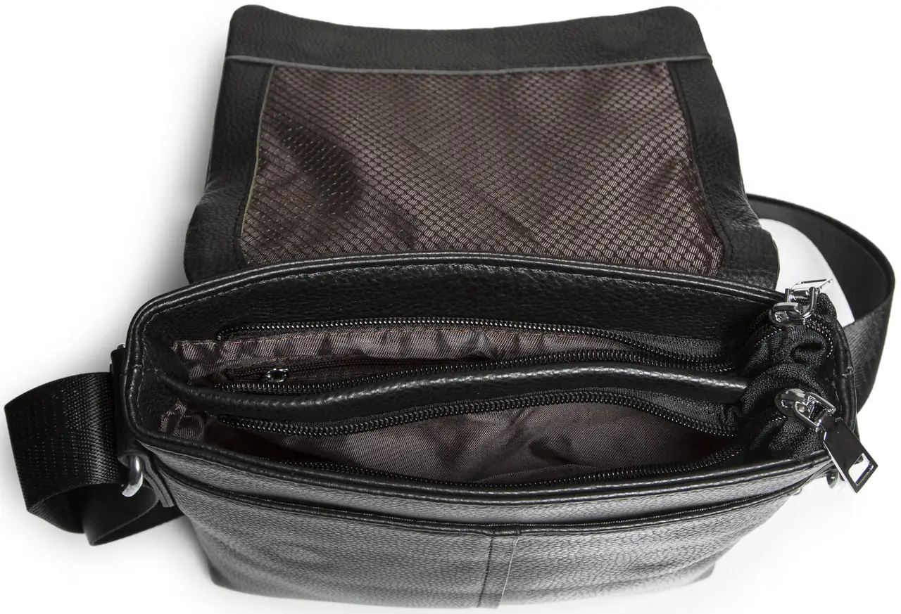 Чоловіча шкіряна сумка через плече (месенджер) є дуже потрібним та практичним аксесуаром для сучасного чоловіка. Ця сумка стильно виглядає, якісно зроблена та гармонійно підійде до будь-якого стилю, а завдяки своїй формі зручна у використанні. Сумка закривається на перекидний клапан, під яким знаходяться два основні відділення, що закриваються на блискавку. Усередині сумки додатково є бічна кишеня на блискавці та дві відкриті кишені для дрібниць. Ззовні під клапаном розміщена глибока відкрита кишеня, а з тильного боку - врізна кишеня на блискавці. Підкладка сумки – текстиль. Колір фурнітури – срібло. Має текстильний регульований ремінь.