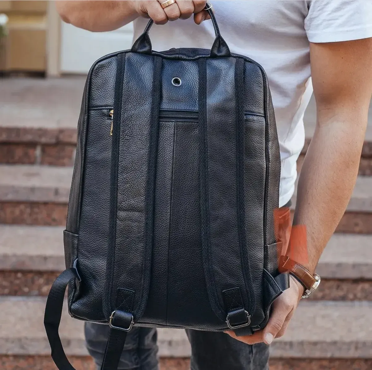 Стильний рюкзак із якісної натуральної шкіри. Дуже практичний та вмістовний. Ззовні на лицьовій стороні рюкзака розташована функціональна кишеня. Основне відділення велике. Фурнітура якісна. Модель універсальна, підійде як чоловікам, так і жінкам.