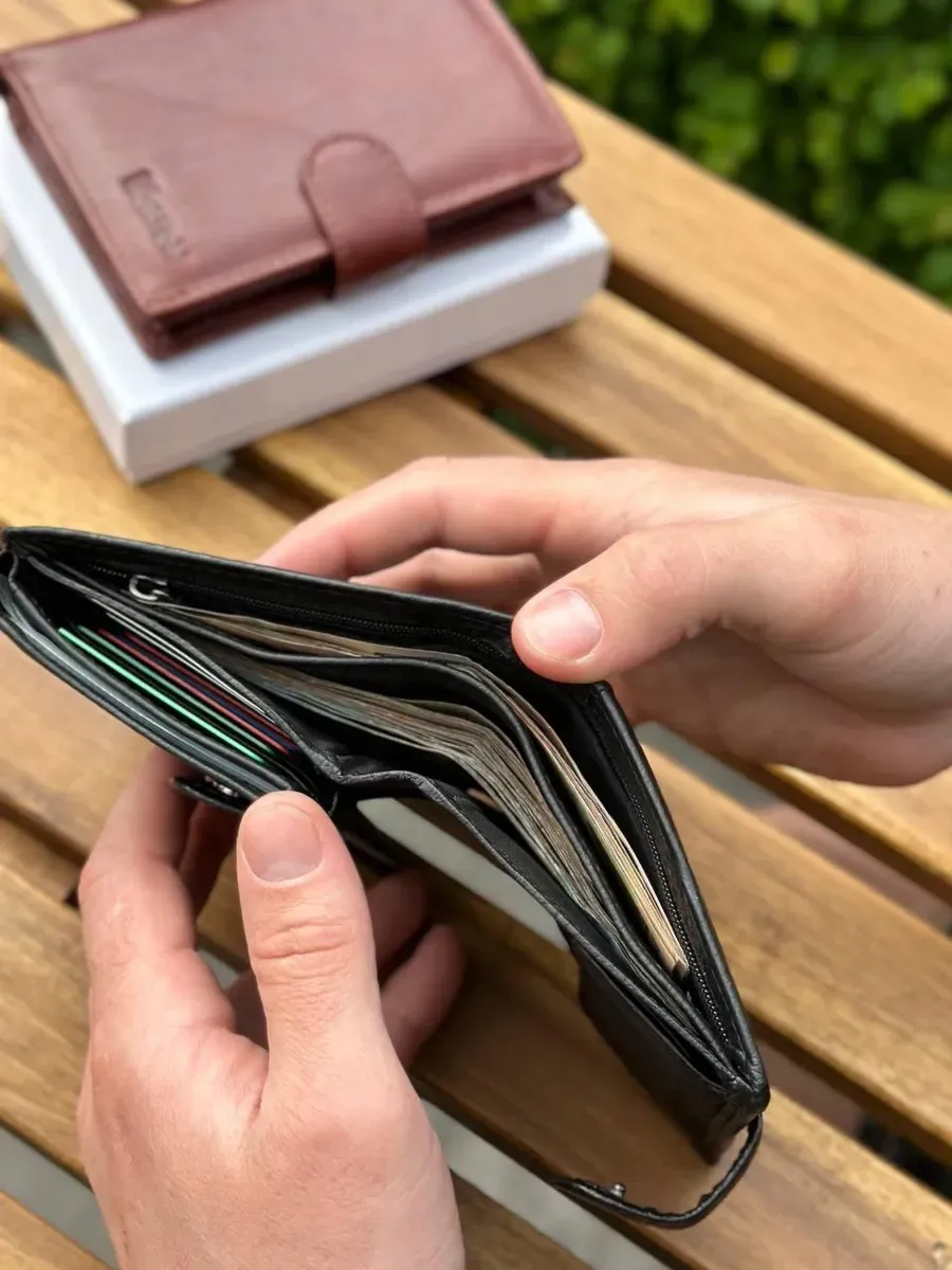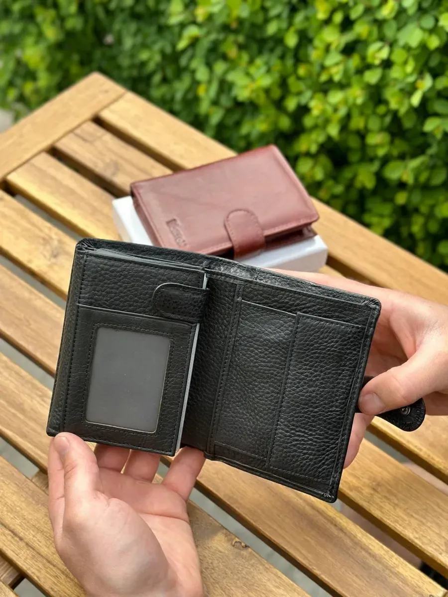 Чоловіче портмоне у вигляді книжечки виконане у класичному стилі. У ньому є не лише 2 відділення для купюр, а й об'ємний блок для документів, де можна розмістити права водія і техпаспорт на автомобіль. Прилеглі кишені можна використовувати для зберігання грошей на "чорний день". У шкіряному гаманці також є місце для восьми банківських карток та відділення для паспорта. Монети зручно носити у кишені на кнопці.
