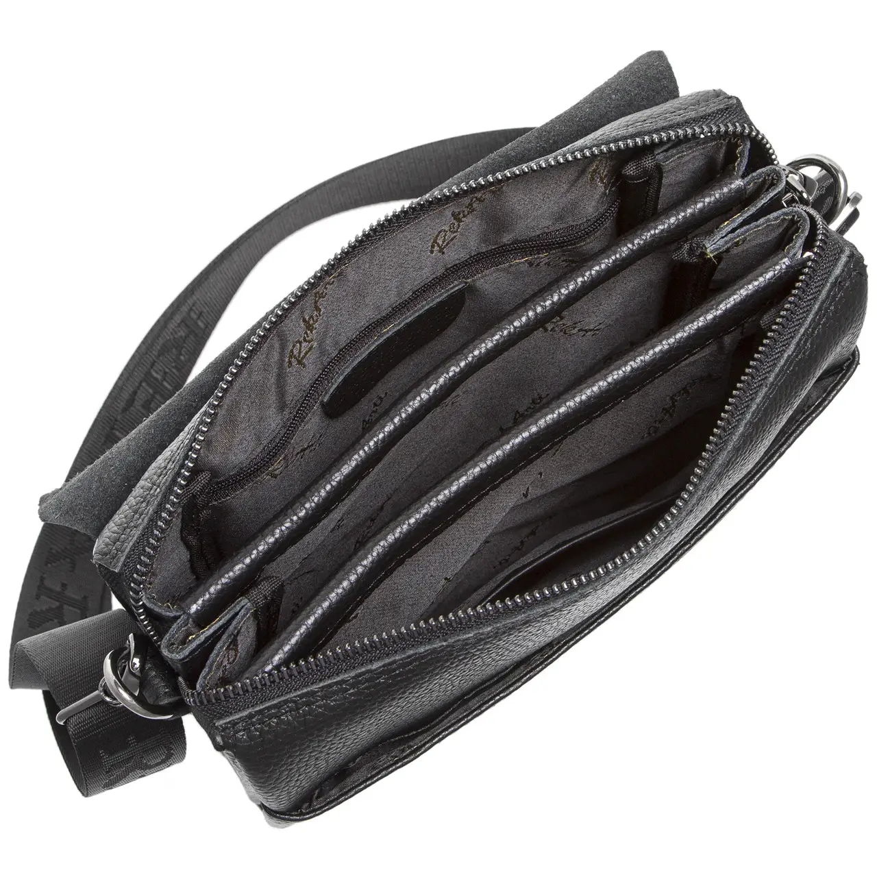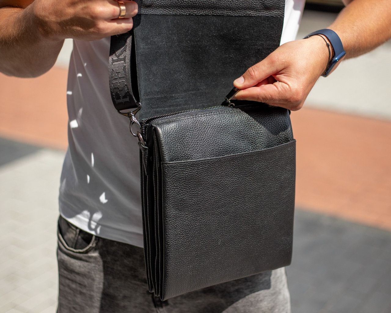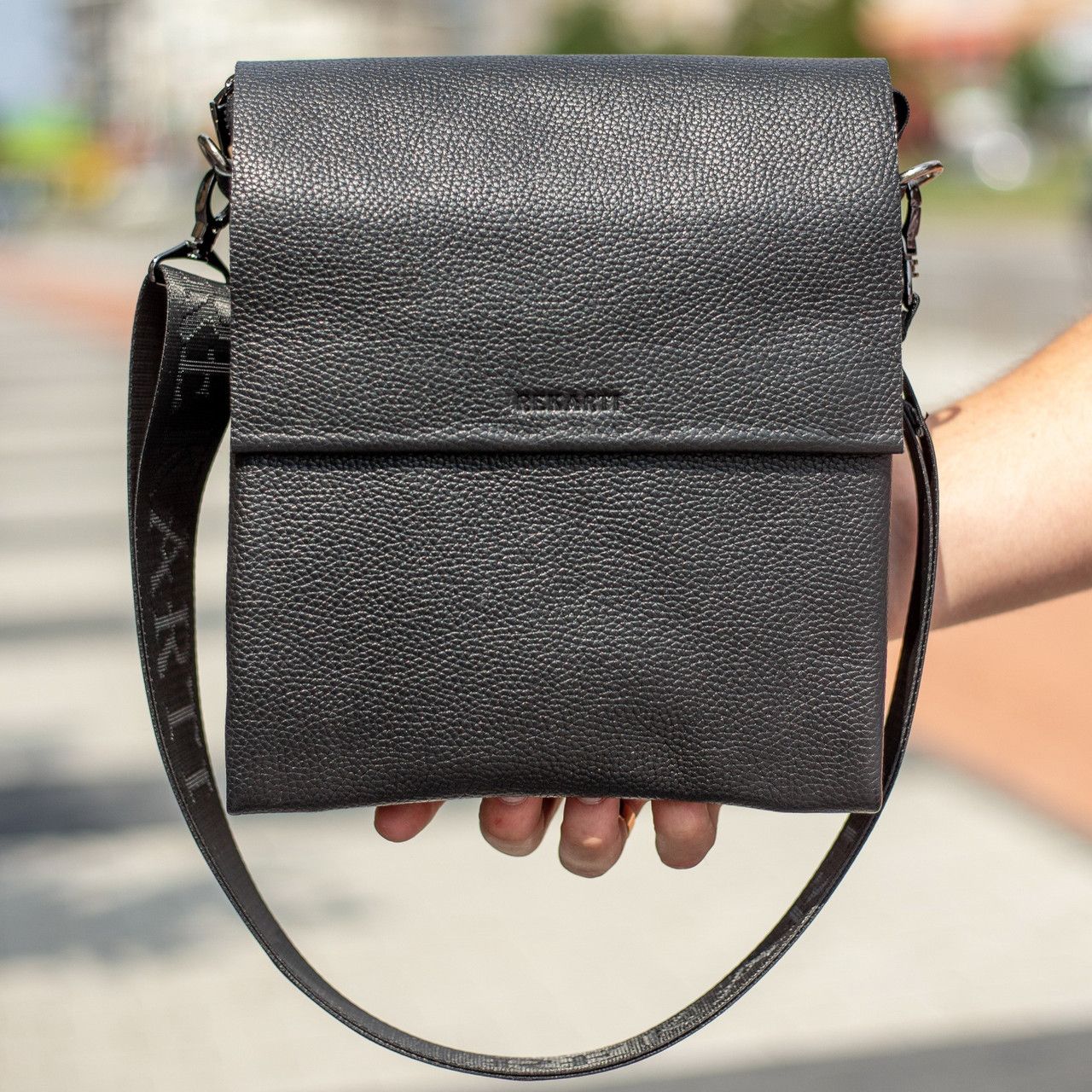 Стильна чоловіча сумка через плече, виготовлена з високоякісної натуральної шкіри. Під накидкою розміщене одне основне відділення, у якому розміщена потайна кишеня на блискавці, а також кишеня відкритого типу. Сумка має два додаткові відділення: одне з лицьової частини (під накидкою, без застібки) й одне з тильної частини (на блискавці). Відділення застібаються за допомогою якісної фурнітури. Ремінець сумки щільний, регульований, незнімний.