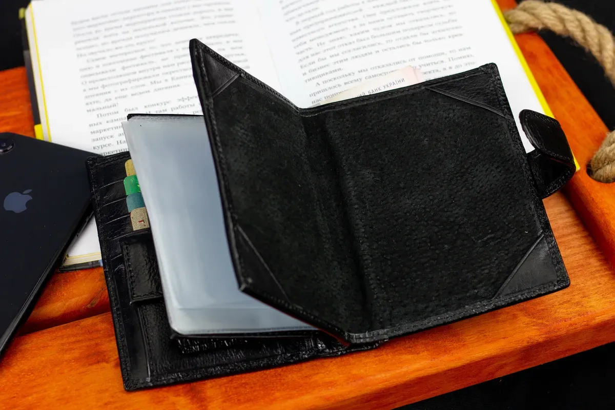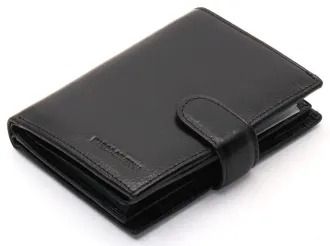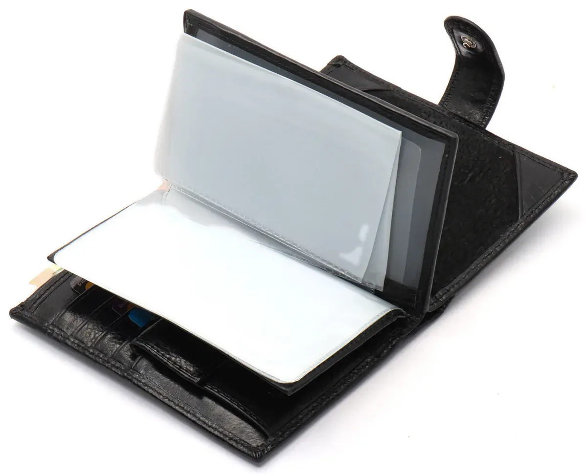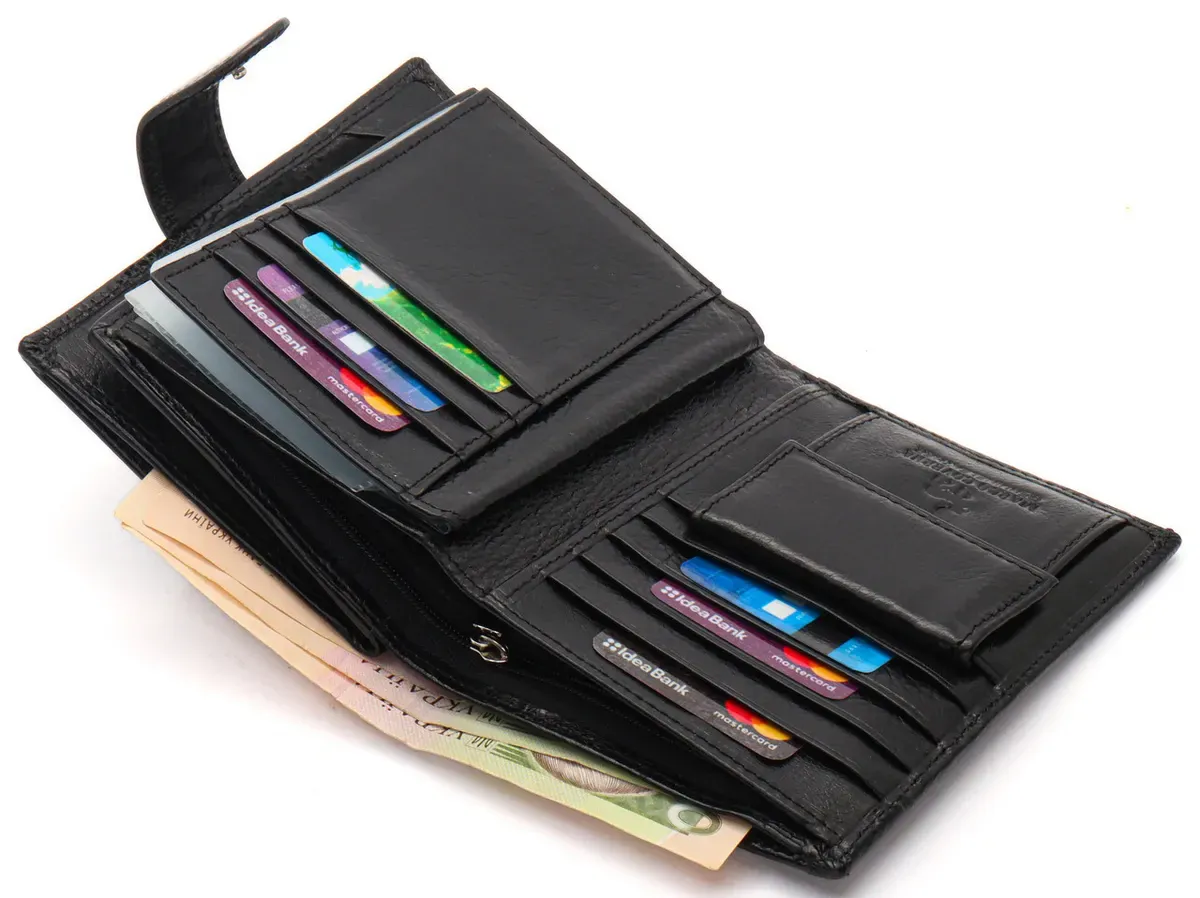 Чоловіче портмоне у вигляді книжечки виконане у класичному стилі. У ньому є не лише 3 відділення для купюр, а й об'ємний блок для документів, де можна розмістити права водія і техпаспорт на автомобіль. Прилеглі кишені можна використовувати для зберігання грошей на "чорний день". У шкіряному гаманці також є місце для восьми банківських карток та відділення для паспорта. Монети зручно носити у кишені на кнопці.