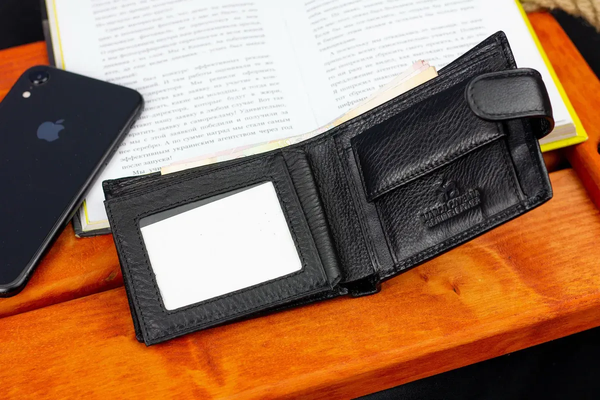 Зручний чоловічий гаманець в одне складання виконаний з фактурної шкіри високої якості. Матеріал не стирається та не псується при постійному використанні. Для банкнот відведено 3 вмістовні відділення. Одна кишеня закривається на блискавку, що дає змогу відкласти певну суму грошей. Монетниця на кнопці досить велика, тому в ній поміститься достатньо монет. Квитанції, записки та інші папірці зручно зберігати у двох прилеглих кишенях. Ця модель чоловічого гаманця виконана на кшталт книжечки. У 3 секції можна покласти банківські картки, а в прозорих — права водія, пропуск або фото.