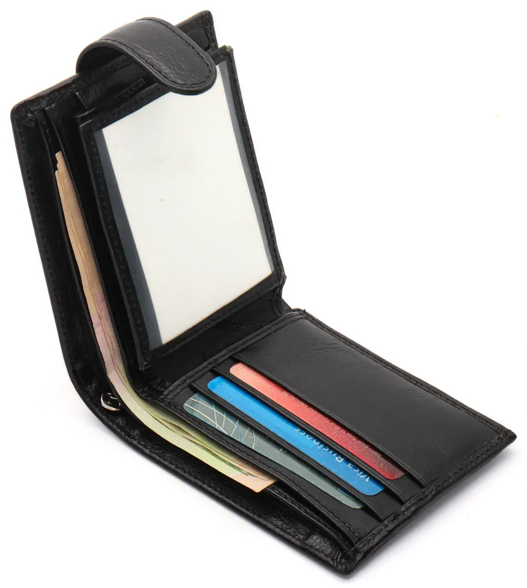 Чоловіче портмоне у класичному стилі підійде діловим людям. Модель оснащена двома прозорими віконцями для документів. Виріб фіксується кнопкою на хлястику, тому його зручно відкривати та швидко показувати перепустку або посвідчення. Для грошей відведено 3 великі відділення та вмістовна монетниця на кнопці. Три секції під картки розташовані у зручному місці та завжди під рукою. Дві прилеглі кишені допоможуть сховати гроші у надійному місці.
