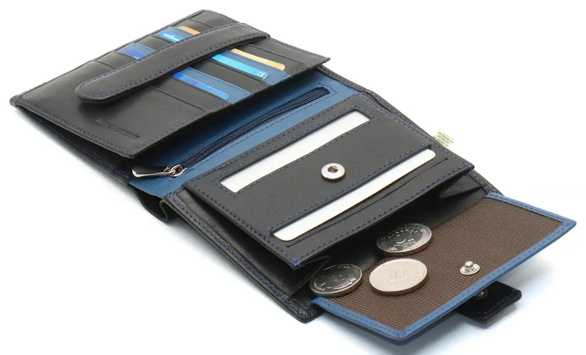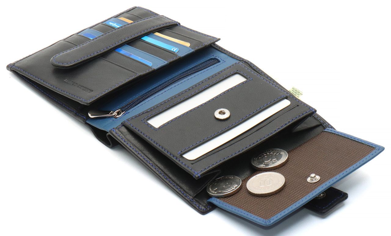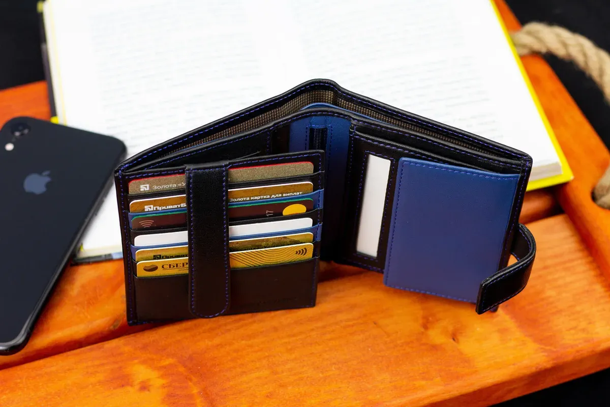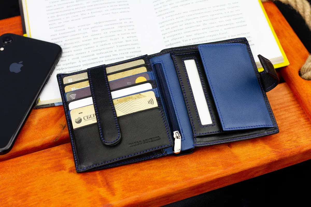 Чоловічий гаманець ідеально підійде тим, хто хоче мати все й одразу. Для цього у виробі передбачено два вмістовні відділення під банкноти, габаритну монетницю та блок для карток. Оригінальний дизайн моделі дозволяє швидко відкривати аксесуар. До того ж у цьому чоловічому шкіряному гаманці є фіксатор, який тримає блок для дев'яти банківських карток. Документи зручно носити у прозорій кишені. По центру розташована врізна кишеня на блискавці, призначена для особливо цінних речей.