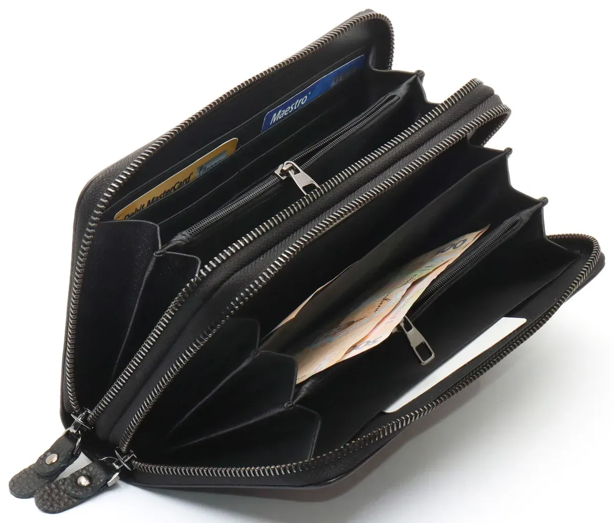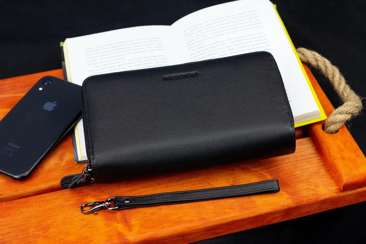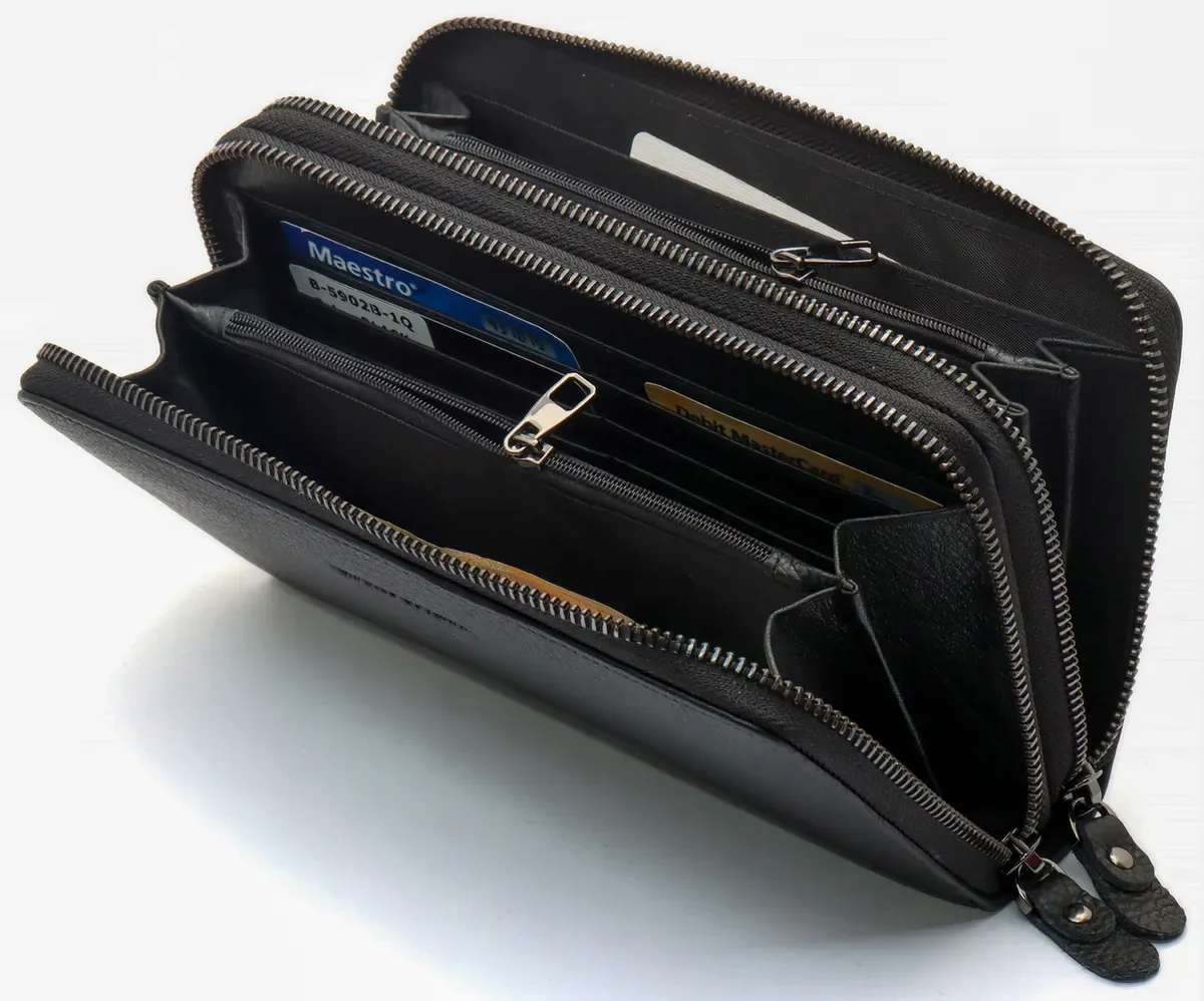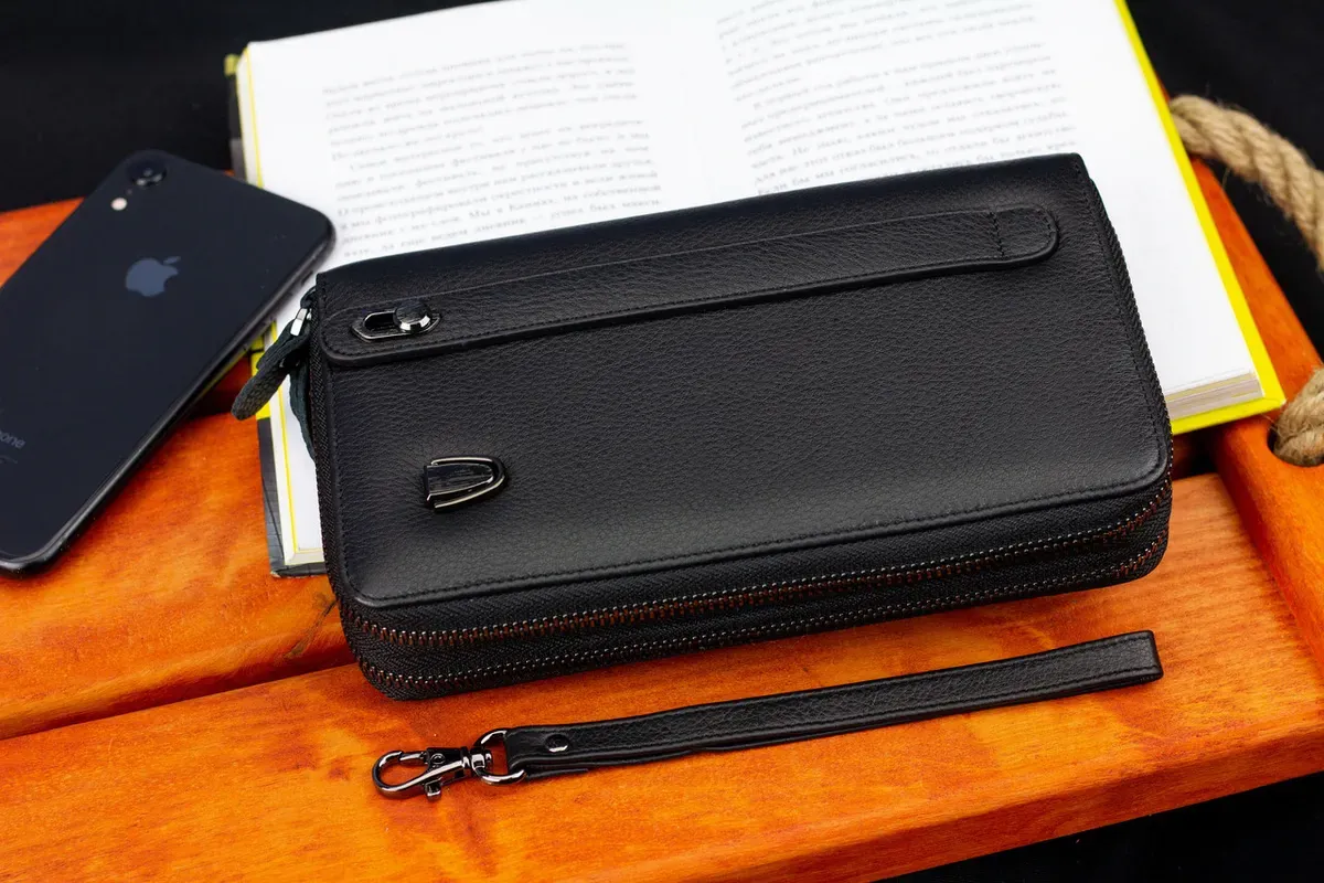 Чоловічий гаманець з натуральної шкіри підійде тим, хто цінує і стиль, і практичність. Модель має два окремі відділення на блискавці. Як в одному, так і в другому зручно тримати банкноти, а також розподіляти їх за номіналом. Додаткові суми (або чеки) можна відкладати у прилеглих кишенях. Для монет підходять кишені на блискавці, що служать перегородками. Кредитні картки в цьому шкіряному гаманці зберігаються в окремому блоці, що складається з 18 секцій. До того ж там є фіксатор для ручки. Завдяки двом ременям (на долоню та зап'ястя) аксесуар перетворюється або в портмоне, або в клатч.