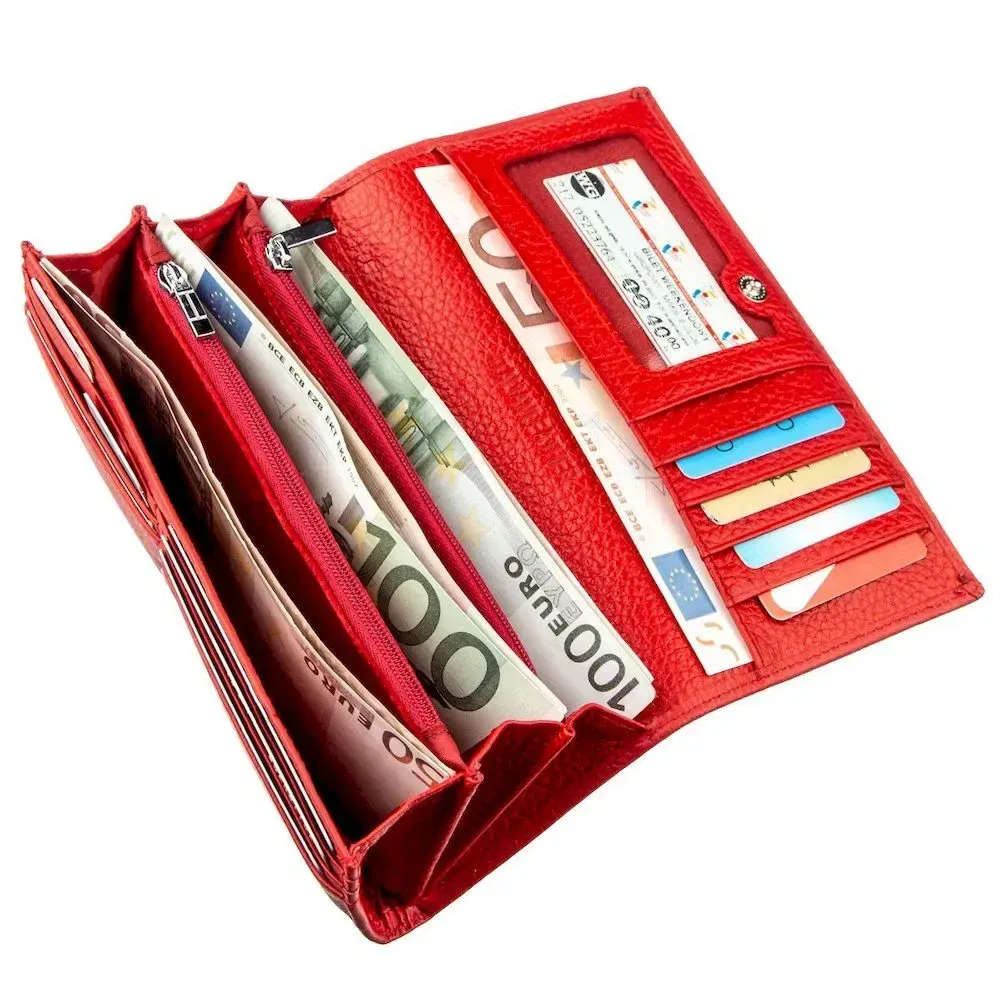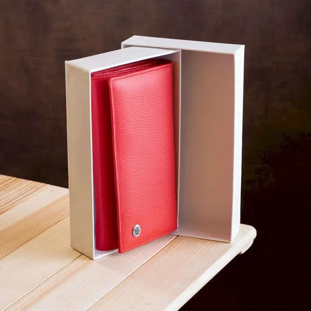 Чудовий жіночий гаманець яскравого червоного кольору для стильних і впевнених у собі дам. Виконаний із високоякісної натуральної шкіри, має матовий відтінок та зернисту фактуру. Наповнений гаманець функціональними та практичними відділеннями та кишенями для карток та візиток. Для зручності відділення для монет та іншої дрібниці розташоване на тильній стороні гаманця. Ця чудова обновка стане для Вас справжньою знахідкою на довгий час. Також цей гаманець безперечно стане ідеальним подарунком для близької людини на якесь свято. Запакований аксесуар у білу фірмову коробку із щільного картону.