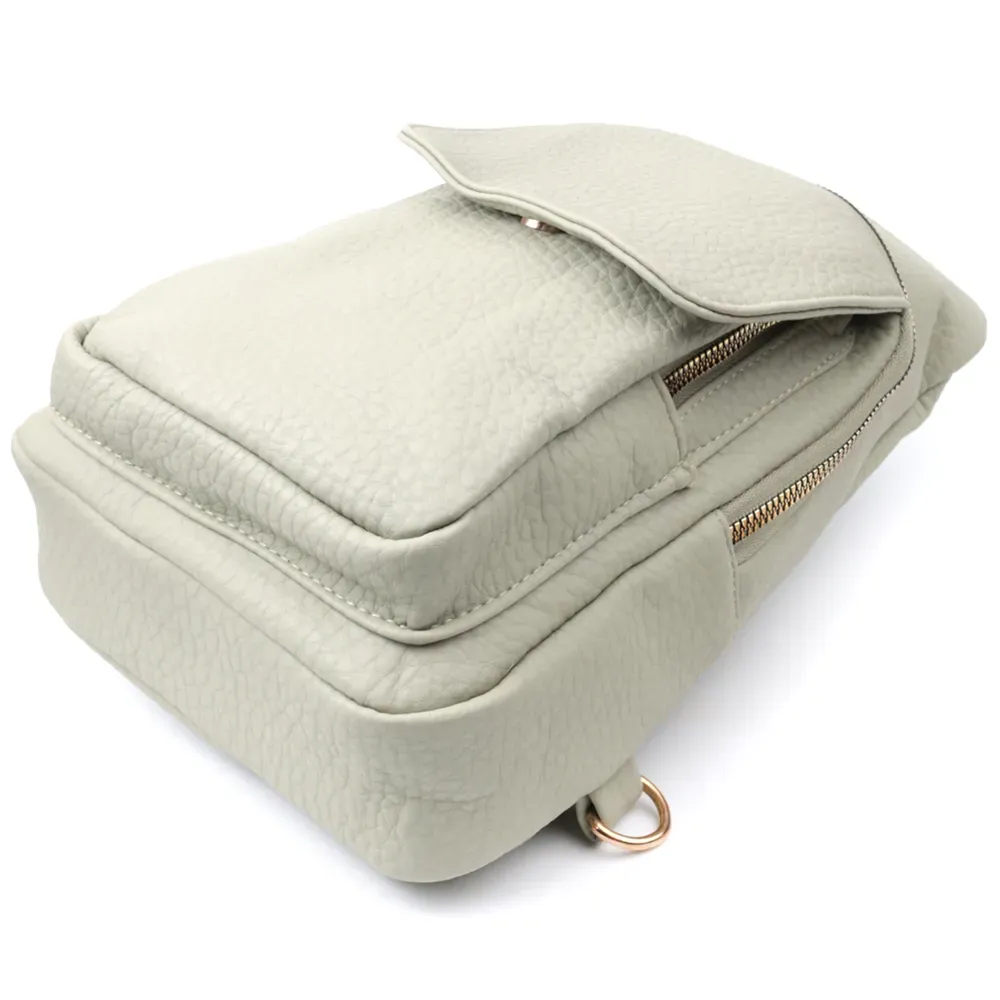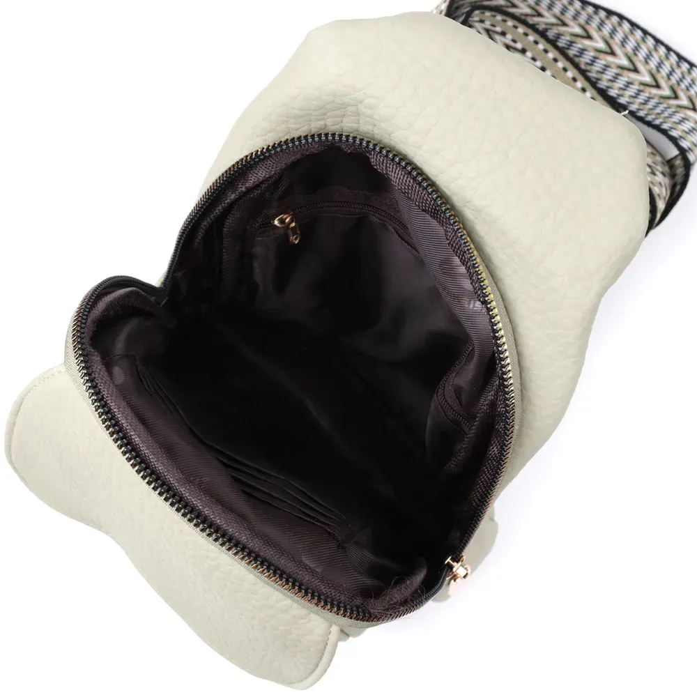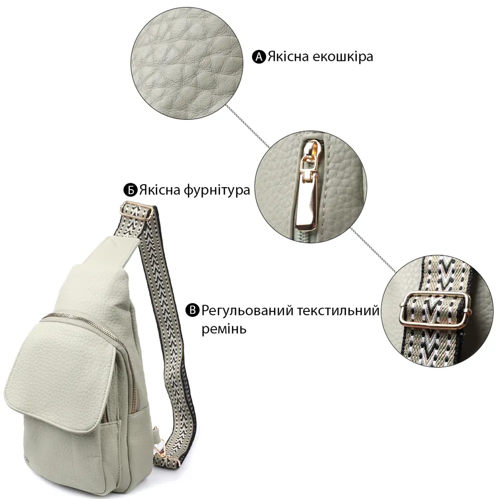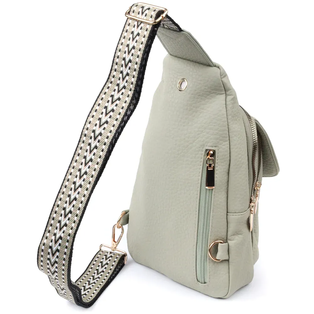 Модна жіноча слінг сумка з зернистої екошкіри в унікальному кольорі фісташки. Ця модель складається з одного основного відділення, яке закривається на блискавку і в якому знаходиться кишеня на блискавці і чотири кишені для кредитних карток усередині, а також двох кишень зовні та одного отвору для кабелю або навушників, що дуже зручно в сучасному світі. Акцентом даної моделі є зручний регульований плечовий ремінець у етнічному стилі, що дуже модно вже кілька сезонів. Екошкіра - високоякісна альтернатива натуральному матеріалу, яка дуже стійка до тертя, до низьких температур, відмінно носиться на відміну від інших штучних матеріалів, а також має гіпоалергенний склад на відміну від натуральної шкіри.