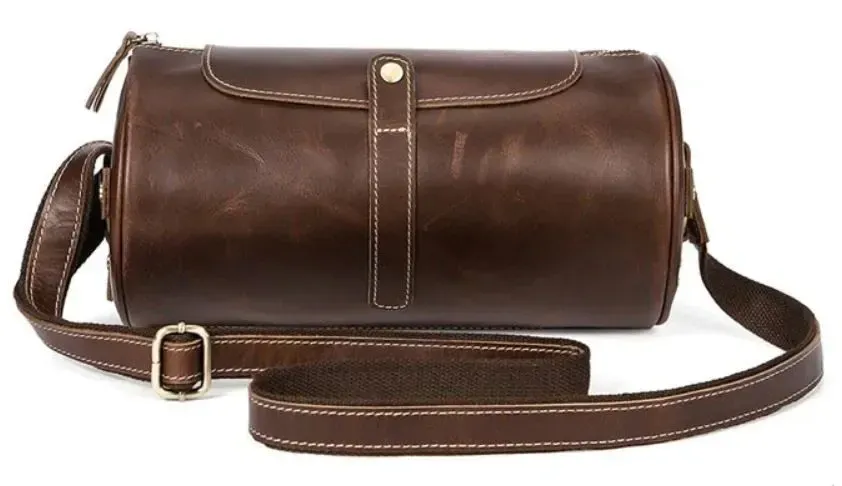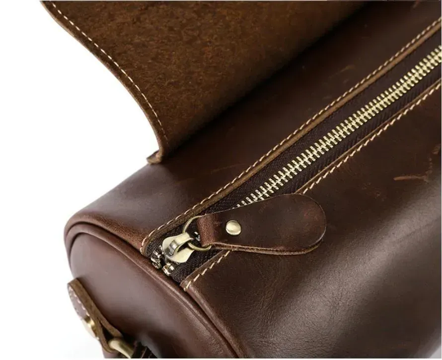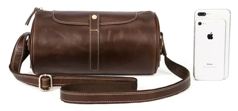 Оригінальна чоловіча сумка закругленої форми. З такою сумкою ви точно виділитеся з натовпу. Сумка прошита по периметру світлою ниткою. Фурнітура, яка використовується у моделі золотистого кольору. Сумка виготовлена із натуральної шкіри високої якості. Хороший варіант для подорожей. Все найважливіше ви легко помістите до цієї сумки. Модель упакована в тканинний мішок, що захищає її від пилу та зручно при зберіганні. Відмінний варіант для подарунка будь-якому чоловікові.