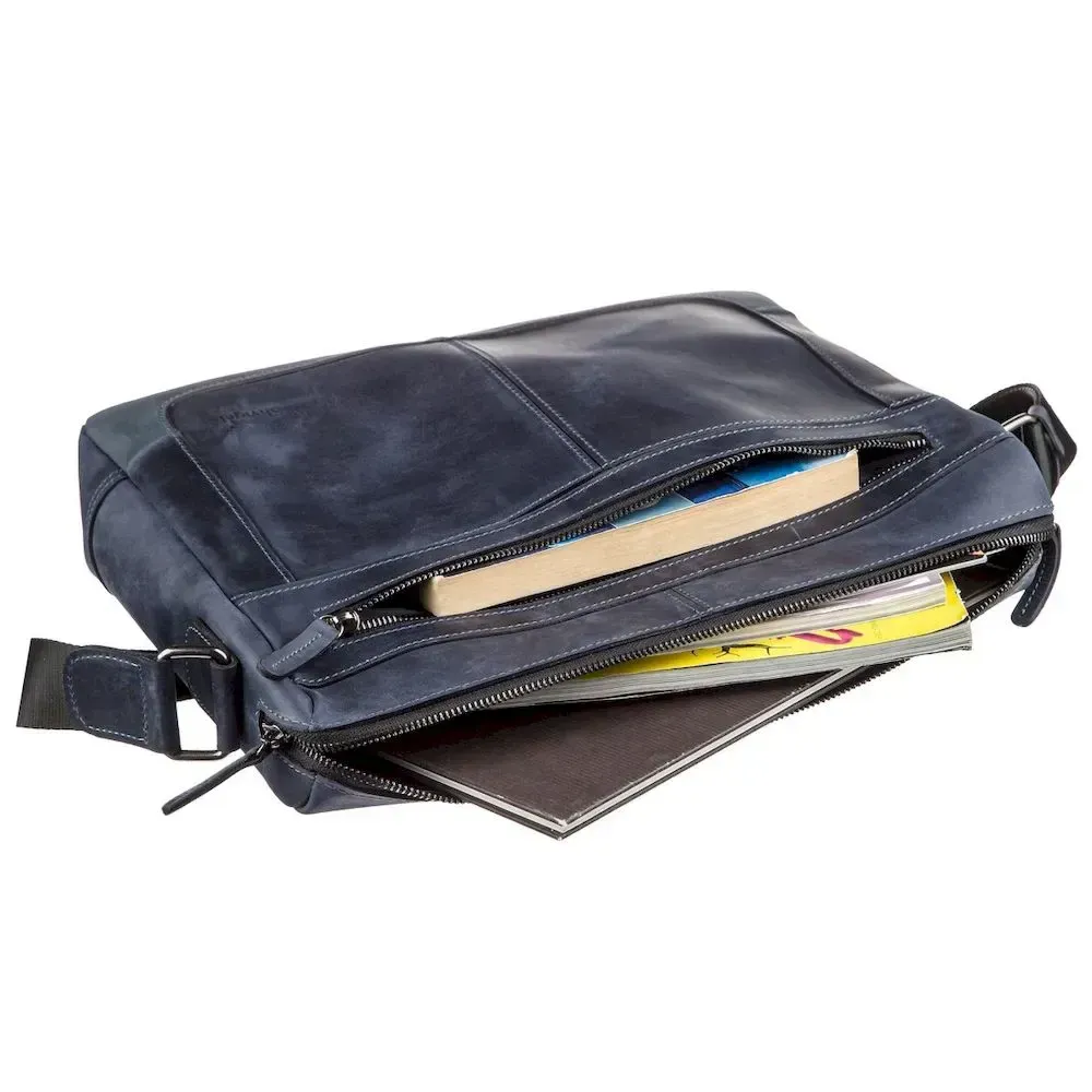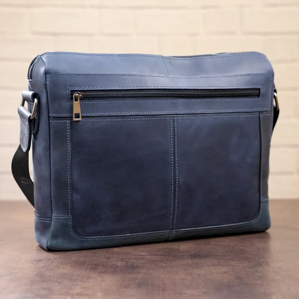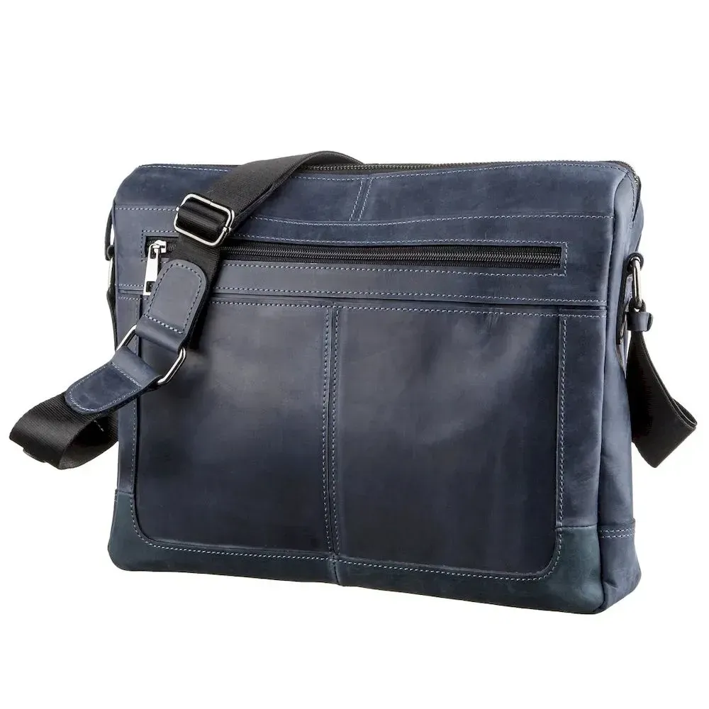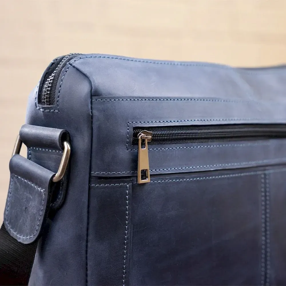 Ділова сумка з натуральної шкіри високої якості. Виріб популярного та оригінального синього кольору. Урожай шкіри виглядає дуже дорого і стильно. Дизайн сумки продуманий до дрібниць. Ви можете носити сумку на плечі. Всередині виробу якісна текстильна підкладка. Ручка сумки не знімається. На лицьовій та тильній стороні аксесуара кишені на блискавці. Модель упакована в тканинний мішок.